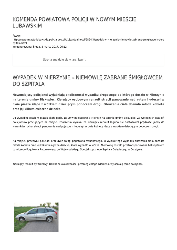 KOMENDA POWIATOWA POLICJI W NOWYM MIEŚCIE LUBAWSKIM Źródło: http://nowe-miasto-lubawskie.policja.gov.pl/o13/aktualnosci/9894,Wypadek-w-Mierzynie-niemowle-zabrane-smiglowcem-do-s zpitala.html Wygenerowano: Środa, 8 marca 2017, 06:12 Strona znajduje się w archiwum. WYPADEK W MIERZYNIE – NIEMOWLĘ ZABRANE ŚMIGŁOWCEM DO SZPITALA Nowomiejscy policjanci wyjaśniają okoliczności wypadku drogowego do którego doszło w Mierzynie na terenie gminy Biskupiec. Kierujący osobowym renault stracił panowanie nad autem i uderzył w dwie piesze idące z wózkiem dziecięcym poboczem drogi. Obrażenia ciała doznała młoda kobieta oraz jej kilkumiesięczne dziecko. Do wypadku doszło w piątek około godz. 18:00 w miejscowości Mierzyn na terenie gminy Biskupiec. Ze wstępnych ustaleń policjantów pracujących na miejscu zdarzenia wynika, że kierujący renault laguna nie dostosował prędkości jazdy do warunków ruchu, stracił panowanie nad pojazdem i uderzył w dwie kobiety idące z wozkiem dziecięcym poboczem drogi. Na miejscu pracowali policjani oraz dwie załogi pogotowia ratunkowego. W wyniku tego wypadku obrażenia ciała doznała młoda kobieta oraz jej kilkumiesięczne dziecko, które wypadło w wózka. Niemowlę zostało przetransportowane helikopterem Lotniczego Pogotowia Ratunkowego do Wojewodzkiego Specjalistycznego Szpitala Dziecięcego w Olsztynie. Kierujący renault był trzeźwy. Dokładne okoliczności i przebieg całego zdarzenia wyjaśniają teraz policjanci. Ocena: 3.5/5 (2) Tweetnij