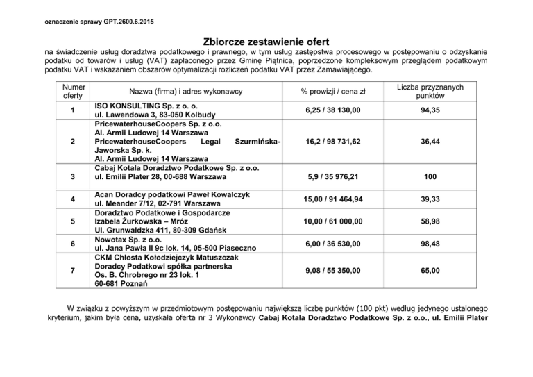 oznaczenie sprawy GPT.2600.6.2015 Zbiorcze zestawienie ofert na świadczenie usług doradztwa podatkowego i prawnego, w tym usług zastępstwa procesowego w postępowaniu o odzyskanie podatku od towarów i usług (VAT) zapłaconego przez Gminę Piątnica, poprzedzone kompleksowym przeglądem podatkowym podatku VAT i wskazaniem obszarów optymalizacji rozliczeń podatku VAT przez Zamawiającego. Numer oferty 1 2 3 4 5 6 7 Nazwa (firma) i adres wykonawcy ISO KONSULTING Sp. z o. o. ul. Lawendowa 3, 83-050 Kolbudy PricewaterhouseCoopers Sp. z o.o. Al. Armii Ludowej 14 Warszawa PricewaterhouseCoopers Legal SzurmińskaJaworska Sp. k. Al. Armii Ludowej 14 Warszawa Cabaj Kotala Doradztwo Podatkowe Sp. z o.o. ul. Emilii Plater 28, 00-688 Warszawa Acan Doradcy podatkowi Paweł Kowalczyk ul. Meander 7/12, 02-791 Warszawa Doradztwo Podatkowe i Gospodarcze Izabela Żurkowska – Mróz Ul. Grunwaldzka 411, 80-309 Gdańsk Nowotax Sp. z o.o. ul. Jana Pawła II 9c lok. 14, 05-500 Piaseczno CKM Chłosta Kołodziejczyk Matuszczak Doradcy Podatkowi spółka partnerska Os. B. Chrobrego nr 23 lok. 1 60-681 Poznań % prowizji / cena zł Liczba przyznanych punktów 6,25 / 38 130,00 94,35 16,2 / 98 731,62 36,44 5,9 / 35 976,21 100 15,00 / 91 464,94 39,33 10,00 / 61 000,00 58,98 6,00 / 36 530,00 98,48 9,08 / 55 350,00 65,00 W związku z powyższym w przedmiotowym postępowaniu największą liczbę punktów (100 pkt) według jedynego ustalonego kryterium, jakim była cena, uzyskała oferta nr 3 Wykonawcy Cabaj Kotala Doradztwo Podatkowe Sp. z o.o., ul. Emilii Plater 28, 00-688 Warszawa. Wykonawca ten złożył najniższą ofertę cenową w kwocie 35 976,21 zł brutto (5,9% wysokości prowizji od każdej odzyskanej przez Zamawiającego kwoty podatku od towarów i usług) za wykonanie przedmiotu niniejszego zamówienia. Z up. Wójta /-/ dr Zbigniew Piotrowski Zastępca Wójta