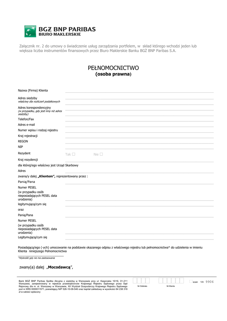 Załącznik nr. 2 do umowy o świadczenie usług zarządzania portfelem, w skład którego wchodzi jeden lub większa liczba instrumentów finansowych przez Biuro Maklerskie Banku BGŻ BNP Paribas S.A. PEŁNOMOCNICTWO (osoba prawna) NIP ___________________________________________________________ ___________________________________________________________ ___________________________________________________________ ___________________________________________________________ ___________________________________________________________ ___________________________________________________________ ___________________________________________________________ ___________________________________________________________ ___________________________________________________________ ___________________________________________________________ ___________________________________________________________ Rezydent Tak Kraj rezydencji ___________________________________________________________ Nazwa (Firma) Klienta Adres siedziby właściwy dla rozliczeń podatkowych Adres korespondencyjny (w przypadku, gdy jest inny niż adres siedziby) Telefon/Fax Adres e-mail Numer wpisu i rodzaj rejestru Kraj rejestracji REGON □ Nie □ dla której/ego właściwy jest Urząd Skarbowy Adres ___________________________________________________________ zwana/y dalej „Klientem”, reprezentowany przez : Panią/Pana ___________________________________________________________ Numer PESEL (w przypadku osób nieposiadających PESEL data urodzenia) legitymującą/cym się ___________________________________________________________ ___________________________________________________________ oraz Panią/Pana ___________________________________________________________ Numer PESEL (w przypadku osób nieposiadających PESEL data urodzenia) Legitymującą/cym się ___________________________________________________________ ___________________________________________________________ Posiadającą/ego (-ych) umocowanie na podstawie okazanego odpisu z właściwego rejestru lub pełnomocnictwa* do udzielenia w imieniu Klienta niniejszego Pełnomocnictwa ___________________________ *Wykreślić gdy nie ma zastosowania zwany(a) dalej „Mocodawcą”, Bank BGŻ BNP Paribas Spółka Akcyjna z siedzibą w Warszawie przy ul. Kasprzaka 10/16, 01-211 Warszawa, zarejestrowany w rejestrze przedsiębiorców Krajowego Rejestru Sądowego przez Sąd Rejonowy dla m. st. Warszawy w Warszawie, XII Wydział Gospodarczy Krajowego Rejestru Sądowego pod nr KRS 0000011571, posiadający NIP 526-10-08-546 oraz kapitał zakładowy w wysokości 84 238 318 zł w całości wpłacony Nr Oddziału Nr Klienta scan 1/4 9906 na podstawie §2 ust. 8 „Umowy o świadczenie usług zarządzania portfelem, w skład którego wchodzi jeden lub większa liczba instrumentów finansowych, przez Biuro Maklerskie Banku BGŻ BNP Paribas S.A. dla klientów bankowowości prywatnej" („Umowa”) zawartej w dniu __ __ -__ __-__ __ __ __ z Bankiem BGŻ BNP Paribas Spółka Akcyjna z siedzibą w Warszawie przy ul. Kasprzaka 10/16, 01-211 Warszawa, zarejestrowanym w rejestrze przedsiębiorców Krajowego Rejestru Sądowego przez Sąd Rejonowy dla m. st. Warszawy w Warszawie, XII Wydział Gospodarczy Krajowego Rejestru Sądowego pod nr KRS 0000011571, posiadającym NIP 526-10-08-546 oraz kapitał zakładowy w wysokości 84 238 318 zł w całości wpłacony, prowadzącym działalność maklerską na podstawie zezwolenia Komisji Nadzoru Finansowego w formie wyodrębnionej jednostki organizacyjnej pod nazwą Biuro Maklerskie Banku BGŻ BNP Paribas S.A. („Pełnomocnik”) udzielam Pełnomocnikowi umocowania do wykonywania w moim imieniu i na moją rzecz następujących czynności: 1. zawieranie, zmiana i rozwiązywanie w imieniu Mocodawcy umowy (umów) rachunku bankowego, umów o prowadzenie rachunku papierów wartościowych, umów o prowadzenie innych rachunków lub rejestrów, na których zapisywane będą instrumenty finansowe objęte Umową oraz umów o prowadzenie rachunku pieniężnego, jak również umów o przechowywanie instrumentów finansowych objętych Umową; pełnomocnictwo obejuje umocowanie do zawierania powyższych umów zawierających postanowienia, zgodnie z którymi Mocodawca zobowiaze się do nieskładania zleceń dotyczących przedmiotowych rachunków i rejestrów w inny sposób niż za pośrednictwem Pełnomocnika, a podmioty prowadzące przedmiotowe rachunki i rejestry będą zobowiązane do odmowy realizacji zleceń złożonych przez Mocodawcę bez pisemnej zgody Pełnomocnika; 2. zawieranie, zmiana i rozwiązywanie w imieniu Mocodawcy umów o przyjmowanie i przekazywanie zleceń nabycia lub zbycia instrumentów finansowych oraz umów o wykonywanie zleceń nabycia lub zbycia instrumentów finansowych; 3. nabywanie i zbywanie instrumentów finansowych w obrocie pierwotnym i wtórnym, jak również składanie zapisu w odpowiedzi na publiczne wezwanie do zapisywania się na sprzedaż akcji spółki publicznej; 4. składanie dyspozycji deponowania instrumentów finansowych na rachunkach papierów wartościowych; 5. zawieranie i rozwiązywanie transakcji walutowych, o ile nie jest to sprzeczne z obowiązującymi przepisami dewizowymi i służy zabezpieczeniu przed ryzykiem kursowym lub związane jest z obrotem instrumentami finansowymi denominowanymi w walutach obcych; 6. zawieranie, zmiana i rozwiązywanie umów pożyczek papierów wartościowych; 7. zawieranie, zmiana i rozwiązywanie umów kredytu lub pożyczki pieniężnej; 8. zawieranie, zmiana i rozwiązywanie w imieniu Mocodawcy umów mających na celu ustanowienie ograniczonych praw rzeczowych na instrumentach finansowych objętych Umową; 9. składanie, modyfikacja i anulowanie wszelkich dyspozycji związanych z instrumentami finansowymi objętymi Umową takich, jak w szczególności dyspozycja przeniesienia instrumentu finansowego lub przelewu środków pieniężnych na inny rachunek lub rejestr Mocodawcy, dysp