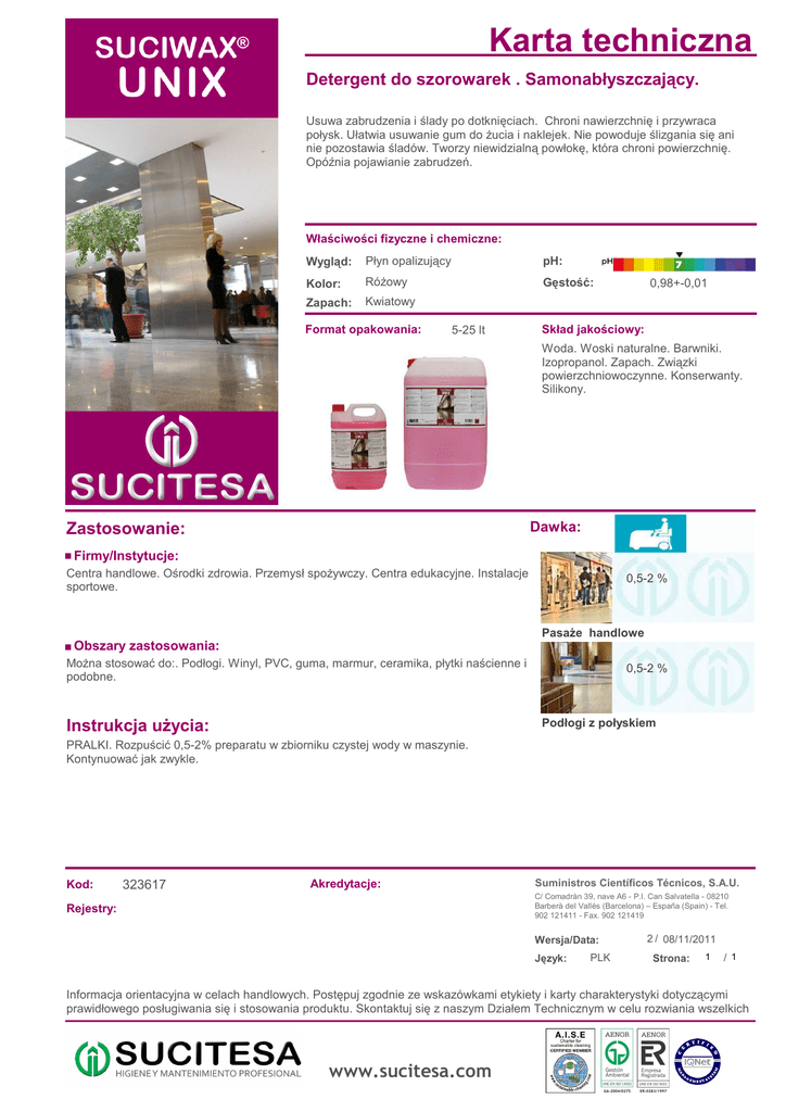Karta techniczna Detergent do szorowarek . Samonabłyszczający. Usuwa zabrudzenia i ślady po dotknięciach. Chroni nawierzchnię i przywraca połysk. Ułatwia usuwanie gum do żucia i naklejek. Nie powoduje ślizgania się ani nie pozostawia śladów. Tworzy niewidzialną powłokę, która chroni powierzchnię. Opóźnia pojawianie zabrudzeń. Właściwości fizyczne i chemiczne: Płyn opalizujący pH: Kolor: Różowy Gęstość: Zapach: Kwiatowy Wygląd: Format opakowania: 5-25 lt 0,98+-0,01 Skład jakościowy: Woda. Woski naturalne. Barwniki. Izopropanol. Zapach. Związki powierzchniowoczynne. Konserwanty. Silikony. Dawka: Zastosowanie: Firmy/Instytucje: Centra handlowe. Ośrodki zdrowia. Przemysł spożywczy. Centra edukacyjne. Instalacje sportowe. 0,5-2 % Pasaże handlowe Obszary zastosowania: Można stosować do:. Podłogi. Winyl, PVC, guma, marmur, ceramika, płytki naścienne i podobne. 0,5-2 % Podłogi z połyskiem Instrukcja użycia: PRALKI. Rozpuścić 0,5-2% preparatu w zbiorniku czystej wody w maszynie. Kontynuować jak zwykle. Kod: 323617 Akredytacje: Suministros Científicos Técnicos, S.A.U. C/ Comadrán 39, nave A6 - P.I. Can Salvatella - 08210 Barberà del Vallés (Barcelona) – España (Spain) - Tel. 902 121411 - Fax. 902 121419 Rejestry: Wersja/Data: Język: PLK 2 / 08/11/2011 Strona: 1 / 1 Informacja orientacyjna w celach handlowych. Postępuj zgodnie ze wskazówkami etykiety i karty charakterystyki dotyczącymi prawidłowego posługiwania się i stosowania produktu. Skontaktuj się z naszym Działem Technicznym w celu rozwiania wszelkich www.sucitesa.com