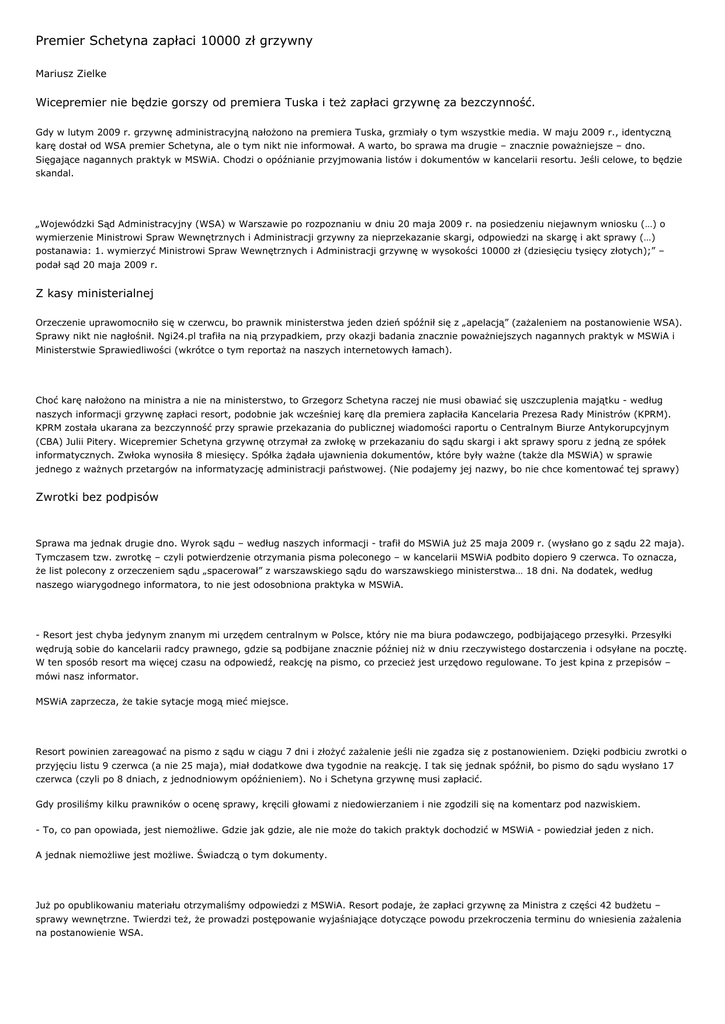 Premier Schetyna zapłaci 10000 zł grzywny Mariusz Zielke Wicepremier nie będzie gorszy od premiera Tuska i też zapłaci grzywnę za bezczynność. Gdy w lutym 2009 r. grzywnę administracyjną nałożono na premiera Tuska, grzmiały o tym wszystkie media. W maju 2009 r., identyczną karę dostał od WSA premier Schetyna, ale o tym nikt nie informował. A warto, bo sprawa ma drugie – znacznie poważniejsze – dno. Sięgające nagannych praktyk w MSWiA. Chodzi o opóźnianie przyjmowania listów i dokumentów w kancelarii resortu. Jeśli celowe, to będzie skandal. „Wojewódzki Sąd Administracyjny (WSA) w Warszawie po rozpoznaniu w dniu 20 maja 2009 r. na posiedzeniu niejawnym wniosku (…) o wymierzenie Ministrowi Spraw Wewnętrznych i Administracji grzywny za nieprzekazanie skargi, odpowiedzi na skargę i akt sprawy (…) postanawia: 1. wymierzyć Ministrowi Spraw Wewnętrznych i Administracji grzywnę w wysokości 10000 zł (dziesięciu tysięcy złotych);” – podał sąd 20 maja 2009 r. Z kasy ministerialnej Orzeczenie uprawomocniło się w czerwcu, bo prawnik ministerstwa jeden dzień spóźnił się z „apelacją” (zażaleniem na postanowienie WSA). Sprawy nikt nie nagłośnił. Ngi24.pl trafiła na nią przypadkiem, przy okazji badania znacznie poważniejszych nagannych praktyk w MSWiA i Ministerstwie Sprawiedliwości (wkrótce o tym reportaż na naszych internetowych łamach). Choć karę nałożono na ministra a nie na ministerstwo, to Grzegorz Schetyna raczej nie musi obawiać się uszczuplenia majątku - według naszych informacji grzywnę zapłaci resort, podobnie jak wcześniej karę dla premiera zapłaciła Kancelaria Prezesa Rady Ministrów (KPRM). KPRM została ukarana za bezczynność przy sprawie przekazania do publicznej wiadomości raportu o Centralnym Biurze Antykorupcyjnym (CBA) Julii Pitery. Wicepremier Schetyna grzywnę otrzymał za zwłokę w przekazaniu do sądu skargi i akt sprawy sporu z jedną ze spółek informatycznych. Zwłoka wynosiła 8 miesięcy. Spółka żądała ujawnienia dokumentów, które były ważne (także dla MSWiA) w sprawie jednego z ważnych przetargów na informatyzację administracji państwowej. (Nie podajemy jej nazwy, bo nie chce komentować tej sprawy) Zwrotki bez podpisów Sprawa ma jednak drugie dno. Wyrok sądu – według naszych informacji - trafił do MSWiA już 25 maja 2009 r. (wysłano go z sądu 22 maja). Tymczasem tzw. zwrotkę – czyli potwierdzenie otrzymania pisma poleconego – w kancelarii MSWiA podbito dopiero 9 czerwca. To oznacza, że list polecony z orzeczeniem sądu „spacerował” z warszawskiego sądu do warszawskiego ministerstwa… 18 dni. Na dodatek, według naszego wiarygodnego informatora, to nie jest odosobniona praktyka w MSWiA. - Resort jest chyba jedynym znanym mi urzędem centralnym w Polsce, który nie ma biura podawczego, podbijającego przesyłki. Przesyłki wędrują sobie do kancelarii radcy prawnego, gdzie są podbijane znacznie później niż w dniu rzeczywistego dostarczenia i odsyłane na pocztę. W ten sposób resort ma więcej czasu na odpowiedź, reakcję na pismo, co przecież jest urzędowo regulowane. To jest kpina z przepisów – mówi nasz informator. MSWiA zaprzecza, że takie sytacje mogą mieć miejsce. Resort powinien zareagować na pismo z sądu w ciągu 7 dni i złożyć zażalenie jeśli nie zgadza się z postanowieniem. Dzięki podbiciu zwrotki o przyjęciu listu 9 czerwca (a nie 25 maja), miał dodatkowe dwa tygodnie na reakcję. I tak się jednak spóźnił, bo pismo do sądu wysłano 17 czerwca (czyli po 8 dniach, z jednodniowym opóźnieniem). No i Schetyna grzywnę musi zapłacić. Gdy prosiliśmy kilku prawników o ocenę sprawy, kręcili głowami z niedowierzaniem i nie zgodzili się na komentarz pod nazwiskiem. - To, co pan opowiada, jest niemożliwe. Gdzie jak gdzie, ale nie może do takich praktyk dochodzić w MSWiA - powiedział jeden z nich. A jednak niemożliwe jest możliwe. Świadczą o tym dokumenty. Już po opublikowaniu materiału otrzymaliśmy odpowiedzi z MSWiA. Resort podaje, że zapłaci grzywnę za Ministra z części 42 budżetu – sprawy wewnętrzne. Twierdzi też, że prowadzi postępowanie wyjaśniające dotyczące powodu przekroczenia terminu do wniesienia zażalenia na postanowienie WSA. MSWiA zapewnia, że ma biuro podawcze (w biurze przepustek) i przyjmuje przesyłki zgodnie z zasadami określonymi w Instrukcji Kancelaryjnej. „Pracownicy MSWiA zobowiązani są do jej przestrzegania, zaś obieg korespondencji w resorcie odbywa się systematycznie. (…) Pragnę zapewnić, że korespondencji kierowanej do resortu spraw wewnętrznych i administracji w każdej z możliwych form, nadawany jest bieg i jest ona rozpatrywana przez właściwe komórki organizacyjne MSWiA." - podaje biuro prasowe MSWiA. Czekamy na odpowiedź na szczegółowe pytanie, w jaki sposób podbijane są "zwrotki". Będziemy wracać do tej sprawy. Bo to ważne zagadnienia dla wszystkich polskich przedsiębiorców załatwiających sprawy w tym resorcie. Aktualizacja: 24 lipca 2009 (18.45) 23 lipca 2009 21:14