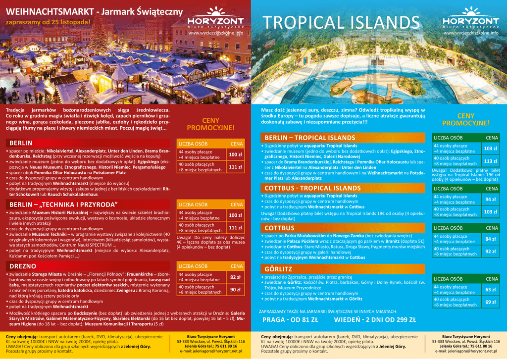 WEIHNACHTSMARKT - Jarmark Świąteczny zapraszamy od 25 listopada! www.wycieczkiszkolne.info Tradycja jarmarków bożonarodzeniowych sięga średniowiecza. Co roku w grudniu magia światła i dźwięk kolęd, zapach pierników i grzanego wina, gorąca czekolada, pieczone jabłka, ozdoby i rękodzieło przyciągają tłumy na place i skwery niemieckich miast. Poczuj magię świąt... BERLIN •spacer po mieście: Nikolaiviertel, Alexanderplatz, Unter den Linden, Brama Brandenburska, Reichstag (przy wczesnej rezerwacji możliwość wejścia na kopułę) •zwiedzanie muzeum (jedno do wyboru bez dodatkowych opłat): Egipskiego (ekspozycja w Neues Museum), Etnograficznego, Historii Niemiec, Pergamońskiego •spacer obok Pomnika Ofiar Holocaustu na Potsdamer Platz •czas do dyspozycji grupy w centrum handlowym •pobyt na tradycyjnym Weihnachtsmarkt (miejsce do wyboru) •dodatkowo proponujemy wizytę i zakupy w jednej z berlińskich czekoladziarni: Ritter Schokowelt lub Rausch Schokoladenhaus BERLIN – „TECHNIKA I PRZYRODA” •zwiedzanie Muzeum Historii Naturalnej – największy na świecie szkielet brachiozaura, ekspozycja poświęcona ewolucji, wystawy o kosmosie, układzie słonecznym i wiele innych atrakcji •czas do dyspozycji grupy w centrum handlowym •zwiedzanie Muzeum Techniki – w programie wystawy związane z kolejnictwem (40 oryginalnych lokomotyw i wagonów), lotnictwem (kilkadziesiąt samolotów), wystawa starych samochodów, Centrum Nauki SPECTRUM … •pobyt na tradycyjnym Weihnachtsmarkt (miejsce do wyboru: Alexanderplatz, Ku’damm pod Kościołem Pamięci …) DREZNO CENY PROMOCYJNE! LICZBA OSÓB 44 osoby płacące +4 miejsca bezpłatne 40 osób płacących +8 miejsc bezpłatnych CENA 100 zł 111 zł Masz dość jesiennej aury, deszczu, zimna? Odwiedź tropikalną wyspę w środku Europy – tu pogoda zawsze dopisuje, a liczne atrakcje gwarantują doskonałą zabawę i niezapomniane przeżycia!!! BERLIN – TROPICAL ISLANDS •3-godzinny pobyt w aquaparku Tropical Islands •zwiedzanie muzeum (jedno do wyboru bez dodatkowych opłat): Egipskiego, Etnograficznego, Historii Niemiec, Galerii Narodowej •spacer do Bramy Brandenburskiej, Reichstagu i Pomnika Ofiar Holocaustu lub spacer z Nikolaiviertel na Alexanderplatz i Unter den Linden •czas do dyspozycji grupy w centrum handlowym i na Weihnachtsmarkt na Potsdamer Platz lub Alexanderplatz COTTBUS - TROPICAL ISLANDS LICZBA OSÓB CENA 44 osoby płacące 100 zł +4 miejsca bezpłatne 40 osób płacących 111 zł +8 miejsc bezpłatnych Uwaga! Do ceny należy doliczyć 4€ – łączna dopłata za oba muzea (4 opiekunów – bez dopłat) LICZBA OSÓB CENA •zwiedzanie Starego Miasta w Dreźnie – „Florencji Północy”: Frauenkirche – zbom44 osoby płacące 82 zł bardowany w czasie wojny i odbudowany po latach symbol pojednania, tarasy nad +4 miejsca bezpłatne Łabą, majestatycznych rozmiarów poczet elektorów saskich, misternie wykonany 40 osób płacących 90 zł z miśnieńskiej porcelany, katedra katolicka, dziedziniec Zwingeru z Bramą Koronną, +8 miejsc bezpłatnych nad którą królują cztery polskie orły •czas do dyspozycji grupy w centrum handlowym •pobyt na tradycyjnym Weihnachtsmarkt •Możliwość krótkiego spaceru po Budziszynie (bez dopłat) lub zwiedzenia jednej z wybranych atrakcji w Dreźnie: Galeria Starych Mistrzów, Gabinet Matematyczno-Fizyczny, Skarbiec Elektorski (do 16 lat bez dopłat, powyżej 16 lat – 5 zł); Muzeum Higieny (do 18 lat – bez dopłat); Muzeum Komunikacji i Transportu (5 zł) Ceny obejmują: transport autokarem (barek, DVD, klimatyzacja), ubezpieczenie KL na kwotę 10000€ i NNW na kwotę 2000€, opiekę pilota. UWAGA! Ceny obliczono dla grup szkolnych wyjeżdżających z Jeleniej Góry. Pozostałe grupy prosimy o kontakt. TROPICAL ISLANDS Biuro Turystyczne Horyzont 53-333 Wrocław, ul. Powst. Śląskich 116 Jelenia Góra tel.: 75 611 80 16 e-mail: [email protected] •6-godzinny pobyt w aquaparku Tropical Islands •czas do dyspozycji grupy w centrum handlowym •pobyt na tradycyjnym Weihnachtsmarkt w Cottbus Uwaga! Dodatkowo płatny bilet wstępu na Tropical Islands 19€ od osoby (4 opiekunów - bez dopłat) COTTBUS •spacer po Parku Mużakowskim do Nowego Zamku (bez zwiedzania wnętrz) •zwiedzanie Pałacu Pücklera wraz z otaczającym go parkiem w Branitz (dopłata 5€) •zwiedzanie Cottbus: Stare Miasto, Ratusz, Droga Sławy, fragmenty murów miejskich •czas do dyspozycji grupy w galerii handlowej •pobyt na tradycyjnym Weihnachtsmarkt w Cottbus www.wycieczkiszkolne.info CENY PROMOCYJNE! LICZBA OSÓB CENA 44 osoby płacące 103 zł +4 miejsca bezpłatne 40 osób płacących 113 zł +8 miejsc bezpłatnych Uwaga! Dodatkowo płatny bilet wstępu na Tropical Islands 19€ od osoby (4 opiekunów – bez dopłat) LICZBA OSÓB CENA 44 osoby płacące +4 miejsca bezpłatne 40 osób płacących +8 miejsc bezpłatnych 94 zł 103 zł LICZBA OSÓB CENA 44 osoby płacące +4 miejsca bezpłatne 40 osób płacących +8 miejsc bezpłatnych 84 zł LICZBA OSÓB CENA 44 osoby płacące +4 miejsca bezpłatne 40 osób płacących +8 miejsc bezpłatnych 63 zł 92 zł GÖRLITZ •przejazd do Zgorzelca, przejście przez granicę •zwiedzanie Görlitz: kościół św. Piotra, barbakan, Górny i Dolny Rynek, kościół św. Trójcy, Muzeum Przyrodnicze •czas do dyspozycji grupy w centrum handlowym •pobyt na tradycyjnym Weihnachtsmarkt w Görlitz ZAPRASZAMY TAKŻE NA JARMARKI ŚWIĄTECZNE W INNYCH MIASTACH: PRAGA - OD 81 ZŁ 69 zł WIEDEŃ - 2 DNI OD 299 ZŁ Ceny obejmują: transport autokarem (barek, DVD, klimatyzacja), ubezpieczenie KL na kwotę 10000€ i NNW na kwotę 2000€, opiekę pilota. UWAGA! Ceny obliczono dla grup szkolnych wyjeżdżających z Jeleniej Góry. Pozostałe grupy prosimy o kontakt. Biuro Turystyczne Horyzont 53-333 Wrocław, ul. Powst. Śląskich 116 Jelenia Góra tel.: 75 611 80 16 e-mail: [email protected]