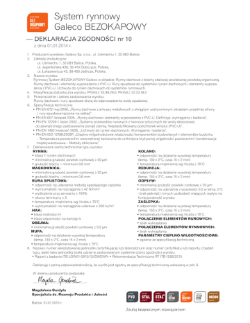 System rynnowy Galeco BEZOKAPOWY — DEKLARACJA ZGODNOŚCI nr 10 z dnia 01.01.2014 r. 1. Producent wyrobów: Galeco Sp. z o.o., ul. Uśmiechu 1, 32-083 Balice. 2. Zakłady produkcyjne: ul. Uśmiechu 1, 32-083 Balice, Polska, ul. Jagiellońska 43b, 32-410 Dobczyce, Polska, ul. Łukasiewicza 43, 38-460 Jedlicze, Polska. 3. Nazwa wyrobu: Rynnowy System BEZOKAPOWY Galeco w składzie: Rynny dachowe z blachy stalowej powlekanej powłoką organiczną. Rynny dachowe i elementy wyposażenia z PVC-U. Rury spustowe do systemów rynien dachowych i elementy wyposażenia z PVC-U. Uchwyty do rynien dachowych do systemów rynnowych. 4. Klasyfikacja statystyczna wyrobu: PKWiU: 25.99.29.0; PKWiU: 22.23.19.0 5. Przeznaczenie i zakres zastosowania wyrobu: Rynny dachowe i rury spustowe służą do odprowadzenia wody opadowej. 6. Specyfikacja techniczna: • PN-EN 612 maj 2006, „Rynny dachowe z arkuszy metalowych z okrągłym usztywnionym obrzeżem przedniej strony i rury spustowe łączone na zakład”. • PN-EN 607 listopad 2005, „Rynny dachowe i elementy wyposażenia z PVC-U. Definicje, wymagania i badania”. • PN-EN 12200-1 lipiec 2002, „Systemy przewodów rurowych z tworzyw sztucznych do wody deszczowej do zewnętrznego zastosowania ponad ziemią. Nieplastyfikowany poli(chlorek winylu) (PVC-U)”. • PN-EN 1462 kwiecień 2006, „Uchwyty do rynien dachowych. Wymagania i badania”. • PN-EN ISO 13788:2003P, „Cieplno-wilgotnościowe właściwości komponentów budowlanych i elementów budynku -- Temperatura powierzchni wewnętrznej konieczna do uniknięcia krytycznej wilgotności powierzchni i kondensacja międzywarstwowa -- Metody obliczania” 7. Deklarowane cechy techniczne typu wyrobu: RYNNA: KOLANO: • klasa Y rynien dachowych • odporność na działanie wysokiej temperatury • minimalna grubość powłoki cynkowej ≥ 20 μm (temp. 130 ± 2°C, czas 15 ± 2 min) • grubość blachy – minimum 0,6 mm • temperatura mięknienia wg Vicata ≥ 75°C MASKOWNICA: REDUKCJA: • minimalna grubość powłoki cynkowej ≥ 20 μm • odporność na działanie wysokiej temperatury • grubość blachy – minimum 0,6 mm (temp. 150 ± 2°C, czas 15 ± 2 min) RURA SPUSTOWA: ODPŁYW: • odporność na uderzenie metodą spadającego ciężarka • minimalna grubość powłoki cynkowej ≥ 20 μm • wytrzymałość na rozciąganie ≥ 42 N/mm² • odporność na uderzenie z wysokości 0,5 w temp. 0°C • wydłużenie przy zerwaniu ≥ 100% - brak pęknięć i innych uszkodzeń mających wpływ na • skurcz termiczny ≤ 3 funkcjonalność wyrobu • temperatura mięknienia wg Vicata ≥ 75°C ZAŚLEPKA: • wytrzymałość na rozciąganie udarowe ≥ 300 kJ/m² • odporność na działanie wysokiej temperatury HAK: (temp. 150 ± 2°C, czas 15 ± 2 min) • klasa nośności H • temperatura mięknienia wg Vicata ≥ 75°C • klasa odporności na korozję A POŁĄCZENIE ELEMENTÓW RUROWYCH: OBEJMA: • brak wykraplania • minimalna grubość powłoki cynkowej ≥ 0,2 μm POŁĄCZENIA ELEMENTÓW RYNNOWYCH: MUFA: • brak wykraplania • odporność na działanie wysokiej temperatury PARAMETRY CIEPLNO-WILGOTNOŚCIOWE: (temp. 130 ± 2°C, czas 15 ± 2 min) • zgodne ze specyfikacją techniczną • temperatura mięknienia wg Vicata ≥ 75°C 8. Nazwa i numer akredytowanej jednostki certyfikującej lub laboratorium oraz numer certyfikatu lub raportu z badań typu, jeżeli taka jednostka brała udział w zastosowanym systemie oceny zgodności wyrobu: • Raport z badania ITB LOW01-0913/13/Z00OWN • Rekomendacja Techniczna RT ITB-1266/2013 Deklaruję z pełną odpowiedzialnością, że wyrób jest zgodny ze specyfikacją techniczną wskazaną w pkt. 6. W imieniu producenta podpisała: ................................................................ Magdalena Gardyła Specjalista ds. Rozwoju Produktu i Jakości Balice, 01.01.2010 r. System rynnowy Galeco PVC 1