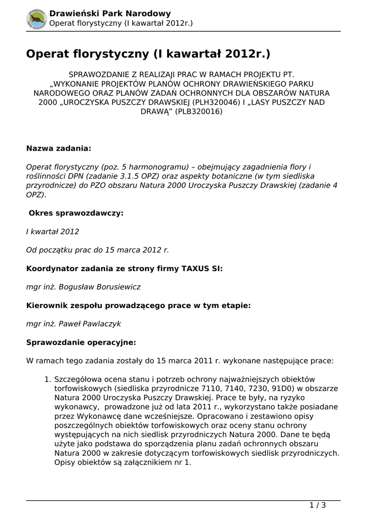 Drawieński Park Narodowy Operat florystyczny (I kawartał 2012r.) Operat florystyczny (I kawartał 2012r.) SPRAWOZDANIE Z REALIZAJI PRAC W RAMACH PROJEKTU PT. „WYKONANIE PROJEKTÓW PLANÓW OCHRONY DRAWIEŃSKIEGO PARKU NARODOWEGO ORAZ PLANÓW ZADAŃ OCHRONNYCH DLA OBSZARÓW NATURA 2000 „UROCZYSKA PUSZCZY DRAWSKIEJ (PLH320046) I „LASY PUSZCZY NAD DRAWĄ” (PLB320016) Nazwa zadania: Operat florystyczny (poz. 5 harmonogramu) – obejmujący zagadnienia flory i roślinności DPN (zadanie 3.1.5 OPZ) oraz aspekty botaniczne (w tym siedliska przyrodnicze) do PZO obszaru Natura 2000 Uroczyska Puszczy Drawskiej (zadanie 4 OPZ). Okres sprawozdawczy: I kwartał 2012 Od początku prac do 15 marca 2012 r. Koordynator zadania ze strony firmy TAXUS SI: mgr inż. Bogusław Borusiewicz Kierownik zespołu prowadzącego prace w tym etapie: mgr inż. Paweł Pawlaczyk Sprawozdanie operacyjne: W ramach tego zadania zostały do 15 marca 2011 r. wykonane następujące prace: 1. Szczegółowa ocena stanu i potrzeb ochrony najważniejszych obiektów torfowiskowych (siedliska przyrodnicze 7110, 7140, 7230, 91D0) w obszarze Natura 2000 Uroczyska Puszczy Drawskiej. Prace te były, na ryzyko wykonawcy, prowadzone już od lata 2011 r., wykorzystano także posiadane przez Wykonawcę dane wcześniejsze. Opracowano i zestawiono opisy poszczególnych obiektów torfowiskowych oraz oceny stanu ochrony występujących na nich siedlisk przyrodniczych Natura 2000. Dane te będą użyte jako podstawa do sporządzenia planu zadań ochronnych obszaru Natura 2000 w zakresie dotyczącym torfowiskowych siedlisk przyrodniczych. Opisy obiektów są załącznikiem nr 1. 1/3 Drawieński Park Narodowy Operat florystyczny (I kawartał 2012r.) 2. Analiza istniejących danych o florze roślin naczyniowych. Bardzo obszerne dane florystyczne z terenu DPN z okolicą pochodziły z różnych źródeł, z których najważniejszym jest baza danych florystycznych gromadzona dawniej w pracowni naukowej DPN. Baza ta liczy ok. 101 tys. notowań florystycznych z lat 1990-2001, z pewnymi uzupełnieniami z lat 2001-2011, jednak obejmuje ona zarówno dane z terenu DPN, jak i z sąsiedztwa, a większość danych „zaadresowana” jest przestrzenie z zastosowaniem numeracji oddziałów i literacji wydzieleń leśnych w poszczególnych nadleśnictwach z lat 80-tych i 90-tych XX w. (także w DPN jako adresy stosowane są stare numery pochodzące z nadleśnictw z czasów przed utworzeniem DPN). Uniemożliwiało to bezpośrednie skorzystanie z danych. Dlatego, dla umożliwienia wykorzystania tego materiału, przeprowadzono relokalizację miejsc notowań florystycznych. Ze zrelokalizowanych danych wybrano te, które dotyczą rzeczywiście terenu DPN, a nie jego sąsiedztwa. Baza danych dotycząca samego terenu DPN liczy po tych przetworzeniach 61155 historycznych (1990-2011) notowań florystycznych, zlokalizowanych przestrzennie, o 889 gatunkach roślin naczyniowych (najpospolitsze rośliny DPN to sosna, brzoza i buk, a następnie pokrzywa, śmiałek pogięty i borówka czernica). Baza, w wersji roboczej, jest załącznikiem nr 2 do sprawozdania. Obecny kształt danych umożliwia punktową wizualizację danych o rozmieszczeniu (należy pamiętać, że głównie w latach 1990-2001; aktualny stan będzie weryfikowany w toku prac terenowych w 2012 i 2013 r.) dowolnego gatunku flory naczyniowej na terenie DPN. 3. Zestawienie i analiza istniejących materiałów dotyczących grzybów makroskopijnych Drawieńskiego Parku Narodowego. Dotychczasowe dane dotyczące mykobioty Drawieńskiego Parku Narodowego są skąpe, a jedynymi źródłami wiedzy na temat mykobioty obszaru Parku są: Jasnowska J., Jasnowski M., Grinn U., Friedrich S. 1986. Flora projektowanego Drawieńskiego Parku Narodowego i jej osobliwości. [w]: Agapow L., Jasnowski M. (ed.) Przyroda projektowanego Drawieńskiego Parku Narodowego. Kujawa – Pawlaczyk J., Pawlaczyk P. – obserwacje dla potrzeb monitoringu ekosystemów leśnych Parku. Wykazy te wskazują na obecność na terenie Parku 187 gatunków grzybów wielkoowocnikowych. Wśród nich 14 znajduje się na czerwonej liście grzybów, dwa podlegają ochronie prawnej. Są to: , Cortinarius orellanus R, Exidia truncata R, Fistulina hepatica R, CHR, Galerina paludosa R, Galerina sphagnorum R, Geastrum sessile (syn.G.fimbriatum) R, CHR, Hericium clathroides CHR, Hygrophorus hypothejus I, Entoloma chalybaeum (syn Leptonia lazulina) R, Lycoperdon echinatum R, Pycnoporus cinnabarinus R, Ramaria formosa R, Sparassis crispa R, Tricholoma equestre (syn.T.flavovirens) I. Dane te wskazują, że mykobiota Drawieńskiego Parku Narodowego jest bardzo słabo rozpoznana, dopiero dokładniejsze jej rozpoznanie pozwoli na właściwą diagnozę zagrożeń oraz wskazanie sposobów ich eliminacji bądź ograniczenia. 2/3 Drawieński Park Narodowy Operat florystyczny (I kawartał 2012r.) 4. Prace terenowe w zakresie brioflory – zostały rozpoczęte jesienią 2011 r. i były prowadzone przez cały okres bez pokrywy śnieżnej. Prace te nadal trwają. Załączniki merytoryczne: Załącznik 1 – dane o torfowiskach Załącznik 2 – baza zrelokalizowanych danych florystycznych 3/3 Powered by TCPDF (www.tcpdf.org)