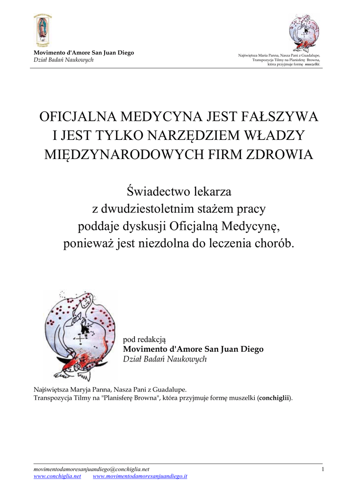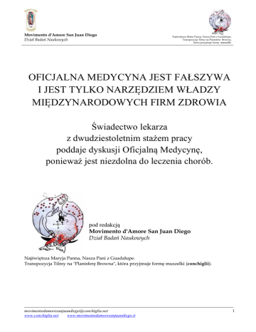 Movimento d'Amore San Juan Diego Dział Badań Naukowych Najświętsza Maria Panna, Nasza Pani z Guadalupe, Transpozycja Tilmy na Planisferę Browna, która przyjmuje formę muszelki. OFICJALNA MEDYCYNA JEST FAŁSZYWA I JEST TYLKO NARZĘDZIEM WŁADZY MIĘDZYNARODOWYCH FIRM ZDROWIA Świadectwo lekarza z dwudziestoletnim stażem pracy poddaje dyskusji Oficjalną Medycynę, ponieważ jest niezdolna do leczenia chorób. pod redakcją Movimento d'Amore San Juan Diego Dział Badań Naukowych Najświętsza Maryja Panna, Nasza Pani z Guadalupe. Transpozycja Tilmy na "Planisferę Browna", która przyjmuje formę muszelki (conchiglii). [email protected] www.movimentodamoresanjuandiego.it www.conchiglia.net 1 Movimento d'Amore San Juan Diego Dział Badań Naukowych Najświętsza Maria Panna, Nasza Pani z Guadalupe, Transpozycja Tilmy na Planisferę Browna, która przyjmuje formę muszelki. OFICJALNA MEDYCYNA JEST FAŁSZYWA I JEST TYLKO NARZĘDZIEM WŁADZY MIĘDZYNARODOWYCH FIRM ZDROWIA Świadectwo lekarza, który po dwudziestu latach pracy w zawodzie poddaje dyskusji Oficjalną Medycynę, ponieważ jest niezdolna do leczenia chorób. Dr Giuseppe De Pace Ortopeda Szpitalny sobota, 26 września 2009 Jestem chirurgiem-ortopedą, z prawie dwudziestoma latami pracy w zawodzie (piętnastoma - w szpitalu), które przebiegały w nieprzerwanym poszukiwaniu skutecznych terapii. Spędziłem dużo mojego czasu na badaniu strategii terapeutycznych i nowych leków, czasem próbując ich na sobie samym, aby przetestować ich skuteczność. Osiągnąłem główne cele, wiedząc w końcu, że mogę otrzymać to, co chciałem. Ale najważniejszym uzyskanym osiągnięciem jest zrozumienie, że „oficjalna medycyna” jest fałszywa i jest tylko narzędziem władzy Międzynarodowych Firm Zdrowia. My, lekarze, od samego początku jesteśmy pod presją uniwersyteckich nauk, które są nam serwowane przez kilku „profesorów”, których jedynym interesem jest pozostawianie nas w ignorancji odnośnie prawdziwego pochodzenia chorób. Niektórzy z nas, w końcu, docierają do świadomości i uruchamiają dużą energię, która powoduje pozytywne reakcje w Całości. Od dawna poddawałem dyskusji „oficjalną medycynę”, ponieważ jest niezdolna do leczenia chorób, najwyżej mogła łagodzić widoczne objawy, przesuwając je na inne organy. I to właśnie na tym nieporozumieniu bazuje się cała piramida „medycyny choroby”. Jeśli choroba „A” ma jako objawy x, y, z - , poprzez ich usunięcie uważa się, że pacjent wyzdrowiał. Nie interesuje, że w konsekwencji tego rozwinęła się choroba „B” z objawami - j, k, w - ponieważ będziemy mieli lek dla zablokowania również tych ostatnich itd. Nie rozumie się, lub nie chce się zrozumieć, że choroba „B” jest tylko wyrażeniem zablokowania choroby „A”, to jest mechanizmem obrony organizmu, który szuka nowej drogi, by się odtruć.Ostatecznie, jak mówi Tilden, choroby nie są niczym innym, jak objawami jedynej choroby: zatrucia. Przeżyłem osobiście dramat jedenastoletniego chłopca, cierpiącego na chłoniaka nie-Hodgkina. Międzynarodowa literatura mówi o 80% przeżycia dzięki nowym protokołom chemioterapeutycznym, co było wiadomością bardzo pocieszającą również dla mnie, który po raz pierwszy przeżywałem z bliska to doświadczenie. [email protected] www.movimentodamoresanjuandiego.it www.conchiglia.net 2 Movimento d'Amore San Juan Diego Dział Badań Naukowych Najświętsza Maria Panna, Nasza Pani z Guadalupe, Transpozycja Tilmy na Planisferę Browna, która przyjmuje formę muszelki. Nieporozumienie, tym razem, polega na fakcie, że jeśli pacjent umiera, nawet po miesiącu, z powodu niewydolności nerek lub wątroby, superinfekcji, itd., wyraźnie spowodowanych przez chemioterapię, dla statystyki nie umarł na chłoniaka! Wracając do chłopca, przez osiemnaście miesięcy był on poddawany wielkim dawkom chemioterapii i naświetlaniu całego ciała, przez co w okresach, kiedy nie miał terapii, pozostawał w szpitalu, aby leczyć niszczące skutki chemioterapii. Swój ostatni miesiąc życia spędził będąc sparaliżowany w łóżku, odurzony przez narkotyki i prawie ślepy. Do czego to wszystko było potrzebne? Jak można myśleć o wyeliminowaniu wszy z osoby poprzez podpalenie jej? To smutne doświadczenie było dla mnie fundamentalne, ponieważ ostatecznie obudziło moją świadomość i zrozumiałem, że trzeba oddziaływać na przyczyny, aby rozwiązać każdy problem. Zatem pojęcie ZDROWIA nie jest nie-chorobą, jak uważa oficjalna medycyna , ale jest doskonałą równowagą między umysłem a ciałem (mens sana in corpore sano). Poza tym nie wiadomo dlaczego jeden lek nie ma takiego samego działania na wszystkie osoby, czy też jedna infekcja nie atakuje wszystkich narażonych osobników. Musi istnieć bardzo ważna zmienna! Ostatnio usłyszałem od niektórych autorytatywnych (!) kolegów, że jakaś terapia jest skuteczna, jeśli daje conajmniej 55-60% pozytywnych wyników, tj. mniej więcej ten sam procent, co powstrzymanie się od leczenia! Jeśli jeden samochód nie hamuje, zastępuje mu się hamulce i dla wszystkich samochodów, które mają ten sam problem, środek zaradczy jest taki sam. Jeśli jedna osoba ma ból głowy, nie jest powiedziane, że po zażyciu środka przeciwbólowego ból przejdzie! Zatem musi istnieć druga zmienna, która ingeruje w proces wyzdrowienia. Jest nim Umysł. Podczas gdy Ciało leczymy przez zdrowe odżywianie się, odtruwając je i dając mu niezbędne wsparcie dla reagowania na zewnętrzne agresje (promieniowanie, zanieczyszczenie, itd.), Umysł ochraniamy poprzez bycie w pokoju z samym sobą i z innymi, poprzez kochanie Wszystkiego i Wszystkich, bez czynienia różnicy, oraz poprzez postawienie się naprawdę na miejscu drugiego człowieka. Tylko z doskonałej równowagi między Umysłem a Ciałem wypływa Zdrowie. Rok temu miałem operację hemityreoidektomii z powodu