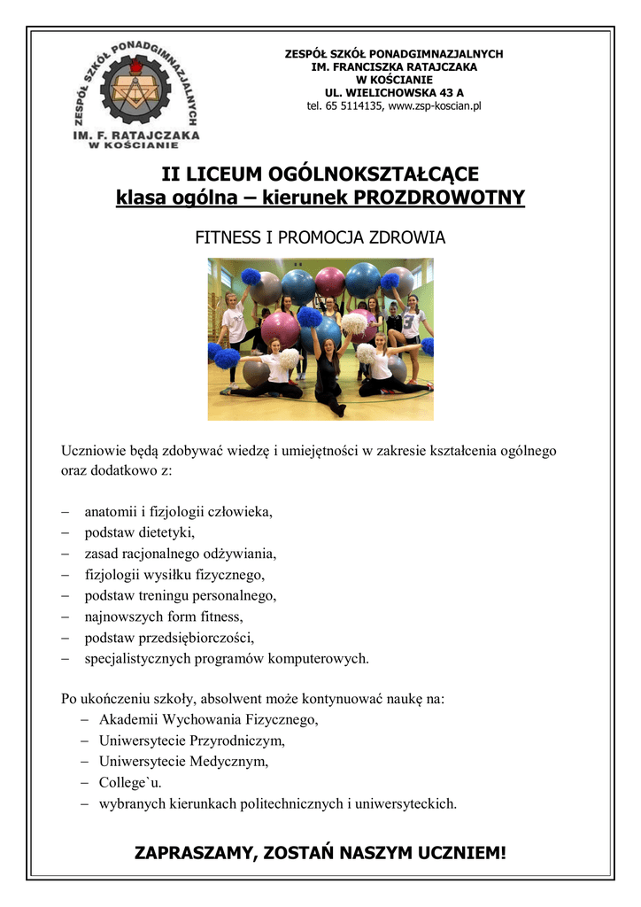 ZESPÓŁ SZKÓŁ PONADGIMNAZJALNYCH IM. FRANCISZKA RATAJCZAKA W KOŚCIANIE UL. WIELICHOWSKA 43 A tel. 65 5114135, www.zsp-koscian.pl II LICEUM OGÓLNOKSZTAŁCĄCE klasa ogólna – kierunek PROZDROWOTNY FITNESS I PROMOCJA ZDROWIA Uczniowie będą zdobywać wiedzę i umiejętności w zakresie kształcenia ogólnego oraz dodatkowo z: anatomii i fizjologii człowieka, podstaw dietetyki, zasad racjonalnego odżywiania, fizjologii wysiłku fizycznego, podstaw treningu personalnego, najnowszych form fitness, podstaw przedsiębiorczości, specjalistycznych programów komputerowych. Po ukończeniu szkoły, absolwent może kontynuować naukę na: Akademii Wychowania Fizycznego, Uniwersytecie Przyrodniczym, Uniwersytecie Medycznym, College`u. wybranych kierunkach politechnicznych i uniwersyteckich. ZAPRASZAMY, ZOSTAŃ NASZYM UCZNIEM!
