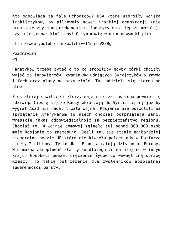 Kto odpowiada za falę uchodźców? USA które uzbroiły wojska Irakijczyków, by pilnowały nowej irackiej demokracji (nie bronią ze zbytnim przekonaniem, fanatycy mają lepsze morale), czy może jednak ktoś inny? O tym mówię w moim nowym klipie: http://www.youtube.com/watch?v=t1dnf_V8rBg Pozdrawiam PN Fanatyków trzeba pytać o to co zrobiliby gdyby córki chciały wyjść za innowierców, cwaniaków udających Syryjczyków o zawód i fach oraz plany na przyszłość. Tak oddzieli się ziarna od plew. Z ostatniej chwili: Ci którzy mają mnie za rusofoba pewnie się zdziwią… Cieszę się że Ruscy wkraczają do Syrii. Lepiej już by wygrał Asad niż nadal trwała wojna. Rosjanie nie pozwolili na sprzątanie Amerykanom to niech chociaż posprzątają sami. Wreszcie jakaś odpowiedzialność za bezpieczeństwo regionu. Chociaż to. W wojnie domowej zginęło już ponad 300.000 osób może Rosjanie to zastopują. Jeśli tak się stanie najbardziej niemoralną będzie UE która nie kiwnęła palcem gdy w Darfurze ginęły 2 miliony. Tylko UK i Francja ratują dziś honor Europy. Nie można akceptować zła tylko dlatego że ma miejsce w innym kraju. Goebbels uważal dręczenie Żydów za wewnętrzną sprawę Rzeszy. To takie ostrzeżenie dla zwolenników absolutnej suwerenności państw…