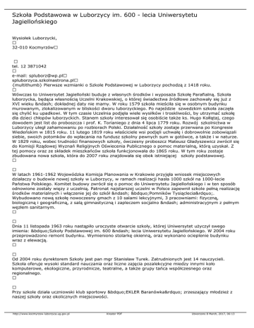 Szkoła Podstawowa w Luborzycy im. 600 - lecia Uniwersytetu Jagiellońskiego Wysiołek Luborzycki, 32-010 Kocmyrzów tel. 12 3871042 e-mail: [email protected] spluborzyca.szkolnastrona.pl {multithumb} Pierwsze wzmianki o Szkole Podstawowej w Luborzycy pochodzą z 1418 roku. Wówczas to Uniwersytet Jagielloński buduje z własnych środków i wyposaża Szkołę Parafialną. Szkoła luborzycka, będąca własnością Uczelni Krakowskiej, o której świadectwa źródłowe zachowały się już z XVI wieku – dokładnej daty nie mamy. W roku 1579 szkoła mieściła się w osobnym budynku murowanym, zlokalizowanym w bliskości dworu luborzyckiego. Po najeździe szwedzkim szkoła zaczęła się chylić ku upadkowi. W tym czasie Uczelnia podjęła wiele wysiłków i troskliwości, by utrzymać szkołę dla dzieci chłopów luborzyckich. Stanem szkoły interesował się osobiście także ks. Hugo Kołłątaj, czego dowodem jest list do proboszcza i prof. K. Torianiego z dnia 4 lipca 1779 roku. Rozwój szkolnictwa w Luborzycy uległ zahamowaniu po rozbiorach Polski. Działalność szkoły zostaje przerwana po Kongresie Wiedeńskim w 1815 roku. 11 lutego 1819 roku właściciele wsi podjęli uchwałę i dobrowolnie zobowiązali siebie, swoich potomków do wpłacania na fundusz szkolny pewnych sum w gotówce, a także i w naturze. W 1829 roku, wobec trudności finansowych szkoły, ówczesny proboszcz Mateusz Gładyszewicz zwrócił się do Komisji Rządowej Wyznań Religijnych Oświecenia Publicznego o pomoc materialną, którą uzyskał. Z tej pomocy oraz ze składek mieszkańców szkoła funkcjonowała do 1865 roku. W tym roku zostaje zbudowana nowa szkoła, która do 2007 roku znajdowała się obok istniejącej szkoły podstawowej. W latach 1961-1962 Wojewódzka Komisja Planowania w Krakowie przyjęła wniosek miejscowych działaczy o budowie nowej szkoły w Luborzycy, w ramach realizacji hasła 1000 szkół na 1000-lecie Państwa Polskiego. Komitet budowy zwrócił się o pomoc do Uniwersytetu Jagiellońskiego i w ten sposób odnowione zostały więzy z uczelnią. Patronat najstarszej uczelni w Polsce zapewnił szkole pełną realizację środków materialnych i włączenie jej do szkół – „Pomników Tysiąclecia”. Wybudowano nową szkołę nowoczesny gmach z 10 salami lekcyjnymi, 3 pracowniami: fizyczną, biologiczną i geograficzną, z salą gimnastyczną i zapleczem socjalno – administracyjnym z pełnym węzłem sanitarnym. Dnia 11 listopada 1963 roku nastąpiło uroczyste otwarcie szkoły, której Uniwersytet użyczył swego imienia: „Szkoły Podstawowej im. 600 – lecia Uniwersytetu Jagiellońskiego. W 2004 roku przeprowadzono remont budynku. Wymieniono stolarkę okienną, oraz wykonano ocieplenie budynku wraz z elewacją. Od 2004 roku dyrektorem Szkoły jest pan mgr Stanisław Turek. Zatrudnionych jest 14 nauczycieli. Szkoła oferuje wysoki standard nauczania oraz liczne zajęcia pozalekcyjne miedzy innymi koło komputerowe, ekologiczne, przyrodnicze, teatralne, a także grupy tańca współczesnego oraz regionalnego. Przy szkole działa uczniowski klub sportowy „EKLER Baranówka” zrzeszający młodzież z naszej szkoły oraz okolicznych miejscowości. http://www.kocmyrzow-luborzyca.ug.gov.pl Kreator PDF Utworzono 8 March, 2017, 06:13