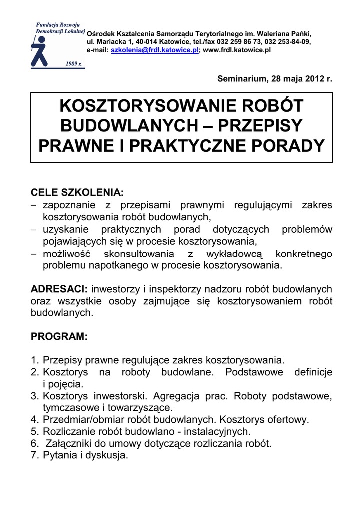 Ośrodek Kształcenia Samorządu Terytorialnego im. Waleriana Pańki, ul. Mariacka 1, 40-014 Katowice, tel./fax 032 259 86 73, 032 253-84-09, e-mail: [email protected]; www.frdl.katowice.pl Seminarium, 28 maja 2012 r. KOSZTORYSOWANIE ROBÓT BUDOWLANYCH – PRZEPISY PRAWNE I PRAKTYCZNE PORADY CELE SZKOLENIA: − zapoznanie z przepisami prawnymi regulującymi zakres kosztorysowania robót budowlanych, − uzyskanie praktycznych porad dotyczących problemów pojawiających się w procesie kosztorysowania, − możliwość skonsultowania z wykładowcą konkretnego problemu napotkanego w procesie kosztorysowania. ADRESACI: inwestorzy i inspektorzy nadzoru robót budowlanych oraz wszystkie osoby zajmujące się kosztorysowaniem robót budowlanych. PROGRAM: 1. Przepisy prawne regulujące zakres kosztorysowania. 2. Kosztorys na roboty budowlane. Podstawowe definicje i pojęcia. 3. Kosztorys inwestorski. Agregacja prac. Roboty podstawowe, tymczasowe i towarzyszące. 4. Przedmiar/obmiar robót budowlanych. Kosztorys ofertowy. 5. Rozliczanie robót budowlano - instalacyjnych. 6. Załączniki do umowy dotyczące rozliczania robót. 7. Pytania i dyskusja. Miejsce: Katowice, siedziba Ośrodka, ul. Mariacka 1 (II piętro). Termin: 28 maja 2012 r., godz. 09.00 – 15.00. Koszt: 297 zł netto - zwolnione z VAT w przypadku finansowania szkolenia ze środków publicznych, w pozostałych przypadkach do ceny należy doliczyć 23% VAT. Cena obejmuje materiały szkoleniowe, lunch, zaświadczenie o ukończeniu szkolenia. RABAT 10% za każdą następną osobę zgłoszoną z tej samej instytucji. W przypadku pytań prosimy o kontakt z Barbarą Tylki pod nr tel. 032/253-63-77, 259-86-73 nr wew.34 lub e-mailem: [email protected] Kartę zgłoszenia udziału prosimy przesłać mailem lub faxem do 23 maja 2012 r. -------------------------------------------------------------------------------------------------------------------- Karta zgłoszenia – kod szkolenia: 33/E/12/TCH Nazwa Nabywcy (dane do F. VAT):............................................................................ ulica, nr domu: .....................................kod pocztowy..............………………….. NIP: ........................................................ Tel....................................................... 1. .......................................................................................................................... imię i nazwisko, (wypełnić drukowanymi) wydział/stanowisko 2. ....................................................................................................RABAT 10% imię i nazwisko, (wypełnić drukowanymi) wydział/stanowisko UWAGA! Oświadczam, że udział w szkoleniu jest dla uczestnika/ów kształceniem zawodowym finansowanym w całości lub co najmniej 70% ze środków publicznych (proszę wybrać) TAK / NIE podpis…………………………………… UWAGA! Ilość miejsc ograniczona. O udziale w szkoleniu decyduje kolejność zgłoszeń. Zgłoszenie na szkolenie musi zostać potwierdzone przesłaniem do Ośrodka karty zgłoszenia. Brak pisemnej rezygnacji ze szkoleń najpóźniej na trzy dni przed terminem jest równoznaczny z obciążeniem Państwa należnością za te szkolenia. Należność należy płacić przelewem najpóźniej na 3 dni przed szkoleniem (nie dotyczy jednostek samorządu terytorialnego), (na przelewie prosimy podać nazwę szkolenia lub jego numer. NR RACHUNKU: BPH 68-10600076-0000321000197618