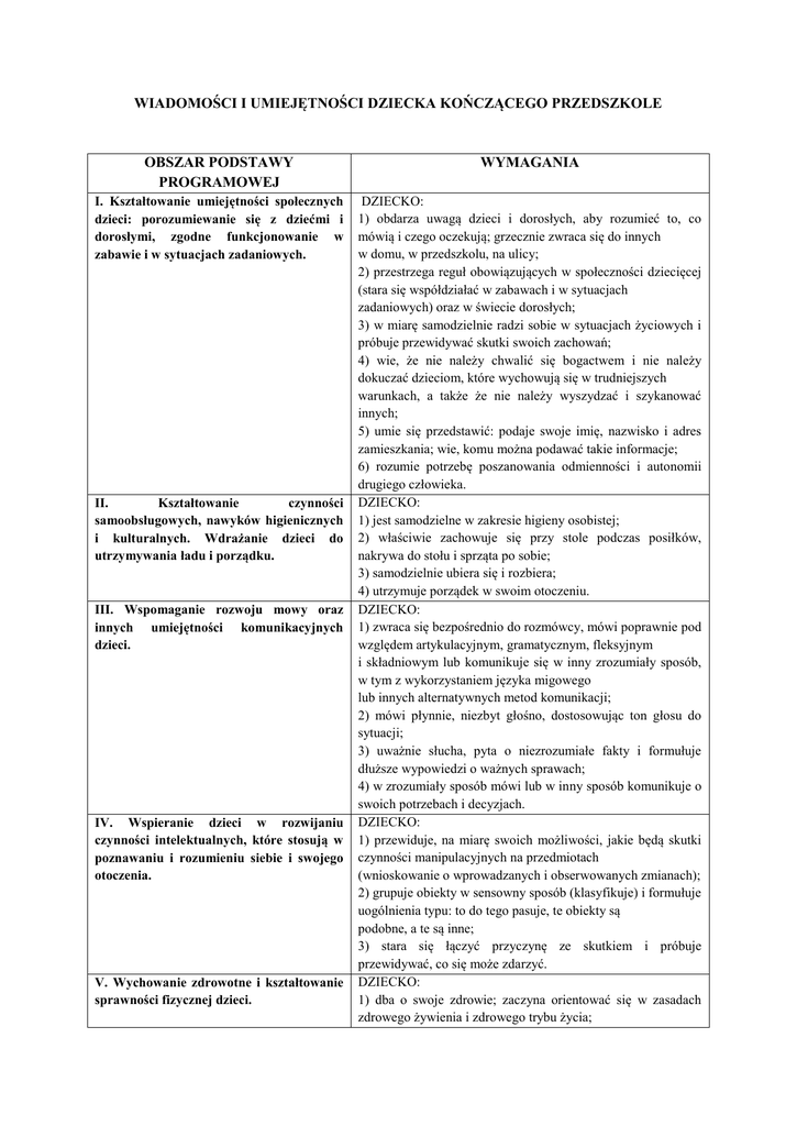 WIADOMOŚCI I UMIEJĘTNOŚCI DZIECKA KOŃCZĄCEGO PRZEDSZKOLE OBSZAR PODSTAWY PROGRAMOWEJ WYMAGANIA I. Kształtowanie umiejętności społecznych dzieci: porozumiewanie się z dziećmi i dorosłymi, zgodne funkcjonowanie w zabawie i w sytuacjach zadaniowych. DZIECKO: 1) obdarza uwagą dzieci i dorosłych, aby rozumieć to, co mówią i czego oczekują; grzecznie zwraca się do innych w domu, w przedszkolu, na ulicy; 2) przestrzega reguł obowiązujących w społeczności dziecięcej (stara się współdziałać w zabawach i w sytuacjach zadaniowych) oraz w świecie dorosłych; 3) w miarę samodzielnie radzi sobie w sytuacjach życiowych i próbuje przewidywać skutki swoich zachowań; 4) wie, że nie należy chwalić się bogactwem i nie należy dokuczać dzieciom, które wychowują się w trudniejszych warunkach, a także że nie należy wyszydzać i szykanować innych; 5) umie się przedstawić: podaje swoje imię, nazwisko i adres zamieszkania; wie, komu można podawać takie informacje; 6) rozumie potrzebę poszanowania odmienności i autonomii drugiego człowieka. DZIECKO: 1) jest samodzielne w zakresie higieny osobistej; 2) właściwie zachowuje się przy stole podczas posiłków, nakrywa do stołu i sprząta po sobie; 3) samodzielnie ubiera się i rozbiera; 4) utrzymuje porządek w swoim otoczeniu. DZIECKO: 1) zwraca się bezpośrednio do rozmówcy, mówi poprawnie pod względem artykulacyjnym, gramatycznym, fleksyjnym i składniowym lub komunikuje się w inny zrozumiały sposób, w tym z wykorzystaniem języka migowego lub innych alternatywnych metod komunikacji; 2) mówi płynnie, niezbyt głośno, dostosowując ton głosu do sytuacji; 3) uważnie słucha, pyta o niezrozumiałe fakty i formułuje dłuższe wypowiedzi o ważnych sprawach; 4) w zrozumiały sposób mówi lub w inny sposób komunikuje o swoich potrzebach i decyzjach. DZIECKO: 1) przewiduje, na miarę swoich możliwości, jakie będą skutki czynności manipulacyjnych na przedmiotach (wnioskowanie o wprowadzanych i obserwowanych zmianach); 2) grupuje obiekty w sensowny sposób (klasyfikuje) i formułuje uogólnienia typu: to do tego pasuje, te obiekty są podobne, a te są inne; 3) stara się łączyć przyczynę ze skutkiem i próbuje przewidywać, co się może zdarzyć. DZIECKO: 1) dba o swoje zdrowie; zaczyna orientować się w zasadach zdrowego żywienia i zdrowego trybu życia; II. Kształtowanie czynności samoobsługowych, nawyków higienicznych i kulturalnych. Wdrażanie dzieci do utrzymywania ładu i porządku. III. Wspomaganie rozwoju mowy oraz innych umiejętności komunikacyjnych dzieci. IV. Wspieranie dzieci w rozwijaniu czynności intelektualnych, które stosują w poznawaniu i rozumieniu siebie i swojego otoczenia. V. Wychowanie zdrowotne i kształtowanie sprawności fizycznej dzieci. VI. Wdrażanie dzieci do dbałości bezpieczeństwo własne oraz innych. o VII. Wychowanie przez sztukę – dziecko widzem i aktorem. VIII. Wychowanie przez sztukę – muzyka: różne formy aktywności muzycznoruchowej (śpiew, gra, taniec). IX. Wychowanie przez sztukę – różne formy plastyczne. X. Wspomaganie rozwoju intelektualnego dzieci poprzez zabawy konstrukcyjne, budzenie zainteresowań technicznych. 2) dostrzega związek pomiędzy chorobą a leczeniem, poddaje się leczeniu, np. wie, że przyjmowanie lekarstw i zastrzyki są konieczne; 3) jest sprawne fizycznie lub jest sprawne na miarę swoich możliwości; 4) uczestniczy w zajęciach ruchowych, w zabawach i grach w ogrodzie przedszkolnym, w parku, na boisku, w sali gimnastycznej. DZIECKO: 1) wie, jak trzeba zachować się w sytuacji zagrożenia i gdzie można otrzymać pomoc, umie o nią poprosić; 2) orientuje się w bezpiecznym poruszaniu się po drogach i w korzystaniu ze środków transportu; 3) zna zagrożenia płynące ze świata ludzi, roślin oraz zwierząt i unika ich; 4) wie, że nie może samodzielnie zażywać lekarstw i stosować środków chemicznych (np. środków czystości); 5) próbuje samodzielnie i bezpiecznie organizować sobie czas wolny w przedszkolu i w domu; ma rozeznanie, gdzie można się bezpiecznie bawić, a gdzie nie. DZIECKO: 1) wie, jak należy się zachować na uroczystościach, np. na koncercie, festynie, przedstawieniu, w teatrze, w kinie; 2) odgrywa role w zabawach parateatralnych, posługując się mową, mimiką, gestem i ruchem; umie posługiwać się rekwizytami (np. maską). DZIECKO: 1) śpiewa piosenki z dziecięcego repertuaru oraz łatwe piosenki ludowe; chętnie uczestniczy w zbiorowym śpiewie, w tańcach i muzykowaniu; 2) dostrzega zmiany charakteru muzyki (np. dynamiki, tempa i wysokości dźwięku) i wyraża je ruchem; 3) wyraża stany emocjonalne, pojęcia i zjawiska pozamuzyczne różnymi środkami aktywności muzycznej – instrumentalnej (z użyciem instrumentów perkusyjnych oraz innych przedmiotów), wokalnej i ruchowej; 4) w skupieniu słucha muzyki, w tym także muzyki poważnej. DZIECKO: 1) umie wypowiadać się w różnych technikach plastycznych i przy użyciu elementarnych środków wyrazu (takich jak kształt i barwa) w postaci prostych kompozycji i form konstrukcyjnych; 2) przejawia, na miarę swoich możliwości, zainteresowanie wybranymi zabytkami i dziełami sztuki oraz tradycjami i obrzędami ludowymi ze swojego regionu; 3) wykazuje zainteresowanie malarstwem, rzeźbą i architekturą (także architekturą zieleni i architekturą wnętrz). DZIECKO: 1) wznosi konstrukcje z klocków i tworzy kompozycje z różnorodnych materiałów (np. przyrodniczych), ma poczucie sprawstwa („potrafię to zrobić”) i odczuwa radość z wykonanej pracy; XI. Pomaganie dzieciom w rozumieniu istoty zjawisk atmosferycznych i w unikaniu zagrożeń. XII. Wychowanie dla poszanowania roślin i zwierząt. XIII. Wspomaganie rozwoju intelektualnego dzieci wraz z edukacją matematyczną. XIV. Tworzenie warunków do doświadczeń językowych i komunikacyjnych w zakresie reprezentatywnej i komunikatywnej funkcji języ