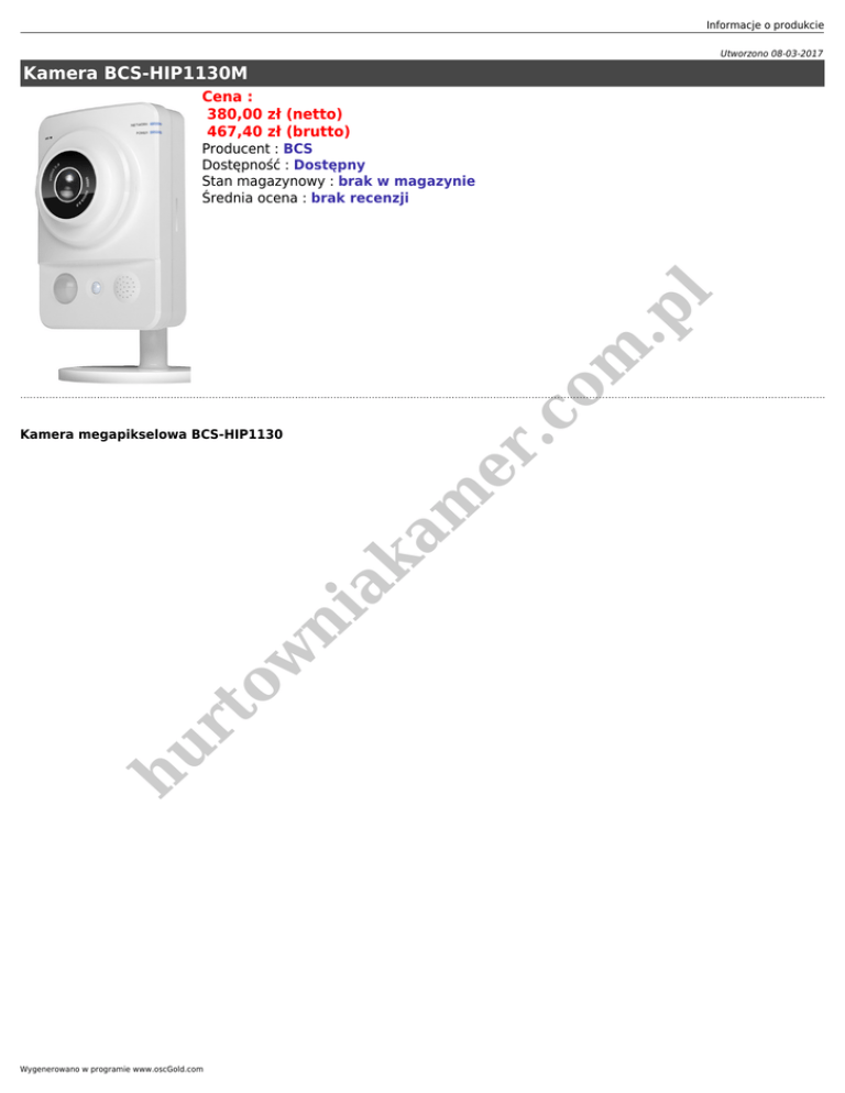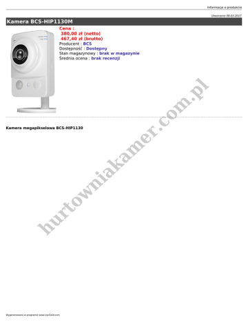 Informacje o produkcie Utworzono 08-03-2017 Kamera BCS-HIP1130M Cena : 380,00 zł (netto) 467,40 zł (brutto) hu rt ow ni ak am Kamera megapikselowa BCS-HIP1130 er .c om .p l Producent : BCS Dostępność : Dostępny Stan magazynowy : brak w magazynie Średnia ocena : brak recenzji Wygenerowano w programie www.oscGold.com .p l er .c om ni ak am ● ● ● ● ● ● ● ● ● ● ● 1/3" 1.3 Megapixel Aptina CMOS Wysoko wydajny procesor TI DaVinci serii DSP Kompresja video H.264 i obrazu MJPEG Obsługa dwóch strumienia kodowania Max. 25 kl/s @720P(1280×720) , 15 kl/s @1.3M(1280×960) Obiektyw: 3.6mm Zasilanie DC12V Wbudowany Web server, NVR, CMS(PSS/DSS) i DMSS Obudowa metal + plastik, uchwyt w kpl. Wbudowana dioda światła białego Wbudpwany PIR sensor Wyjścia alarmowe: 1 Wejścia alarmowe: 1 rt ● hu ● ow Podstawowe cechy: Kamera BCS-HIP1130, to kamera sieciowa przeznaczona do stosowania w systemach monitoringu CCTV IP, gdzie potrzebne jest urządzenie do rejestrowania obrazu z ochranianych miejsc i obiektów. HIP-1130 została wyposażona w wydajny przetwornik 1/3" 1.3 Megapiksela Aptina CMOS. Zastosowanie tego przetwornika umożliwia zapis nagrań wideo z prędkością 15 klatek na sekundę w rozdzielczości oraz 25 klatek na sekundę w rozdzielczości 720P. Stałoogniskowy obiektyw pozwala na rejestrowanie obserwowanej sceny, a wbudowana dioda światła białego zwiększa możliwości obserwacji. Menu i obsługa kamery...Zarządzanie, programowanie ustawień oraz obsługa kamery megapixelowej IP BCS HIP-1130 odbywa się w czytelnym i przejrzystym systemie do zarządzania urządzeniem, który jest dostępny z poziomu przeglądarki internetowej. Za pomocą Informacje o produkcie intuicyjnego menu programu możliwe jest nie tylko testowanie kamery i bieżący podgląd rejestrowanego obrazu ale również dokładne wyznaczenie dat i przedziałów czasowych. Kompresja H.264... Kamera BCS-DMIP1200 posiada wysoki standard kompresji wideo H.264, dzięki temu urządzenie jest w stanie zapisać er .c om .p l więcej informacji na tej samej pojemności dysku, drastycznie zmniejszając rozmiary plików i zachowania cennych przepustowości sieci oraz miejsca w porównaniu do innych urządzeń wykorzystujących kompresję MJPEG lub MPEG-4 nawet o 90%. Przykładowo zdjęcie 1Mb może być znacznie zredukowane do zaledwie 10Kb przy użyciu H.264. hu rt ow ni ak am Oprogramowanie PSS, Smart PSS, DMSS...Kompleksowe zarządzenie oraz nadzór nad systemem zabezpieczeń i siecią kamer do obserwacji stanowi o skuteczności każdej instalacji monitoringu wizyjnego. Firma BCS z myślą o użytkownikach komputerów osobistych PC oraz MAC stworzyła aplikacje PSS i Smart PSS do kreowania i personalizacji własnego systemu obserwacji. Za pomocą dostępnych aplikacji możliwe jest utworzenie kompleksowego systemu monitoringu składającego się nawet z 100 kamer i obejmującego szerokie spektrum wykorzystywanych technologii. Dzięki wszechstronności dostępnego oprogramowania realne jest bieżące zarządzanie zarówno kamerami analogowymi telewizji przemysłowej, jak i megapikselowymi kamerami IP oraz PTZ. Podgląd obrazu przy pomocy urządzeń mobilnych... Do rejestratorów BCS zostały stworzone aplikacje do prowadzenia monitoringu przy pomocy urządzeń mobilnych. Apple iPhone, iPad, BlackBerry oraz telefonów z systemem Symbian lub Windows Phone. Wygenerowano w programie www.oscGold.com .p l Aplikacja gDMSS Lite została stworzona na systemy operacyjne Android oraz Apple iOS w wersji Light umożliwia prowadzenie monitoringu, kontrolę głowicami PTZ. W wersji plus dodatkowo można również odtwarzać nagrania oraz rejestrować zdalny obraz na smartfonie czy tablecie. Dla urządzeń opartych na systemie Windows Phone została napisana aplikacja DMSS umożliwia ona prowadzenie monitoringu z rejestratorów Dahua BCS tylko w pojedynczych oknach. ● ● ● ● ● ● ● ● ● ● ● przetwornik: 1/3" 1.3Mp Aptina CMOS rozdzielczość: 1280x960 interfejs: Ethernet 10/100 Base-T PoE (802.3af) kompresja: H.264/MJPEG - podwójny strumień kompresji ilość pikseli: 1.3Mpx (15kl/s) obiektyw: 3.6mm wbudowana dioda światła białego obudowa: metal + plastic powiadomienia o zdarzeniach poprzez e-mail powiadomienia o zdarzeniach poprzez TCP/IP wyzwolenie nagrywania obrazu poprzez detekcję ruchu rozdzielczość strumienia wideo: 1.3MP (1280x960) 15kl/s 720P (1280x720) 25kl/s D1 (704x576) 25kl/s CIF (352x288) 25kl/s VGA (640x480) 25kl/s zasilanie: 12V DC gwarancja: 24 miesiące ni ak am ● ❍ ❍ ❍ ❍ rt hu ● ow ❍ ● er .c om Specyfikcja: