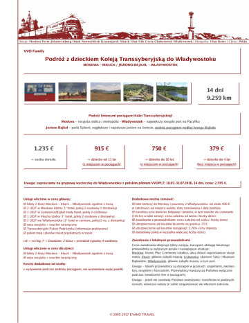 VVO Family Podróż z dzieckiem Koleją Transsyberyjską do Władywostoku MOSKWA – IRKUCK / JEZIORO BAJKAŁ – WŁADYWOSTOK 14 dni 9.259 km Podróż liniowymi pociągami Kolei Transsyberyjskiej! Moskwa – rosyjska stolica i metropolia · Władywostok – największy rosyjski port na Pacyfiku Jezioro Bajkał – perła Syberii, najgłębsze i najstarsze jezioro na świecie, podróż pociągiem wzdłuż brzegu Bajkału 1.235 € 915 € 750 € 379 € -> osoba dorosła -> dziecko od 11 lat -> dziecko do 10 lat -> dziecko do 4 lat -> dziecko do 13 lat (z miejscem w pociągach) (z miejscem w pociągach) (bez miejsca w pociągach) Uwaga: zapraszamy na grupową wycieczkę do Władywostoku z polskim pilotem VVOPLT: 18.07.-31.07.2016, 14 dni, cena: 2.595 €. Usługi wliczone w cenę główną: Dodatkowo można zamówić: ☑ bilety 2 klasy Moskwa – Irkuck – Władywostok zgodnie z trasą ☑ 2 UE/F w Moskwie (dobry 3* hotel, pokój 2-osobowy z dostawką) ☑ 1 UE/F w Listwiance/Bajkał (mały hotel, pokój 3-osobowy) ☑ 1 UE/F w Irkucku (dobry 3* hotel, pokój 2-osobowy z dostawką) ☑ 2 UE/F we Władywostoku (3* hotel w centrum, pokój 2-os. z dostawką) ☑ wiza rosyjska + voucher turystyczny ☑ Transsyberyjski Pakiet Podróżnika (informacje praktyczne) ☑ pakiet map i planów miast przydatnych w trasie ☑ bilet lotniczy do Moskwy i powrotny z Władywostoku: od około 400 € w zależności od miejsca wylotu, daty zamówienia i daty podróży ☑ transfery z/na dworzec kolejowy i lotnisko, w tym transfer do Listwianki (130 km w obie strony): cena zależna od wieku i liczby dzieci ☑ zwiedzanie z przewodnikami: cena zależna od wieku i liczby dzieci ☑ ubezpieczenie od kosztów leczenia za granicą: 21 € ☑ ubezpieczenie od kosztów rezygnacji: 2,76% ceny imprezy ☑ dodatkowy pokój w wypadku większej liczby dzieci UE = nocleg, F = śniadanie. 2 klasa = przedział sypialny 4-osobowy. Zwiedzanie z lokalnymi przewodnikami: Usługi wliczone w ceny dla dzieci: ☑ bilety 2 klasy Moskwa – Irkuck – Władywostok zgodnie z trasą ☑ wiza rosyjska + voucher turystyczny Koszty dodatkowe od osoby: ✗ wyżywienie podczas podróży pociągiem, nie wymienione wyżej posiłki Cena zwiedzania obejmuje bilety wstępu, transport, obsługę lokalnego przewodnika w wybranym języku i następujące atrakcje: Moskwa: Kreml, Plac Czerwony i okolice, ulica Arbat i najciekawsze stacje metra; Irkuck: główne zabytki miasta; Listwianka: skansen Talcy i Muzeum Bajkalskie; Władywostok: główne zabytki miasta, w tym port. Uwaga – lokalni przewodnicy są dostępni w językach: angielskim, niemieckim, rosyjskim i francuskim. Przewodnicy towarzyszą Państwu wyłącznie podczas zwiedzania (nie w pociągach). Uwaga – jeżeli nie zamówią Państwo zwiedzania i transferów w podanych cenach, wówczas należy je sobie zorganizować we własnym zakresie. © 2005-2017 EYAND TRAVEL Czeka Państwa około 2-tygodniowa podróż, w tym przejazd liniowymi pociągami Kolei Transsyberyjskiej. Oznacza to 9.259 km ciekawej trasy prowadzącej przez Syberię, wysokogórskie krajobrazy Uralu, liczne syberyjskie metropolie i wioski. Przez około 100 km trasa prowadzi wzdłuż brzegu Bajkału – wybraliśmy takie połączenie kolejowe, które umożliwia podziwianie tego przepięknego odcinka w ciągu dnia. Od Irkucka zaczyna się jeden z najciekawszych i najbardziej zmiennych krajobrazowo odcinków trasy Kolei Transsyberyjskiej o długości około 4.000 km. Trasa prowadzi początkowo przez piękną i ciekawą rosyjską Republikę Buriacji, a następnie przez niemalże niezaludnione tereny Dalekiego Wschodu. To tutaj zaczynają się największe serpentyny, dzięki którym możliwe jest fotografowanie pociągu na tle pięknych krajobrazów. Pociąg przejeżdża przez liczący ponad 2,5 km most na rzece Amur – najdłuższy na trasie Kolei Transsyberyjskiej. W pociągu będzie okazja do zawarcia nowych ciekawych znajomości, zapoznania się z inną kulturą i zrobienia pięknych zdjęć. Na peronach stacji pośrednich będą Państwo mieli okazję spróbowania świeżych regionalnych przysmaków. Podczas podróży przewidziany jest postój w Irkucku oraz pobyt na łonie natury – nad Jeziorem Bajkał w miejscowości Listwianka, gdzie będzie możliwość skosztowania bajkalskiego specjału – wędzonej ryby omul i skorzystania z tradycyjnej sauny rosyjskiej – banji. Moskwa 9 dzień: Wczesnym rankiem odjazd pociągiem do Władywostoku. Przez około 2 godziny pociąg jedzie wzdłuż Jeziora Bajkał! 1 dzień: Przyjazd do Moskwy, nocleg. Transsib: 10-11 dzień: Podróż pociągiem. 2 dzień: Zwiedzanie Kremla, Placu Czerwonego i okolic oraz słynnej historycznej ulicy Arbat znanej z piosenek Bułata Okudżawy, przy której zamieszkiwał także Aleksander Puszkin. Wycieczka do najciekawszych stacji metra, podczas której zobaczą Państwo wybrane najciekawsze stacje i przekonają się dlaczego określane są one mianem podziemnych pałaców. Władywostok Przebieg trasy 12 dzień: Około południa przyjazd do Władywostoku, transfer z dworca do hotelu, nocleg. 3 dzień: Czas wolny. Wczesnym popołudniem odjazd pociągiem do Irkucka. 13 dzień: Zwiedzanie Władywostoku, w tym największego rosyjskiego portu morskiego na Pacyfiku wraz z położoną pośród wzgórz zatoką Złoty Róg. Nocleg we Władywostoku. Transsib: 4-6 dzień: Podróż pociągiem. 14 dzień: Powrót. Irkuck, Listwianka, Jezioro Bajkał 7 dzień: Przyjazd rano do Irkucka. Zwiedzanie Irkucka i przejazd do Listwianki położonej nad Jeziorem Bajkał (65 km). Jeżeli nie zamówią Państwo dodatkowo transferów, wówczas do Listwianki można dojechać i wrócić we własnym zakresie autobusem (bilet kosztuje około 2-3 € w jedną stronę). Jeżeli zamówią Państwo zwiedzanie z przewodnikiem, wówczas po drodze do Listwianki zwiedzą Państwo przepięknie położony skansen Talcy – świadectwo dawnej architektury bajkalskiej. Znajdują się tu