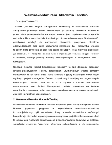 Warmińsko-Mazurska Akademia TenStep 1. Czym jest TenStep™? TenStep (TenStep Project Management Process™) to nowoczesny standard zarządzania przedsięwzięciami biznesowymi (projektami). Narzędzie uznawane przez wielu profesjonalistów na całym świecie jako najskuteczniejszy sposób radzenia sobie w coraz bardziej turbulentnym otoczeniu biznesowym. Skalowalność, genetyczna niechęć do nadmiernej biurokracji, precyzyjnie odpowiedzialność oraz duże uprawnienia zarządcze dla określona kierownika projektu to cechy, które powodują, że jeśli ktoś pozna TenStep™, to już nigdy nie przestanie go stosować. To narzędzie zmienia ludzi i organizacje! Pozwala osiągać sukcesy w biznesie, czyniąc projekty bardziej przewidywalnymi, a zarządzanie nimi łatwiejszym. Standard TenStep Project Management Process™ to opis dziesięciu procesów (dwóch planistycznych i ośmiu zarządczych) uruchamianych według potrzeby opracowany 15 lat temu przez Toma Mochala i grupę skupionych wokół niego wybitnych project managerów. Co roku uzupełniany i rozwijany na programowych konferencjach TenStep. Jest on w 100% zgodny z PMBoK, standardem ustanowionym przez Project Management Institute, największą na świecie organizacją zrzeszającą osoby zawodowo zajmujące się zarządzaniem projektami. Jest jego kompletnym uzupełnieniem. 2. Warmińsko-Mazurska Akademia TenStep Warmińsko-Mazurska Akademia TenStep inicjowana przez Grupę Olsztyńska Szkoła Biznesu to (operatora specjalistyczny cykl programu w warsztatów, województwie który pozwala warmińsko-mazurskim) uczestnikom wyćwiczyć kompetencje niezbędne w profesjonalnym zarządzaniu projektami biznesowymi. Jest to jedyna taka możliwość zapoznania się z licencjonowanym knowhow, w systemie warsztatów otwartych. Uczestnicy otrzymują zaświadczenia o ich ukończeniu. Dodatkowo kurs przygotowuje do międzynarodowego egzaminu certyfikującego Foundation TenStep Project Manager (egzamin nie jest obowiązkowy). Pięć zjazdów jedno- i dwudniowych (osiem dni warsztatowych) w odstępach ok. dwóch tygodni pozwala zastosować ewolucyjny model (spiral model), w którym nabywanie wiedzy i umiejętności jest starannie stopniowane. Warsztaty prowadzone są przez dwóch doświadczonych project managerów1, na co dzień zarządzających komercyjnymi projektami. Uczestnicy pracują na rzeczywistych projektach, a pomiędzy warsztatami mają możliwość konsultacji telefonicznych i mailowych we wszystkich kluczowych obszarach zarządzania projektami (distance learning). 3. Certyfikat Foundation TenStep Project Manager (Fn-TSPM) Foundation Project Manager (Fn-TSPM) jest certyfikatem potwierdzającym, że jego posiadacz zdobył wiedzę w zakresie zasad i procesów wykorzystywanych w zarządzaniu projektami wg standardu TenStep Project Management Porcess. TenStep Academy wraz z partnerami TenStep w Polsce organizuje egzaminy i wydaje certyfikaty. Egzamin odbywa się w Olsztynie. Certyfikat wydawany jest przez TenStep Academy – TenStep Inc., Georgia, USA. Korzyści z posiadania certyfikatu Fn-TSPM Certyfikat Fn-TSPM potwierdza, że jego posiadacz dysponuje większą niż przeciętna wiedzą o zarządzaniu projektami. Certyfikat Fn-TSPM otwiera przed jego posiadaczem możliwości czynnego uczestniczenia w pracach projektowych, co pozwoli na zdobycie praktycznego doświadczenia i rozwoju zawodowego w obszarze zarządzania projektami. Uzyskanie Certyfikatu Fn-TSPM daje jego posiadaczowi pewność siebie, niezbędną do podejmowania rozmów na z kierownikami projektów i innymi interesariuszami. 1 Poniżej 14 uczestników warsztaty prowadzi jedna osoba. zasadach partnerskich Adresaci Osoby, które chcą uzyskać potwierdzenie ich wiedzy w zakresie zarządzania projektami i/lub czynnie uczestniczyć w realizacji projektów. Osoby, które planują swój rozwój zawodowy w obszarach współpracujących z realizatorami projektów. Warunki konieczne do przystąpienia do egzaminu to: Warunkiem przystąpienia do egzaminu jest udział we wszystkich zjazdach. Osoby, które z przyczyn losowych nie będą w stanie uczestniczyć we wszystkich zjazdach zobowiązane są do uzupełnienia materiału wg indywidualnych uzgodnień z prowadzącym warsztat. Egzamin Fn-TSPM Egzamin FN-TSPM jest składany w formie pisemnej, w języku polskim. Podstawą egzaminu jest skrypt zawierający wybrane elementy metodyki TenStep® Project Management Process. Egzamin składa się z 45 pytań testowych jednokrotnego wyboru (tylko jedna odpowiedź jest prawidłowa) i trwa 60 minut. Warunkiem zaliczenia egzaminu jest zdobycie 30 punków przy następujących zasadach punktacji: Każda poprawna odpowiedź daje 1 punkt, Brak odpowiedzi lub odpowiedź błędna lub niejednoznaczna (np. zaznaczenie dwóch odpowiedzi) – 0 punktów. Certyfikacja Fn-TSPM ™ powstała w oparciu o TenStep Project Management, który jest w pełni zgodny z międzynarodowym standardem PMBoKGuide ustanowionym przez Project Management Institute (PMI).
