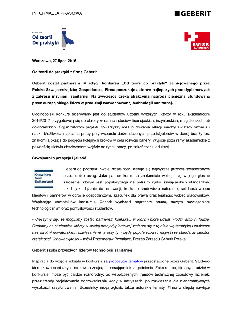 INFORMACJA PRASOWA Warszawa, 27 lipca 2016 Od teorii do praktyki z firmą ą Geberit Geberit został partnerem erem IV edycji konkursu „Od teorii do praktyki" praktyki zainicjowanego przez Polsko-Szwajcarską Izbę Gospodarczą. Gospodarcz . Firma poszukuje autorów najlepszych prac dyplomowych z zakresu inżynierii ierii sanitarnej. Na zwycięzcę zwyci czeka atrakcyjna nagroda pieniężna pieni ufundowana przez europejskiego lidera w produkcji zaawansowanej nsowanej technologii sanitarnej. sanitarnej Ogólnopolski konkurs skierowany jest do studentów uczelni wyższych, wy szych, którzy w roku akademickim 2016/2017 przygotowują ą się ę do obrony w ramach studiów licencjackich, inżynierskic żynierskich, magisterskich lub doktoranckich.. Organizatorom projektu towarzyszy idea budowania relacji między światem biznesu i nauki. Możliwość napisania pracy przy wsparciu doświadczonych do przedsiębiorstw ębiorstw w danej branży bran jest znakomitą okazją do podjęcia ęcia kolejnych kroków w celu rozwoju kariery. Wyjście ście poza ramy akademickie z pewnością ułatwia absolwentom wejście wej na rynek pracy, po zakończeniu czeniu edukacji edukacji. Szwajcarska precyzja i jakość Geberit od początku pocz swojej działalności kieruje się ę najwyższą jakością świadczonych przez siebie usług. Jako partner konkursu znakomicie wpisuje się si w jego główne założenie,, którym jest popularyzacja na polskim rynku szwajcarskich standardów, takich jak:: dążenie dąż do innowacji, troska o środowisko rodowisko naturalne, solidność solidno wobec klientów i partnerów w obrocie gospodarczym, go szacunek dla prawa oraz lojalność lojalno wobec pracowników. Wspierającc uczestników konkursu, Geberit wychodzi naprzeciw nauce, nowym rozwi rozwiązaniom technologicznym hnologicznym oraz pomysłowości pomysłowo studentów. - Cieszymy się, że mogliśmy śmy zostać zosta partnerem konkursu, w którym biorą ą udział młodzi młodzi, ambitni ludzie. Czekamy na studentów, którzy w swojej pracy dyplomowej zmierzą zm się z tą ą niełatwą niełatw tematyką i zaskoczą nas swoimi oimi nowatorskimi rozwiązaniami, rozwią a przy tym będą popularyzowaćć najwy najwyższe standardy jakości, rzetelności i innowacyjności – mówi Przemysław Powalacz, Prezes Zarządu ądu Geberit Polska. Geberit szuka przyszłych liderów technologii sanitarnej Inspiracją do wzięcia cia udziału w konkursie konkurs są propozycje tematów przedstawione przez Geberit. Studenci kierunków technicznych na pewno znajdą znajd interesujące ich zagadnienia. Zakres prac, p biorących udział w konkursie, może byćć bardzo ró różnorodny: od współczesnych trendów technicznej zabudowy łazienek, łazienek przez trendy projektowania odprowadzania wody w natryskach, po rozwiązania ązania dla nienormatywnych nienorma wysokości ci zasyfonowania. Uczestnicy mogą mog zgłosić także e autorskie tematy. Firma z chęcią nawiąże INFORMACJA PRASOWA kontakty ty ze studentami i wesprze ich przy tworzeniu pracy naukowej,, oferując oferują konsultacje z ekspertami marki Geberit. Na laureata czeka nagroda w wysokości wysoko 10 000 tysięcy cy złotych. Do końca listopada 2016 można moż zarejestrować się w pierwszym etapie konkursu. Wystarczy wysłać wysła formularz zgłoszeniowy, zawierający zawieraj temat pracy wybrany z puli tematów przygotowanej przez firmę firm lub własną propozycję, a także że jednostronicowy zarys koncepcyjny całości.. W drugim etapie zmagań nagrodzone zostaną najlepsze obronione prace dyplomowe, napisane w ramach konkursu. Partnerami tegorocznej edycji konkursu, prócz firmy Geberit, zostały takie marki, jak: Fracht FWO Polska, Franke Polska, Mensys, Stämpfli, Swissmed oraz Zehnder. Więcej cej szczegółów o konkursie znajduje się na stronie: www.odteoriidopraktyki.pl. www.odteoriidopraktyki.pl Informacje o Grupie Geberit rit Grupa Geberit to europejski lider w produkcji zaawansowanej technologii sanitarnej. Od momentu jej powstania w roku 1874 jest pionierem w tym sektorze, nieprzerwanie ustanawiając ustanawiaj c nowe trendy swoimi wszechstronnymi rozwiązaniami. rozwią Geberit posiada swoje przedstawicielstwa w ponad 40 krajach w Europie i na świecie, skupia w swoich zasobach 35 zakładów zakład produkcyjnych. Największe zakłady znajdują się w Szwajcarii, Niemczech i Austrii. Siedziba główna znajduje się si w Rapperswil-Jona Rapperswil w Szwajcarii, a sama firma jest notowana na Szwajcarskiej Giełdzie Papierów Wartościowych Warto ciowych w Zurychu od 1999 r. Grupa Geberit wygenerowała sprzedaż sprzeda w wysokości ci 2,6 mld franków szwajcarskich zatrudniaj zatrudniającc ponad 12.000 pracowników. Zakres produktów obejmuje lini linię systemów sanitarnych (systemy instalacyjne, spłuczki, baterie umywalkowe, systemy spłukiwania, syfony, toalety myjące), myj wyposażenie łazienek (ceramikę sanitarną, ą,, meble łazienkowe, kabiny i wanny) oraz systemy rurowe (systemy wodoci wodociągowe i systemy kanalizacyjne). Kontakt dla mediów 38PR & Content Communication Martyna Solińska, ska, Tel. 502 690 101, [email protected] Alicja Dutkiewicz, Tel. 502 916 813, [email protected] 2