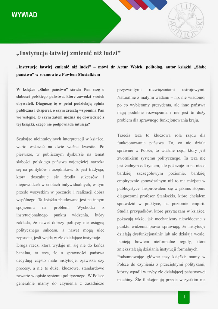 WYWIAD „Instytucje łatwiej zmienić niż ludzi” „Instytucje łatwiej zmienić niż ludzi” – mówi dr Artur Wołek, politolog, autor książki „Słabe państwo” w rozmowie z Pawłem Musiałkiem W książce „Słabe państwo” stawia Pan tezę o przyzwoitymi słabości polskiego państwa, które zawodzi swoich Naturalnie z małymi wadami – np. nie wiadomo, obywateli. Diagnozę tę w pełni podzielają opinia po co wybieramy prezydenta, ale inne państwa publiczna i eksperci, o czym zresztą wspomina Pan mają podobne rozwiązania i nie jest to duży we wstępie. O czym zatem można się dowiedzieć z tej książki, czego nie podpowiada intuicja? Szukając nieintuicyjnych interpretacji w książce, warto wskazać na dwie ważne kwestie. Po pierwsze, w publicznym dyskursie na temat słabości polskiego państwa najczęściej narzeka się na polityków i urzędników. To jest tradycja, która doszukuje się źródła sukcesów i niepowodzeń w cnotach indywidualnych, w tym przede wszystkim w poczuciu i realizacji dobra wspólnego. Ta książka zbudowana jest na innym spojrzeniu na instytucjonalnego problem. punktu Wychodzi widzenia, z który zakłada, że nawet dobrzy politycy nie osiągną politycznego sukcesu, a nawet mogą ulec zepsuciu, jeśli wejdą w źle działające instytucje. Druga rzecz, która wydaje mi się nie do końca banalna, to teza, że o sprawności państwa decydują często małe instytucje, zjawiska czy procesy, a nie te duże, kluczowe, standardowo zawarte w opisie systemu politycznego. W Polsce generalnie mamy do czynienia z zasadniczo rozwiązaniami ustrojowymi. problem dla sprawnego funkcjonowania kraju. Trzecia teza to kluczowa rola rządu dla funkcjonowania państwa. To, co nie działa sprawnie w Polsce, to właśnie rząd, który jest zwornikiem systemu politycznego. Ta teza nie jest żadnym odkryciem, ale pokazuję to na nieco bardziej szczegółowym poziomie, bardziej empirycznie sprawdzalnym niż to ma miejsce w publicystyce. Inspirowałem się w jakimś stopniu diagnozami profesor Staniszkis, które chciałem sprawdzić w praktyce, na poziomie empirii. Studia przypadków, które przytaczam w książce, pokazują także, jak mechanizmy niewidoczne z punktu widzenia prawa sprawiają, że instytucje działają dysfunkcjonalnie lub nie działają wcale. Istnieją bowiem nieformalne reguły, które zniekształcają działania instytucji formalnych. Podsumowując główne tezy książki: mamy w Polsce do czynienia z przeciętnymi politykami, którzy wpadli w tryby źle działającej państwowej machiny. Źle funkcjonują przede wszystkim nie 1 WYWIAD duże instytucje konstytucyjne, ale te mniejsze z faktycznie wpuścili, poziomu operacyjnego. Na wszystkie wpływają wpuszczeni, raczej ulegali zmianie niż byli jej dodatkowo kreatorami. kwestią reguły jest nieformalne. niesprawność Kluczową rządu ale ci, którzy zostali jako mechanizmu podejmowania najważniejszych w Nie może być tak, że reguły instytucjonalne państwie decyzji. sprawiają, iż człowiekowi nie opłaca się być uczciwym czy kreatywnym. O ile z uczciwością Stawia Pan tezę, że większy wpływ na psucie w Polsce jest chyba nie najgorzej, bo mamy do systemu mają instytucje państwa, a nie czynienia z post-katolickim społeczeństwem, aktorzy, którzy w tych instytucjach pracują. które czuje, że branie „w łapę” jest nie w Czy nie jest jednak odwrotnie? Czy to nie porządku, o tyle kreatywni urzędnicy z zasady nie instytucje zostały skorumpowane w wyniku są działań ich członków? przeciwnie. Wielu urzędników to kompetentni premiowani za innowacyjność, raczej ludzie, którzy chcą dobrze wykonywać swoją To jest trochę dylemat: jajo czy kura. Bobrzyński pracę, mają dobre pomysły, jednak nie mogą się z pisał kiedyś, że nawet jeśli jego diagnoza o nimi przedrzeć. I nie jest to tylko kwestia ich słabości rządu w Polsce jest tylko częściowo przełożonych, ale właśnie reguł instytucji, która słuszna, to i tak będzie to cenny dodatek do jest wszelkich przez problemów, a każda innowacja jest problemem. poetów i księży. Niewątpliwie rację mają ci, Sprawna instytucja musi być miejscem, gdzie w którzy człowieku wzmacnia się to, co sprzyja dobru historii wskazują Polski na napisanych korumpującą państwo korupcję jednostek. Uważam jednak, że ludzie skonstruowana tak, aby nie stwarzać publicznemu, a nie tępi. zmieniają się trudniej niż instytucje, dlatego reformy powinny skupić się na zmianach Czy nie jest jednak tak, że jest pewien instytucjonalnych. Jeżeli instytucje zachęcają do moment, w którym konkretna osoba podjęła działań sprzecznych z interesem państwa, gdy konkretne interesy urzędników są sprzeczne z interesem dysfunkcjonalną? działanie, czyniące instytucję państwa, to trudno wierzyć w to, jak swego czasu postulowali Kaczyński z Dornem, że wystarczy Czasem tak jest, ale częściej mamy do czynienia tysiąc prawych wpuścić na kluczowe stanowiska z logiką działania zbiorowego. To nie jest do i ten tysiąc zmieni wszystko. Nie wiem, ilu końca działanie jednej osoby, która przekręca 2 WYWIAD zwrotnicę, lecz suma pewnych codziennych geograficzny sprzeczności. Każdy dba o swoje interesy, porównań. Jak Polska wypada na tle regionu czasem sprzeczne z interesem publicznym, a pod względem sprawności państwa? czasem nie. Trzeba umożliwić stanowi naturalne pole ludziom synchronizację ich prywatnych interesów z Odpowiedź jest niejednoznaczna, co uwidocznia interesem publicznym. się w różnych rankingach środkowoeuropejskich. Czy w takiej sytuacji można określić dla polityków jakiś przydatny model, Polska nie krajów jest ani liderem, ani outsiderem regionu. który pozwoli wyjaśnić, jakie czynniki powodują Czy mamy jakiegoś wyraźnego lidera? pozytywny rozwój instytucjonalny państwa, a jakie potęgują jego degenerację? Zdecydowanie jest nim Estonia. Pod względem