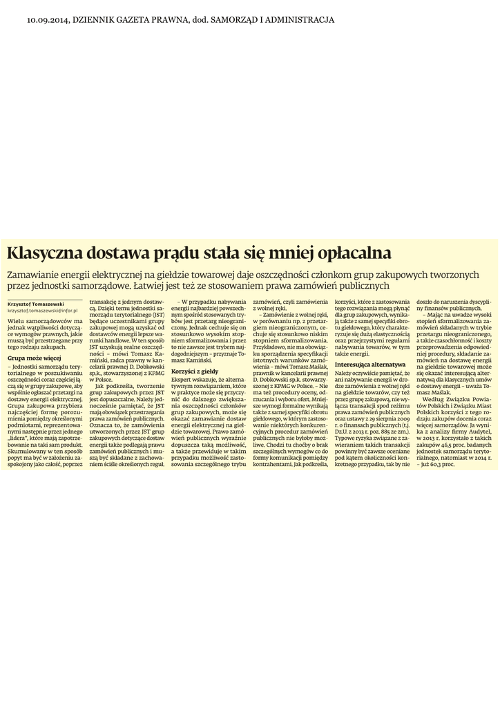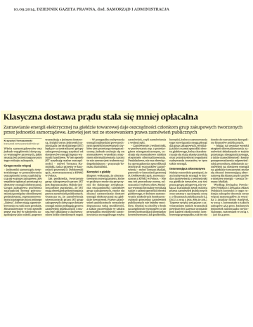 10.09.2014, DZIENNIK GAZETA PRAWNA, dod. SAMORZĄD I ADMINISTRACJA Klasyczna dostawa prądu stała się mniej opłacalna Zamawianie energii elektrycznej na giełdzie towarowej daje oszczędności członkom grup zakupowych tworzonych przez jednostki samorządowe. Łatwiej jest też ze stosowaniem prawa zamówień publicznych Krzysztof Tomaszewski [email protected] Wielu samorządowców ma jednak wątpliwości dotyczące wymogów prawnych, jakie muszą być przestrzegane przy tego rodzaju zakupach. Grupa może więcej – Jednostki samorządu terytorialnego w poszukiwaniu oszczędności coraz częściej łączą się w grupy zakupowe, aby wspólnie ogłaszać przetargi na dostawy energii elektrycznej. Grupa zakupowa przybiera najczęściej formę porozumienia pomiędzy określonymi podmiotami, reprezentowanymi następnie przez jednego „lidera”, które mają zapotrzebowanie na taki sam produkt. Skumulowany w ten sposób popyt ma być w założeniu zaspokojony jako całość, poprzez transakcję z jednym dostawcą. Dzięki temu jednostki samorządu terytorialnego (JST) będące uczestnikami grupy zakupowej mogą uzyskać od dostawców energii lepsze warunki handlowe. W ten sposób JST uzyskują realne oszczędności – mówi Tomasz Kamiński, radca prawny w kancelarii prawnej D. Dobkowski sp.k., stowarzyszonej z KPMG w Polsce. Jak podkreśla, tworzenie grup zakupowych przez JST jest dopuszczalne. Należy jednocześnie pamiętać, że JST mają obowiązek przestrzegania prawa zamówień publicznych. Oznacza to, że zamówienia utworzonych przez JST grup zakupowych dotyczące dostaw energii także podlegają prawu zamówień publicznych i muszą być składane z zachowaniem ściśle określonych reguł. – W przypadku nabywania energii najbardziej powszechnym spośród stosowanych trybów jest przetarg nieograniczony. Jednak cechuje się on stosunkowo wysokim stopniem sformalizowania i przez to nie zawsze jest trybem najdogodniejszym – przyznaje Tomasz Kamiński. Korzyści z giełdy Ekspert wskazuje, że alternatywnym rozwiązaniem, które w praktyce może się przyczynić do dalszego zwiększania oszczędności członków grup zakupowych, może się okazać zamawianie dostaw energii elektrycznej na giełdzie towarowej. Prawo zamówień publicznych wyraźnie dopuszcza taką możliwość, a także przewiduje w takim przypadku możliwość zastosowania szczególnego trybu zamówień, czyli zamówienia z wolnej ręki. – Zamówienie z wolnej ręki, w porównaniu np. z przetargiem nieograniczonym, cechuje się stosunkowo niskim stopniem sformalizowania. Przykładowo, nie ma obowiązku sporządzenia specyfikacji istotnych warunków zamówienia – mówi Tomasz Maślak, prawnik w kancelarii prawnej D. Dobkowski sp.k. stowarzyszonej z KPMG w Polsce. – Nie ma też procedury oceny, odrzucania i wyboru ofert. Mniejsze wymogi formalne wynikają także z samej specyfiki obrotu giełdowego, w którym zastosowanie niektórych konkurencyjnych procedur zamówień publicznych nie byłoby możliwe. Chodzi tu choćby o brak szczególnych wymogów co do formy komunikacji pomiędzy kontrahentami. Jak podkreśla, korzyści, które z zastosowania tego rozwiązania mogą płynąć dla grup zakupowych, wynikają także z samej specyfiki obrotu giełdowego, który charakteryzuje się dużą elastycznością oraz przejrzystymi regułami nabywania towarów, w tym także energii. Interesująca alternatywa Należy oczywiście pamiętać, że ani nabywanie energii w drodze zamówienia z wolnej ręki na giełdzie towarów, czy też przez grupę zakupową, nie wyłącza transakcji spod reżimu prawa zamówień publicznych oraz ustawy z 29 sierpnia 2009 r. o finansach publicznych (t.j. Dz.U. z 2013 r. poz. 885 ze zm.). Typowe ryzyka związane z zawieraniem takich transakcji powinny być zawsze oceniane pod kątem okoliczności konkretnego przypadku, tak by nie doszło do naruszenia dyscypliny finansów publicznych. – Mając na uwadze wysoki stopień sformalizowania zamówień składanych w trybie przetargu nieograniczonego, a także czasochłonność i koszty przeprowadzenia odpowiedniej procedury, składanie zamówień na dostawę energii na giełdzie towarowej może się okazać interesującą alternatywą dla klasycznych umów o dostawy energii – uważa Tomasz Maślak. Według Związku Powiatów Polskich i Związku Miast Polskich korzyści z tego rodzaju zakupów docenia coraz więcej samorządów. Ja wynika z analizy firmy Audytel, w 2013 r. korzystało z takich zakupów 46,5 proc. badanych jednostek samorządu terytorialnego, natomiast w 2014 r. – już 60,3 proc.