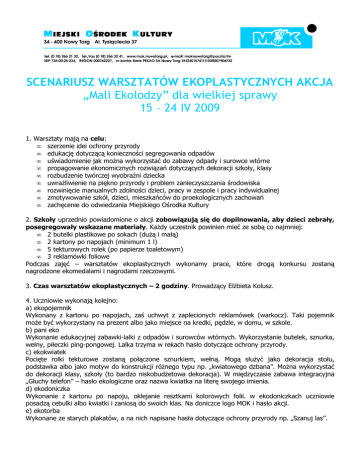 SCENARIUSZ WARSZTATÓW EKOPLASTYCZNYCH AKCJA „Mali Ekolodzy” dla wielkiej sprawy 15 – 24 IV 2009 1. Warsztaty mają na celu: • szerzenie idei ochrony przyrody • edukację dotyczącą konieczności segregowania odpadów • uświadomienie jak moŜna wykorzystać do zabawy odpady i surowce wtórne • propagowanie ekonomicznych rozwiązań dotyczących dekoracji szkoły, klasy • rozbudzenie twórczej wyobraźni dziecka • uwraŜliwienie na piękno przyrody i problem zanieczyszczania środowiska • rozwinięcie manualnych zdolności dzieci, pracy w zespole i pracy indywidualnej • zmotywowanie szkół, dzieci, mieszkańców do proekologicznych zachowań • zachęcenie do odwiedzania Miejskiego Ośrodka Kultury 2. Szkoły uprzednio powiadomione o akcji zobowiązują się do dopilnowania, aby dzieci zebrały, posegregowały wskazane materiały. KaŜdy uczestnik powinien mieć ze sobą co najmniej: • 2 butelki plastikowe po sokach (duŜą i małą) • 2 kartony po napojach (minimum 1 l) • 5 tekturowych rolek (po papierze toaletowym) • 3 reklamówki foliowe Podczas zajęć – warsztatów ekoplastycznych wykonamy prace, które drogą konkursu zostaną nagrodzone ekomedalami i nagrodami rzeczowymi. 3. Czas warsztatów ekoplastycznych – 2 godziny. Prowadzący ElŜbieta Kolusz. 4. Uczniowie wykonają kolejno: a) ekopojemnik Wykonany z kartonu po napojach, zaś uchwyt z zaplecionych reklamówek (warkocz). Taki pojemnik moŜe być wykorzystany na prezent albo jako miejsce na kredki, pędzle, w domu, w szkole. b) pani eko Wykonanie edukacyjnej zabawki-lalki z odpadów i surowców wtórnych. Wykorzystanie butelek, sznurka, wełny, piłeczki ping-pongowej. Lalka trzyma w rekach hasło dotyczące ochrony przyrody. c) ekokwiatek Pocięte rolki tekturowe zostaną połączone sznurkiem, wełną. Mogą słuŜyć jako dekoracja stołu, podstawka albo jako motyw do konstrukcji róŜnego typu np. „kwiatowego dzbana”. MoŜna wykorzystać do dekoracji klasy, szkoły (to bardzo niskobudŜetowa dekoracja). W międzyczasie zabawa integracyjna „Głuchy telefon” – hasło ekologiczne oraz nazwa kwiatka na literę swojego imienia. d) ekodoniczka Wykonanie z kartonu po napoju, oklejanie resztkami kolorowych folii. w ekodoniczkach uczniowie posadzą cebulki albo kwiatki i zaniosą do swoich klas. Na doniczce logo MOK i hasło akcji. e) ekotorba Wykonane ze starych plakatów, a na nich napisane hasła dotyczące ochrony przyrody np. „Szanuj las”.