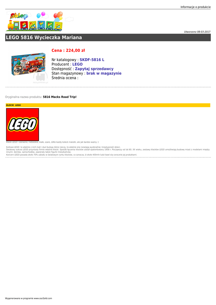 Informacje o produkcie Utworzono 08-03-2017 LEGO 5816 Wycieczka Mariana Cena : 224,00 zł Nr katalogowy : SKDF-5816 L Producent : LEGO Dostępność : Zapytaj sprzedawcy Stan magazynowy : brak w magazynie Średnia ocena : Oryginalna nazwa produktu: 5816 Macks Road Trip! KLOCKI LEGO Klocki LEGO czerwone, niebieskie, białe, szare, żółte każdy koleck malutki, ale jak bardzo ważny :) Kultowe LEGO to właśnie z nich mali i duzi budują różne rzeczy, to właśnie one rozwijają wyobraźnię i kreatywność dzieci. Światowy sukces LEGO przyniosły firmie właśnie klocki. Sposób łączenia klocków został opatentowany 1958 r. Począwszy od lat 60. XX wieku, zestawy klocków LEGO umożliwiają budowę miast z modelami między innymi: domów, samochodów, zawierały także figurki mieszkańców. Koncern LEGO posiada około 70% udziału w światowym rynku klocków, co oznacza, iż około 400mln ludzi bawi się corocznie jej produktami. Wygenerowano w programie www.oscGold.com