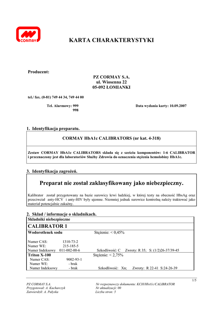 KARTA CHARAKTERYSTYKI Producent: PZ CORMAY S.A. ul. Wiosenna 22 05-092 ŁOMIANKI tel./ fax. (0-81) 749 44 34, 749 44 00 Tel. Alarmowy: 999 998 Data wydania karty: 10.09.2007 1. Identyfikacja preparatu. CORMAY HbA1c CALIBRATORS (nr kat. 4-318) Zestaw CORMAY HbA1c CALIBRATORS składa się z sześciu komponentów: 1-6 CALIBRATOR i przeznaczony jest dla laboratoriów SłuŜby Zdrowia do oznaczenia stęŜenia hemolobiny HbA1c. 3. Identyfikacja zagroŜeń. Preparat nie został zaklasyfikowany jako niebezpieczny. Kalibrator został przygotowany na bazie surowicy krwi ludzkiej, w której testy na obecność HbsAg oraz przeciwciał anty-HCV i anty-HIV były ujemne. Niemniej jednak surowice kontrolną naleŜy traktować jako materiał potencjalnie zakaźny. 2. Skład / informacje o składnikach. Składniki niebezpieczne CALIBRATOR 1 Wodorotlenek sodu Numer CAS: Numer WE: Numer Indeksowy StęŜenie: < 0,45% 1310-73-2 215-185-5 011-002-00-6 Triton X-100 Numer CAS: Numer WE: Numer Indeksowy Szkodliwość: C Zwroty: R 35; S: (1/2)26-37/39-45 StęŜenie: < 2,75% 9002-93-1 - brak - brak Szkodliwość: Xn; Zwroty: R 22-41 S:24-26-39 1/5 PZ CORMAY S.A. Przygotował: A. Kucharczyk Zatwierdził: A. Pałyska Nr rozpoznawczy dokumentu: KCH/HbA1c/CALIBRATOR Nr aktualizacji: 00 Liczba stron: 5 CALIBRATOR 2-6 Preparat nie zawiera substancji niebezpiecznych 4. Pierwsza pomoc. Po naraŜeniu drogą oddechową: świeŜe powietrze, skonsultować się z lekarzem Po zanieczyszczeniu skóry: zmyć duŜą ilością wody z mydłem. Zdjąć skaŜoną odzieŜ. Po zanieczyszczeniu oczu: wypłukać duŜą ilością wody. W przypadku utrzymywania się podraŜnienia oczu skonsultować się z lekarzem. Po spoŜyciu: podać poszkodowanemu do picia duŜą ilość wody, JeŜeli czuje się niezdrowo, skonsultować się z lekarzem. 5. Postępowanie w przypadku poŜaru: Odpowiednie środki gaśnicze: woda, piana, proszek, CO2 Odpowiednio do materiałów magazynowanych w bezpośrednim sąsiedztwie. Preparat jest niepalny. 6. Postępowanie w przypadku niezamierzonego uwolnienia do środowiska: Środki zapobiegawcze związane z personelem: Unikać zanieczyszczenia preparatem. Procedury czyszczenia / absorpcji: Małe ilości zebrać za pomocą środków wchłaniających, jeśli to będzie konieczne spłukać duŜą ilością wody. 7. Postępowanie z preparatem i jego magazynowanie: Postępowanie: Zgodnie z ogólnie przyjętymi normami dla chemikaliów w laboratoriach. Produkt do uŜytku in vitro, nie pipetować ustami. Przechowywanie: Szczelnie zamknięte w oryginalnych opakowaniach producenta w temperaturze 2-8oC. Chronić przed światłem. 8. Kontrola naraŜenia i środki ochrony indywidualnej: Właściwy parametr kontroli: Rozporządzenie MPiPS, Dz. U.2002 Nr 217, poz. 1833 Osobiste wyposaŜenie kontrolne: Dróg oddechowych: nie wymagana Oczu: wymagana (okulary ochronne) Rąk wymagana (rękawice ochronne gumowe lub lateksowe) Higiena przemysłowa: Zmienić skaŜoną odzieŜ. Po pracy z substancją umyć ręce. 2/5 PZ CORMAY S.A. Przygotował: A. Kucharczyk Zatwierdził: A. Pałyska Nr rozpoznawczy dokumentu: KCH/HbA1c/CALIBRATOR Nr aktualizacji: 00 Liczba stron: 5 9. Właściwości fizyczne i chemiczne. Postać: Kolor: Zapach: Temp. wrzenia: Temp. topnienia: Temp. zapłonu: Palność: Gęstość: pH: CALIBRATOR 1 roztwór ciemny zielony bezwonny brak dostępnych danych brak dostępnych danych brak dostępnych danych brak dostępnych danych brak dostępnych danych 13 CALIBRATOR 2-6 roztwór bezbarwny do Ŝółtego bezwonny brak dostępnych danych brak dostępnych danych brak dostępnych danych brak dostępnych danych brak dostępnych danych 3 10. Stabilność i reaktywność: Warunki, których naleŜy unikać: Preparat jest stabilny w warunkach przewidzianych przez producenta. Unikać nadmiernego ogrzania. Substancje, których naleŜy unikać: Silne kwasy im metale cięŜkie. Niebezpieczne produkty rozkładu: Brak dostępnych danych. Dalsze informacje: Produkt stabilizowany. 11. Informacje toksykologiczne: Toksyczność ostra: Brak dostępnych danych ilościowych o toksyczności tego preparatu. Dalsze informacje toksykologiczne: Nie naleŜy oczekiwać działania toksycznego przy właściwym posługiwaniu się tym produktem. Dalsze dane: Produktem naleŜy posługiwać się z ostroŜnością zwykłą dla chemikaliów. 12. Informacje ekologiczne: Działanie ekotoksyczne: Nie są dostępne dane ilościowe o działaniu ekologicznym tego preparatu. Dalsze dane ekologiczne: Nie naleŜy oczekiwać problemów ekologicznych przy właściwym posługiwaniu się i stosowaniu produktu z właściwą ostroŜnością i uwagą. 13. Postępowanie z odpadami: Produkt: Pozostałości chemiczne w ogólności zaliczane są do odpadów specjalnych. Usuwanie tych ostatnich regulowane jest przez odpowiednie przepisy i zarządzenia. Zalecamy skontaktowanie się z odnośnymi władzami lub przedsiębiorstwami usuwania odpadów, które doradzą Państwu jak usuwać odpady specjalne. Opakowanie: Usuwać zgodnie z obowiązującymi przepisami. Zanieczyszczone opakowania traktować w taki sam sposób, jak samą substancję. JeŜeli przepisy nie stanowią inaczej, to nie zanieczyszczone opakowania moŜna traktować jak odpady z gospodarstw domowych lub skierować do utylizacji. 3/5 PZ CORMAY S.A. Przygotował: A. Kucharczyk Zatwierdził: A. Pałyska Nr rozpoznawczy dokumentu: KCH/HbA1c/CALIBRATOR Nr aktualizacji: 00 Liczba stron: 5 14. Informacje o transporcie: Nie podlega przepisom transportowym. 15. Informacje dotyczące przepisów prawnych: Znakowanie: Nie dotyczy. Karta charakterystyki została przygotowana zgodnie z przepisami Wspólnoty Europejskiej: Wytycznymi Dyrektywy UE2001/58/WE, UE Nr 1999/45/EC, Dyrektywy 67/548/EC, Dyrektywy UE 88/379/EEC oraz Dyrektywy UE 91/155/EEC (Dangerous Product Regulations incl. EC Guidelines), dotyczącymi klasyfikowania, oznaczania i sporządzania informacji o materiałach niebezpiecznych. Ustawą o substancjach i preparatach chem