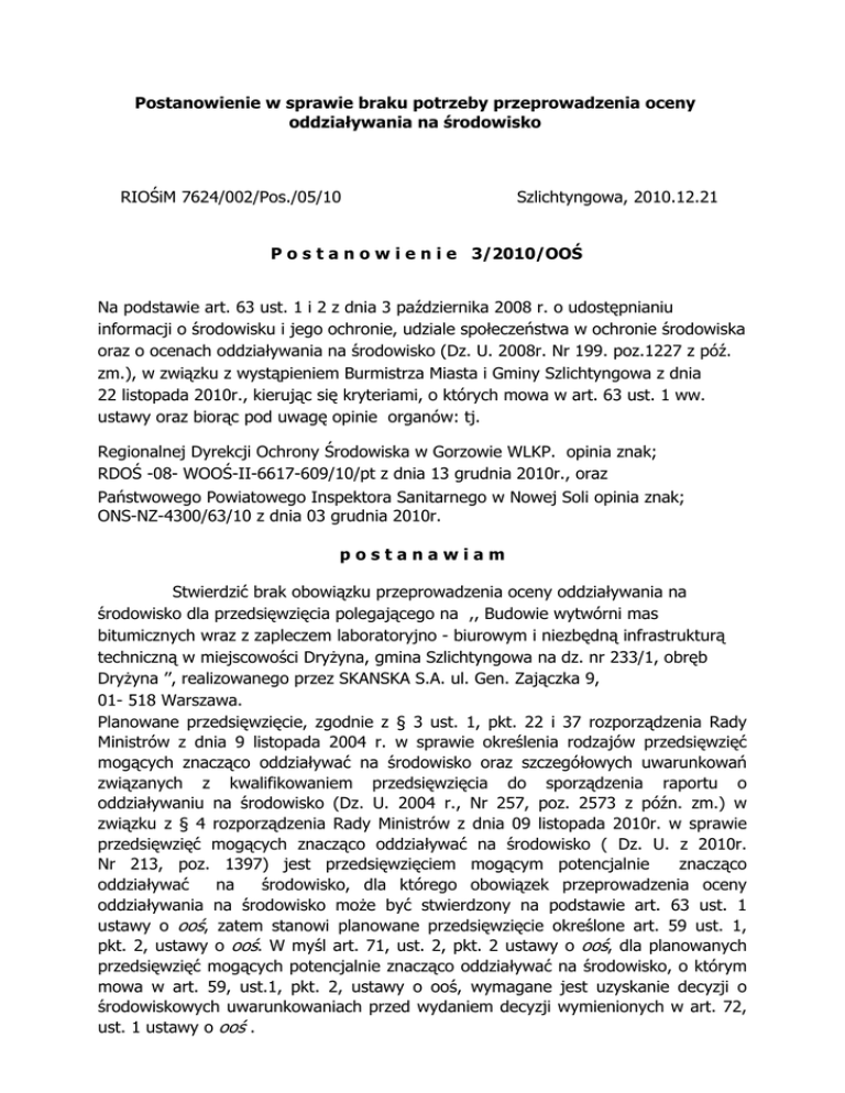 Postanowienie w sprawie braku potrzeby przeprowadzenia oceny oddziaływania na środowisko RIOŚiM 7624/002/Pos./05/10 Szlichtyngowa, 2010.12.21 P o s t a n o w i e n i e 3/2010/OOŚ Na podstawie art. 63 ust. 1 i 2 z dnia 3 października 2008 r. o udostępnianiu informacji o środowisku i jego ochronie, udziale społeczeństwa w ochronie środowiska oraz o ocenach oddziaływania na środowisko (Dz. U. 2008r. Nr 199. poz.1227 z póź. zm.), w związku z wystąpieniem Burmistrza Miasta i Gminy Szlichtyngowa z dnia 22 listopada 2010r., kierując się kryteriami, o których mowa w art. 63 ust. 1 ww. ustawy oraz biorąc pod uwagę opinie organów: tj. Regionalnej Dyrekcji Ochrony Środowiska w Gorzowie WLKP. opinia znak; RDOŚ -08- WOOŚ-II-6617-609/10/pt z dnia 13 grudnia 2010r., oraz Państwowego Powiatowego Inspektora Sanitarnego w Nowej Soli opinia znak; ONS-NZ-4300/63/10 z dnia 03 grudnia 2010r. postanawiam Stwierdzić brak obowiązku przeprowadzenia oceny oddziaływania na środowisko dla przedsięwzięcia polegającego na ,, Budowie wytwórni mas bitumicznych wraz z zapleczem laboratoryjno - biurowym i niezbędną infrastrukturą techniczną w miejscowości Dryżyna, gmina Szlichtyngowa na dz. nr 233/1, obręb Dryżyna ’’, realizowanego przez SKANSKA S.A. ul. Gen. Zajączka 9, 01- 518 Warszawa. Planowane przedsięwzięcie, zgodnie z § 3 ust. 1, pkt. 22 i 37 rozporządzenia Rady Ministrów z dnia 9 listopada 2004 r. w sprawie określenia rodzajów przedsięwzięć mogących znacząco oddziaływać na środowisko oraz szczegółowych uwarunkowań związanych z kwalifikowaniem przedsięwzięcia do sporządzenia raportu o oddziaływaniu na środowisko (Dz. U. 2004 r., Nr 257, poz. 2573 z późn. zm.) w związku z § 4 rozporządzenia Rady Ministrów z dnia 09 listopada 2010r. w sprawie przedsięwzięć mogących znacząco oddziaływać na środowisko ( Dz. U. z 2010r. Nr 213, poz. 1397) jest przedsięwzięciem mogącym potencjalnie znacząco oddziaływać na środowisko, dla którego obowiązek przeprowadzenia oceny oddziaływania na środowisko może być stwierdzony na podstawie art. 63 ust. 1 ustawy o ooś, zatem stanowi planowane przedsięwzięcie określone art. 59 ust. 1, pkt. 2, ustawy o ooś. W myśl art. 71, ust. 2, pkt. 2 ustawy o ooś, dla planowanych przedsięwzięć mogących potencjalnie znacząco oddziaływać na środowisko, o którym mowa w art. 59, ust.1, pkt. 2, ustawy o ooś, wymagane jest uzyskanie decyzji o środowiskowych uwarunkowaniach przed wydaniem decyzji wymienionych w art. 72, ust. 1 ustawy o ooś . uzasadnienie Z wnioskiem o wydanie decyzji środowiskowych uwarunkowania zgody na realizację przedsięwzięcia pn. ,, SKANSKA S.A. ul. Gen. Zajączka 9, 01- 518 Warszawa. Planowane przedsięwzięcie, zgodnie z § 3 ust. 1, pkt. 22 i 37 rozporządzenia Rady Ministrów z dnia 9 listopada 2004 r. w sprawie określenia rodzajów przedsięwzięć mogących znacząco oddziaływać na środowisko oraz szczegółowych uwarunkowań związanych z kwalifikowaniem przedsięwzięcia do sporządzenia raportu o oddziaływaniu na środowisko (Dz. U. 2004 r., Nr 257, poz. 2573 z późn. zm.) w związku z § 4 rozporządzenia Rady Ministrów z dnia 09 listopada 2010r. w sprawie przedsięwzięć mogących znacząco oddziaływać na środowisko ( Dz. U. z 2010r. Nr 213, poz. 1397) jest przedsięwzięciem mogącym potencjalnie znacząco oddziaływać na środowisko. Zgodnie z art. 64, ust. 1 ustawy z dnia 3 października 2008 r. o udostępnianiu informacji o środowisku i jego ochronie, udziale społeczeństwa w ochronie środowiska oraz o ocenach oddziaływania na środowisko organ prowadzący postępowanie wystąpił o wydanie opinii, co do potrzeby przeprowadzenia oceny oddziaływania na środowisko dla planowanego przedsięwzięcia do Regionalnego Dyrektora Ochrony Środowiska w Gorzowie Wlkp. oraz Państwowego Powiatowego Inspektora Sanitarnego w Nowej Soli. Organy te wydały opinie: Regionalnej Dyrekcji Ochrony Środowiska w Gorzowie WLKP. pismem znak; RDOŚ -08- WOOŚ-II-6617-609/10/pt z dnia 13 grudnia 2010r., wydał opinię, że dla przedmiotowego przedsięwzięcia nie ma konieczności przeprowadzenia oceny oddziaływania na środowisko. Państwowego Powiatowego Inspektora Sanitarnego w Nowej Soli pismem znak; ONS-NZ-4300/63/10 z dnia 03 grudnia 2010r., wydał opinię , że zachodzi potrzeba przeprowadzenia oceny oddziaływania na środowisko dla tego przedsięwzięcia, a konieczny raport o oddziaływaniu przedsięwzięcia na środowisko może zostać pomniejszony o zapisy zawarte w art. 66, ust.1, pkt. 4 ustawy o ooś. Planowane przedsięwzięcie polegać będzie na budowie wytwórni mas bitumicznych wraz z zapleczem laboratoryjno - biurowym i niezbędną infrastrukturą techniczną w miejscowości Dryżyna, gmina Szlichtyngowa na dz. nr 233/1, obręb Dryżyna ’’. Celem przedsięwzięcia jest budowa wytwórni mas bitumicznych o wydajności 240 mg/h, wraz z zapleczem laboratoryjno-biurowym oraz niezbędną infrastrukturą techniczną. Projektowane przedsięwzięcie składać się będzie z następujących obiektów: - instalacji do produkcji masy bitumicznej, biura kontenerowego (5 segmentów), laboratorium (6 segmentów), parkingu dla samochodów osobowych, dróg wewnętrznych, linii odwodnienia powierzchni utwardzonych z osadnikami zawiesiny i separatorem koalesacyjnym oraz zbiornikiem bezodpływowym. Podstawowymi elementami instalacji do produkcji mas bitumicznych będą: - dozator kruszywa, - przenośniki taśmowe, - suszarka kruszywa wyposażona w palnik o maksymalnej wydajności 20 MW spalający węglowy i olej opałowy, - mieszalnik kruszywa, - sortownik kruszywa, - 4 zbiorniki asfaltu o pojemności około 60 m3 każdy, - 2 silosy wypełniaczy o pojemności około 40 m3 każdy, - zbiornik gotowej masy o pojemności 200 Mg, - silos o pojemności 120 m3 do magazynowania pyłu węglowego, - zbiornik dwupłaszczowy o pojemności 40 m3 do magazynowania oleju opało