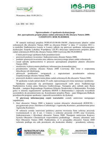 Warszawa, dnia 19.09.2013 r. Ldz. BM / 66 / 2013 Sprawozdanie z I spotkania dyskusyjnego dot. sporządzania projekt planu zadań ochronnych dla obszaru Natura 2000: CZERWONY BÓR PLH200018 W ramach realizacji projektu POIS.05.03.00-00-186/09 „Opracowanie planów zadań ochronnych dla obszarów Natura 2000 na obszarze Polski" w dniu 17 września 2013 r. w siedzibie Nadleśnictwa Łomża w Łomży odbyło się pierwsze spotkanie informacyjnodyskusyjne Zespołu Lokalnej Współpracy (ZLW) dotyczące opracowania projektu planu zadań ochronnych (PZO) dla obszaru Natura 2000 Czerwony Bór PLH200018. Celem pierwszego spotkania było przedstawienie: - prawnych podstaw tworzenia i funkcjonowania obszaru Natura 2000, - podstaw prawnych tworzenia oraz zakresu merytorycznego planu zadań ochronnych, - zasad udziału społeczeństwa w procesie sporządzania projektów planów obszarów Natura 2000, - możliwości wykorzystania platformy informacyjno-komunikacyjnej, - przedmiotów ochrony obszaru Natura 2000 Czerwony Bór wraz z rozpoznaną dotychczas ich lokalizacją, - głównych problemów związanych z zagrożeniami przedmiotów ochrony rozpatrywanego obszaru Natura 2000, - prawnych skutków ustanowienia planu zadań ochronnych dla obszarów Natura 2000. W spotkaniu wzięło udział około 35 osób, reprezentujących różne instytucje i podmioty. Spotkanie rozpoczęło się powitaniem zaproszonych osób przez Nadleśniczego Nadleśnictwa Łomża pana Dariusza Godlewskiego. Następnie głos zabrała pani Beata Bezubik – zastępca Regionalnego Dyrektora Ochrony Środowiska w Białymstoku. Powitała gości w imieniu organizatorów spotkania (RDOŚ w Białymstoku) i zaprosiła wszystkich uczestników do przedstawienia się. Koordynator projektu Planu – pani Małgorzata Bidłasik przedstawiła program spotkania i zaprosiła uczestników do dyskusji. W pierwszej informacyjnej części warsztatów zostały omówione następujące zagadnienia: 1. Sieć obszarów Natura 2000 a krajowy system obszarów chronionych (KSOCH) – przygotowane przez Zdzisława Cichockiego i Agnieszkę Kuśmierz, przedstawione przez Agnieszkę Kuśmierz W referacie zostały omówione podstawy prawne tworzenia form ochrony przyrody wymienionych w art. 6 ust. 1 Ustawy o ochronie przyrody (UOP) oraz tworzenia, funkcjonowania i likwidacji obszarów Natura 2000. Następnie omówiono Krajowy System Obszarów Chronionych województwa podlaskiego – obszary chronione oraz Sieć Obszarów Natura 2000. Podkreślono, iż w przypadku obszarów Natura 2000 ochronie podlega nie cała przestrzeń, ale konkretne obiekty – przedmioty ochrony. 1 2. 3. 4. 5. 6. Zwrócono uwagę na fakt nakładania się systemów obszarów chronionych w części terenu pokrywającej się z obszarem Natura 2000, w konsekwencji czego powinno uwzględniać się zakres planów zadań ochronnych (art. 28) albo zakres planów ochrony (art. 29) obszarów Natura 2000. Charakter, zasięg przestrzenny, podstawy prawne oraz zakres merytoryczny planu zadań ochronnych – przygotowane przez Zdzisława Cichockiego i Agnieszkę Kuśmierz, przedstawione przez Agnieszkę Kuśmierz Omówiono zasady sporządzania planu zadań ochronnych. Poruszono m.in. następujące kwestie: nadzoru nad obszarami Natura 2000, prawa do udziału w pracach nad projektem planu zadań osób i podmiotów prowadzących działalność w obrębie chronionych siedlisk, udziału społeczeństwa w procesie tworzenia planu, ustanowienia planu zadań ochronnych na mocy zarządzenia wydawanego przez Regionalnego Dyrektora Ochrony Środowiska (podkreślono, iż zarządzenie to jest aktem prawa miejscowego). Został także przedstawiony zakres merytoryczny planu zadań ochronnych. Następnie omówiono tryb sporządzania projektu planu zadań ochronnych, zakres koniecznych prac oraz tryb dokonywania zmian w planie określony w Rozporządzeniu Ministra Środowiska z dnia 17 lutego 2010 r. w sprawie sporządzania projektu planu zadań ochronnych dla obszaru Natura 2000 (Dz.U. 2010, nr 34 poz. 186). Rola i zasady udziału w procesie sporządzania planu zadań ochronnych – zagadnienie przygotowane przez Jana Borzyszkowskiego i Bożenę Kornatowską, zaprezentowane przez Jana Borzyszkowskiego W referacie podkreślono iż powstawanie planu zadań ochronnych obszaru Natura 2000 nieodłącznie wiąże się z procesem komunikacji z lokalną społecznością, prowadzącym do jej włączenia w ochronę obszaru. Omówiono przepisy odnoszące się do udziału społeczeństwa w podejmowaniu decyzji dotyczących środowiska naturalnego: Poinformowano o korzyściach dla społeczności lokalnej oraz o korzyściach dla obszarów Natura 2000, w związku z ustanowieniem planów zadań ochronnych. Omówione zostały poziomy uczestnictwa interesariuszy w planowaniu oraz podejmowaniu decyzji. Platforma informacyjno-konsultacyjna [PIK] – zagadnienie przygotowane przez Małgorzatę Bidłasik i Agnieszkę Kuśmierz, zaprezentowane przez Małgorzatę Bidłasik. W prezentacji omówiono cel utworzenia oraz zasady działania platformy informacyjnokomunikacyjnej, jako systemu rozszerzającego możliwości pracy Zespołu Lokalnej Współpracy – możliwość śledzenia zmian w PZO, komentowania ich i dyskutowania o nich na forum, wprowadzania własnych dokumentów, a po zakończeniu prac nad PZO możliwość prowadzenia monitoringu wykonywania zadań. Problematyka zagrożeń dla celów i przedmiotów ochrony obszaru Natura 2000 – zagrożenia wynikające z uwarunkowań społeczno-gospodarczych – zagadnienie przygotowane przez Zdzisława Cichockiego i Jana Borzyszkowskiego, zaprezentowane przez Jana Borzyszkowskiego Omówiono czynniki (generatory) zagrożeń wynikające z sytuacji społecznoekonomicznej gmin, przyjętych strategii rozwoju gospodarczego oraz polityki przestrzennej gmin, na terenie których znajdują się oba obszary Natura 2000. Specjalny Obszar Ochrony Siedlisk Natura 2000 PLH200018 Czerwony Bór – charakterysty