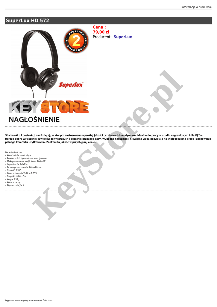 Informacje o produkcie SuperLux HD 572 Cena : 79,00 zł or e. pl Producent : SuperLux K ey Dane techniczne: • Konstrukcja: zamknięta • Przetworniki: dynamiczne, neodymowe • Maksymalna moc wejściowa: 200 mW • Impedancja: 24 Ohm • Pasmo przenoszenia: 20Hz-20kHz • Czułość: 99dB • Zniekształcenia THD: <0.25% • Długość kabla: 2m • Waga: 130g • Kolor: czarny • Złącze: mini Jack St Słuchawki o konstrukcji zamkniętej, w których zastosowano wysokiej jakości przetworniki neodymowe. Idealne do pracy w studiu nagraniowym i dla DJ'ów. Bardzo dobre wyciszenie dźwięków zewnętrznych i potężnie brzmiące basy. Wygodne nausznice i niewielka waga pozwalają na wielogodzinną pracę i zachowanie pełnego komfortu użytkowania. Znakomita jakość w przystępnej cenie. Wygenerowano w programie www.oscGold.com