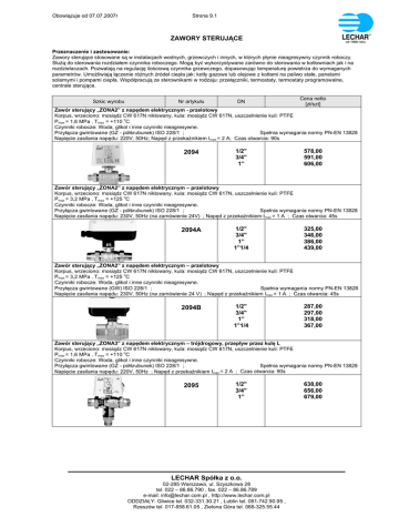 Obowiązuje od 07.07.2007r Strona 9.1 ZAWORY STERUJĄCE Przeznaczenie i zastosowanie: Zawory sterujące stosowane są w instalacjach wodnych, grzewczych i innych, w których płynie nieagresywny czynnik roboczy. Służą do sterowania rozdziałem czynnika roboczego. Mogą być wykorzystywane zarówno do sterowania w kotłowniach jak i na rozdzielaczach. Pozwalają na regulację ilościową czynnika grzewczego, dopasowując temperaturę powietrza do wymaganych parametrów. Umożliwiają łączenie różnych źródeł ciepła jak: kotły gazowe lub olejowe z kotłami na paliwo stałe, panelami solarnymi i pompami ciepła. Współpracują ze sterownikami w rodzaju: przełączniki, termostaty, termostaty programowalne, centrale sterujące. Szkic wyrobu Nr artykułu DN Cena netto [zł/szt] Zawór sterujący „ZONA2” z napędem elektrycznym - przelotowy Korpus, wrzeciono: mosiądz CW 617N niklowany, kula: mosiądz CW 617N, uszczelnienie kuli: PTFE o Pmax = 1,6 MPa , Tmax = +110 C Czynniki robocze: Woda, glikol i inne czynniki nieagresywne. Przyłącza gwintowane (GZ - półśrubunek) ISO 228/1 ; Spełnia wymagania normy PN-EN 13828 Napięcie zasilania napędu: 220V, 50Hz; Napęd z przekaźnikiem Imax = 2 A; Czas otwarcia: 90s 2094 1/2" 3/4" 1” 578,00 591,00 606,00 Zawór sterujący „ZONA2” z napędem elektrycznym – przelotowy Korpus, wrzeciono: mosiądz CW 617N niklowany, kula: mosiądz CW 617N, uszczelnienie kuli: PTFE o Pmax = 3,2 MPa , Tmax = +125 C Czynniki robocze: Woda, glikol i inne czynniki nieagresywne. Przyłącza gwintowane (GZ - półśrubunek) ISO 228/1 ; Spełnia wymagania normy PN-EN 13828 Napięcie zasilania napędu: 230V, 50Hz (na zamówienie 24V) ; Napęd z przekaźnikiem Imax = 1 A ; Czas otwarcia: 45s 2094A 1/2" 3/4" 1” 1”1/4 325,00 346,00 386,00 439,00 Zawór sterujący „ZONA2” z napędem elektrycznym – przelotowy Korpus, wrzeciono: mosiądz CW 617N niklowany, kula: mosiądz CW 617N, uszczelnienie kuli: PTFE o Pmax = 3,2 MPa , Tmax = +125 C Czynniki robocze: Woda, glikol i inne czynniki nieagresywne. Przyłącza gwintowane (GW) ISO 228/1 ; Spełnia wymagania normy PN-EN 13828 Napięcie zasilania napędu: 230V, 50Hz (na zamówienie 24 V) ; Napęd z przekaźnikiem Imax = 1 A ; Czas otwarcia: 45s 2094B 1/2" 3/4" 1” 1”1/4 287,00 297,00 318,00 367,00 Zawór sterujący „ZONA3” z napędem elektrycznym – trójdrogowy, przepływ przez kulę L Korpus, wrzeciono: mosiądz CW 617N niklowany, kula: mosiądz CW 617N, uszczelnienie kuli: PTFE o Pmax = 1,6 MPa , Tmax = +110 C Czynniki robocze: Woda, glikol i inne czynniki nieagresywne. Przyłącza gwintowane (GZ - półśrubunek) ISO 228/1 ; Spełnia wymagania normy PN-EN 13828 Napięcie zasilania napędu: 220V, 50Hz ; Napęd z przekaźnikiem Imax = 2 A ; Czas otwarcia: 90s 2095 1/2" 3/4" 1” LECHAR Spółka z o.o. 02-285 Warszawa, ul. Szyszkowa 28 tel. 022 – 86.86.790 , fax. 022 – 86.86.789 e-mail: [email protected] , http://www.lechar.com.pl ODDZIAŁY: Gliwice tel. 032-331.30.21 , Lublin tel. 081-742.90.95 , Rzeszów tel. 017-858.61.05 , Zielona Góra tel. 068-325.55.44 638,00 656,00 679,00 Obowiązuje od 07.07.2007r Strona 9.2 ZAWORY STERUJĄCE Cena netto [zł/szt] Zawór sterujący „ZONA4” z napędem elektrycznym – czterodrogowy z by-passem do podłączania rozdzielaczy Korpus, wrzeciono: mosiądz CW 617N niklowany, kula: mosiądz CW 617N, uszczelnienie kuli: PTFE o Pmax = 1,6 MPa , Tmax = +110 C Czynniki robocze: Woda, glikol i inne czynniki nieagresywne. Przyłącza gwintowane (GZ - półśrubunek) ISO 228/1 ; Spełnia wymagania normy PN-EN 13828 Odległość między osiami przyłączy: 1/2" - 33÷73 mm, 3/4" - 52÷78 mm, 1" - 58÷82 mm Napięcie zasilania napędu: 220V, 50Hz ; Napęd z przekaźnikiem Imax = 2 A ; Czas otwarcia: 90s Szkic wyrobu Nr artykułu DN 2098 1/2" 3/4" 1” 714,00 732,00 780,00 Zawór sterujący „ZONA4” – czterodrogowy z by-passem do podłączania rozdzielaczy Korpus, wrzeciono: mosiądz CW 617N niklowany, kula: mosiądz CW 617N, uszczelnienie kuli: PTFE o Pmax = 1,0 MPa , Tmax = +95 C Czynniki robocze: Woda, glikol i inne czynniki nieagresywne. Przyłącza gwintowane (GW) ISO 228/1 ; Spełnia wymagania normy PN-EN 13828 Odległość między osiami przyłączy: 3/4" - 114÷119 mm, 1" - 114÷119 mm RBM114.20 3/4" 1” 496,00 515,00 Napięcie Cena netto zasilania [zł/szt] Napęd do zaworu sterującego „ZONA4” (art. RBM114.20) – z przekaźnikiem sterującym Moc znamionowa: 5 VA ; Temperatura otoczenia: 5÷50ºC ; Napęd z przekaźnikiem Imax = 2 A ; Czas otwarcia: 120s Szkic wyrobu Nr artykułu RBM360.00 230V 24V PRZYKŁADY ZASTOSOWANIA LECHAR Spółka z o.o. 02-285 Warszawa, ul. Szyszkowa 28 tel. 022 – 86.86.790 , fax. 022 – 86.86.789 e-mail: [email protected] , http://www.lechar.com.pl ODDZIAŁY: Gliwice tel. 032-331.30.21 , Lublin tel. 081-742.90.95 , Rzeszów tel. 017-858.61.05 , Zielona Góra tel. 068-325.55.44 469,00 521,00 Obowiązuje od 07.07.2007r Strona 9.3 ZAWORY MIESZAJĄCE Przeznaczenie i zastosowanie: Zawory mieszające stosowane są w zasadzie w instalacjach grzewczych. Służą do proporcjonalnego mieszania czynnika roboczego powracającego z instalacji z czynnikiem zasilającym lub mieszania czynników z dwu różnych źródeł. Umożliwiają wykorzystanie jednofunkcyjnych kotłów grzewczych do podgrzewania wody użytkowej. Mogą być sterowane ręcznie lub wyposażone w napęd elektryczny a wówczas współpracują ze sterownikami w rodzaju: przełączniki, termostaty, termostaty programowalne, centrale sterujące, automatyka kotła lub wymiennika ciepła. Szkic wyrobu Nr artykułu DN Cena netto [zł/szt] Zawór mieszający „TRIMIX” – trójdrogowy Korpus, pokrywa, wrzeciono, mieszacz (serce): mosiądz CW 617N, uszczelnienia: EPDM o Prob = 1,0 MPa , Trob = 0 ÷ +110 C Czynniki robocze: Woda, glikol i inne czynniki nieagresywne. Przyłącza gwintowane (GW) ISO 228/1 460M 1/2" – Kv 2,5 3/4" – Kv 4,0 3/4” – Kv 6,0 1” – Kv