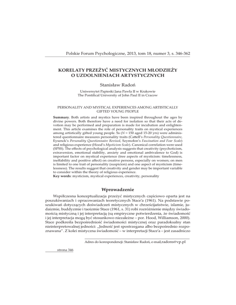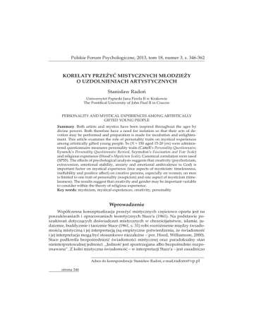 Polskie Forum Psychologiczne, 2013, tom 18, numer 3, s. 346-362 ȱ )ȱ ȱR ȱ O UZDOLNIENIACH ARTYSTYCZNYCH Ù ȱÚ ¢ȱȱȱ Ùȱȱ ȱ ȱęȱ¢ȱȱȱȱȱȱ PERSONALITY AND MYSTICAL EXPERIENCES AMONG ARTISTICALLY GIFTED YOUNG PEOPLE Summary. Both artists and mystics have been inspired throughout the ages by divine powers. Both therefore have a need for isolation so that their acts of devotion may be performed and preparation is made for incubation and enlightenment. This article examines the role of personality traits on mystical experiences among artistically gifted young people. Ss (N = 150 aged 15-20 yrs) were adminisȱȱȱ¢ȱȱǻĴȂȱPersonality Questionnaire, Eysenck’s Personality Questionnaire Revisedǰȱ£¢ÙȂȱFascination and Fear Scale) and religious experience (Hood’s Mysticism Scale). Canonical correlation were used ǻǼǯȱȱěȱȱ¢ȱ¢ȱȱȱ¢ȱǻ¢ǰȱ extraversion, emotional stability, anxiety and emotional ambivalence to God) is important factor on mystical experience (tree aspects of mysticism: timelessness, ě¢ȱȱȱěǼȱȱȱǰȱ¢ȱȱ Dzȱȱȱ is limited to one trait of personality (suspicion) and one aspect of mysticism (timelessness). The results suggest that creativity and gender may be important variable to consider within the theory of religious experience. Key words: mysticism, mystical experiences, creativity, personality Wprowadzenie àÙ£ȱ £ȱ £Č¢°ȱ ¢£¢ȱ £¿ï ȱ ȱ ȱ ȱ poszukiwaniach i opracowaniach teoretycznych Stace’a (1961). Na podstawie po£ Úȱ ¢£¢ȱ ï £Úȱ ¢£¢ȱ ȱ £ïÚ ǰȱ ǰȱ £ǰȱ¢£ȱȱ£ȱȱǻŗşŜŗǰȱǯȱřŗǼȱȱ£àČȱ¿£¢ȱï ïȱ¢£ȱȱȱȱǻȱ¢£ȱ £ǰȱČȱï ï°ȱ ȱȱȱȱ¢°ȱ ȱ£ČȱȮȱǯȱ ǰȱǰȱŘŖŖŖǼǯȱ ȱ ïȱ £ïï°ȱ ï ïȱ ¢£ȱ £ȱ ¢ȱ ȱ ȱïDZȱǮï°ȱȱ£ȱȱ£ïȱ££ Ȅǯȱȱȱ¢£ȱï ï°ȱȮȱ ȱȱȂȱȮȱȱ££ȱ ȱȱDZȱÙ ȱÚǰȱȬǰ[email protected] strona 346 ȱȱÙ¢ȱï ȱǻȱȱ ȱàČ¢ȱȱ¢£¢ȱȱ¢ȱ Ǽǯȱ Čȱ ï £ȱ ¢£ȱ ȱ àȰȱ ¿ǰȱ ȱ ȱ ȱ¢ȱǮ£ÚȄȱǻȱ àȱ£Ǽǯȱ ȱ Čȱ £àČȱ Ȃȱ ¢£¢ȱ ¢ȱ ï £Úȱ ¢£¢ǰȱǯȱàČ ȱ ¢ ȱȱ ¢ ȱ¢ǰȱàȱȱ ȱ ȱ ȱ Ċà ȱ £¢ȱ ȱ £ ȱ ï £ȱ ïǯȱ ¢ ȱ ¢¢ȱ £ȱ àČï°ȱ £ ¿£¢ȱ terialnych przedmiotów (morza, nieba, domów, drzewa), która jest mistycznie £ȱ ȱ ȱ àǰȱ Čȱ £ ȱ ¿ȱ ££ȱ ȱ ȱ £ȱ ï°ǯȱ ¢ȱ¢¢ȱ£ȱȱ££ȱ¢ïȱ£¿ȱ¿ȱȱ£¢Ù ȱ£ȱǻ ¢£ȱ£ȱï ïȱÙȱàČï°ȱ£°ǰȱ£à ȱȱ¢ïǼȱ£ȱȱïȱ ȱÙ¿ȱ Ùȱ¢Ùǯȱȱ Ùïȱǰȱ ȱȱïȱȱ£¢ȱȮȱȱ £ȱȱȮȱï £ȱȱïȱȱ£ȱ¿ȱ£ȱȱÙ£ǯȱȱȱ££ȱàČï°ȱȮȱȱȱȱȱ ȱï £ȱ ¢ ¢ȱȮȱȱ ȱĊàÙ ȱïȱǻÙ ȱ£ ȱïȱȮȱǯȱǰȱŗşŜŗǼǯ Ostatni element rozumienia mistycyzmu Stace’a dotyczy wspólnych cech doï £ȱ ¢£ǰȱ £¢ȱ ¢ǰȱ àȱ ȱ ȱ ȱ £¢ȱ ǰȱȱȱ£ǯȱ¢ęȱȱ¿°ȱ¢£¢ȱȮȱ£¢ȱ¿ȱ ȱȱȮȱ à¢ȱǰȱàȱȱ¢°ȱ£ȱȱ ȱ £¢ȱ¢ȱȱ¢£ȱȱï ïȱǻǰȱŗşŜŗǼDZȱ ŗǼȱ¢£ï°ȱǻȱȱ £¢ȱȱ Ǽǰȱ ŘǼȱ ¢Ù ï°ȱǻï°ȱ£ȱï £Ǽǰȱ řǼȱ£¢¢ ȱ¢ ï°ȱǻï £ȱȱȱÙïǼǰȱ ŚǼȱȱï°ȱǻȱï ¿ïȱȱǼǰ śǼȱï°ȱǻ££ïȱ£ȱ£à ȱ ȱǰȱȱȱ ȱǼǯ ȱ àȱ£ȱȂȱ£Ùȱ Čȱ££ȱĵȱǻŗşŝŞǼǰȱà¢ȱ £ȱ àČïȱ ï £Úȱ ¢£¢ǰȱ ǰȱ Čȱ £ȱ Ǯï £ȱ £ï£ȱ ȱ Č ǰȱ ȱ ȱ ¢ȱ £¢ȱ ¿£¢ȱȱȱȱȱ ȱȱ£ °ȱï £ǰȱ°ȱȱ¢£ȱ¢ȱȱï £ȄȱǻĵǰȱŗşŝŞǰȱǯȱŘśŜǼǯȱȱï ï°ȱȱ ȱ £ȱ ȱ Ǯ£¢ȱ ï ï°Ȅȱ ǻ£ȱ ȱ ȱ ęǼǰȱ £ȱ ¢ȱ ¿ȱ ï £ȱ £ £ȱ £Ùȱ ¿ǯȱ ¢ȱ ¿ǰȱ Čȱ ȱàȱ¿£¢ȱȱ àȱ£ȱȱȱ£ïȱȱ£ÙČ¢ȱ££ȱ ¢ę¿ȱï ïȱ£ȱï £ǰȱàȱÙȱǯȱ££¢ ïǰȱ ȱà¢ȱ£¢ȱČȱà °ȱȱ£¢ȱï ïǰȱȱȮȱȱ¿ȱ ¢ȱȮȱï £ȱ¢£ȱ£ £ȱ£Ùȱȱ £ȱȱ ¿£ȱȱ £ȱȱȱ¢ȱ£Č¢°ǯ ¿£ï°ȱ ¢à ȱ ¢¢£ȱ ££ȱ ¿ȱ £ȱ ¢ǰȱ Čȱ ¢¢£ȱ ȱ £ȱ £ȱ ¿£ȱ ¢ ïǰȱ Čȱ ¢ȱ £ȱ Ù£ȱ £ȱ £¢ȱ à ȱ ¢ ¢£¢ȱ ȱ ȱ ¿ȱ ȱ àČïȱ £Úȱ ¢£¢ȱ ǻȱ ǰȱ ¢£ǰȱ ę£ǰȱ ï £ȱ £ïÚ Ǽǯȱ £¢ȱȱČȱ¿ȱ ï ¢ȱ ǯȱȱ ȱȱ £Ùȱ £ȱ £ȱ Ǯ àȱ Ȅȱ ǻȱ ££ȱ ï £Úȱ¢£¢Ǽǯȱ࣢ȱ£ȱǻ¢ǰȱŗşşŞDzȱȬǰȱŗşşŞǼȱ £ȱ strona 347 ¿£ǰȱČȱ¢¢£ȱ ȱȱȱȱ ¢ȱȱ¿£¢ ¢ȱà ǰȱȱǮ£¢ȱï ïȄǰȱ ȱ£ £ȱ£ȱ¢ȱ ȱ ï ȱ ȱ¢ȱȱ£ȱ¿ȱ¢ °ȱ£ ȱ¿ǯȱȱȱ ¢ȱ ¿ǰȱ Čȱ ȱ ¢ȱ ¢£ȱ ¢ȱ àȱ ¢ȱ ȱ £Č¢°ȱ ¢£¢ǯȱ Ùȱ ¢ȱ Ùȱ £ȱ Úȱ ¢£¢ȱ£ £¢ȱ££ȱǰȱǰȱȱǻŗşşŜǼǰȱȱ¢ȱ ¢ȱ ¿ȱ¢°ȱ£ȱǻ¢ȱȱ£àČ ¢ȱ£ȱï DZȱsacrum nieoddzielne od profanumǼǰȱ£¢Ù ï°ȱǻ¢ȱïȱ¿ȱ ïȱ¢Ǽȱȱ Č ï°ȱǻ¢ȱ ȱȱĚǰȱ Č ȱȱȱ ¢Ǽǯȱ¢ȱ¿ȱ ¿ǰȱČȱ¢ȱ¢ȱ¢ȱàȱǻ£àČ ȱ£ȱï ȱ£ǰȱȱ Č ïȱȱǰȱ¢£Ǽȱȱ ȱ ȱ¢ȱ£Č¢ǯȱ àȱ ȱ ǰȱ Čȱ ¢ȱ ¢£ȱ ¿ȱ ¢Č£ȱ ¢ ïȱ £Č¢°ȱ ¢ȱ ȱ ¿Č£¢£ȱ ǻǰȱ ǰȱ ŗşşşǼǯȱ ££ȱ ǰȱ Čȱ ¢ȱ ȱȱ££ȱȱ£ȱȱȱ¢ ȱ£Č¢ȱȱȱ ȱȱ£ ȱ Ùȱï°ǰȱàȱ£¢ȱȱ£ȱ£Č¢ȱȱ ǻ¢ȱ ȱ ȱ ¢£ȱ Ù¢ ȱ ȱ ȱ £Č¢°ȱ ¢ȱ Ȯȱ ǯȱ Mercer, Durham, 1999). ¢ȱ àČ¢ȱ Úȱ ǰȱ Čȱ ȱ ¢ȱ à£ïȱ Ù¢ ȱ ȱ ¢ ï°ȱ£Č¢°ȱ¢ǯȱČ¢ȱï°ǰȱČȱ£ £ȱ¿£¢ȱ£Č¢ȱ¢£¢ȱȱ à£ïȱ£ȱ££ȱ £ȱȱ ȱ badaczy (Hay, Morisy, 1978; Hay, 1979; Cowling, 1985; Maslow, 1986; Alexander, ¢ǰȱ¡ǰȱ ŗşŞŝDzȱ ǰȱ ŘŖŖŚDzȱ Úǰȱ Ù£ǰȱ ŘŖŖŜDzȱ Úǰȱ ŘŖŗŖǼǯȱ ȱ ¿ȱ£¿ȱǰȱČȱ¢ ï°ȱ£Č¢°ȱ¢ȱ Čȱ¿ȱ£ȱ£ ȱ psychicznym (por. Boisen, 1936; Greeley, 1975; Alexander, Boyer, Alexander, 1987; ǰȱŗşşśDzȱ ȱȱǯǰȱŘŖŖŗDzȱǰȱŘŖŖŚǼǯȱȱ ¢ȱÚǰȱàȱǰȱ ČȱČȱȱïȱȱČȱ £°ȱȱÙ¿ȱ£Č¢°ȱ£à ȱȱ£ȱ¢ȱǻ ¢ȱ£ȱ¢£¢à ȱ¢ȱȱàȱ ȱȱ¢ ïȱï £Úȱ¢ȱȮȱǯȱÙ£ǰȱŗşşŜǼǰȱȱȱquasi-reli¢ȱǻïȱȱ¿ȱ £¢£¢ȱ ¢Č£ȱęȱ¢£ïȱ i histerii – por. Ward, Beaubrun, 1981; Lietaer, Corveleyn, 1995). ¢ȱ ¢ȱ Úȱ ǰȱ Čȱ ££ȱ £ £ȱ 