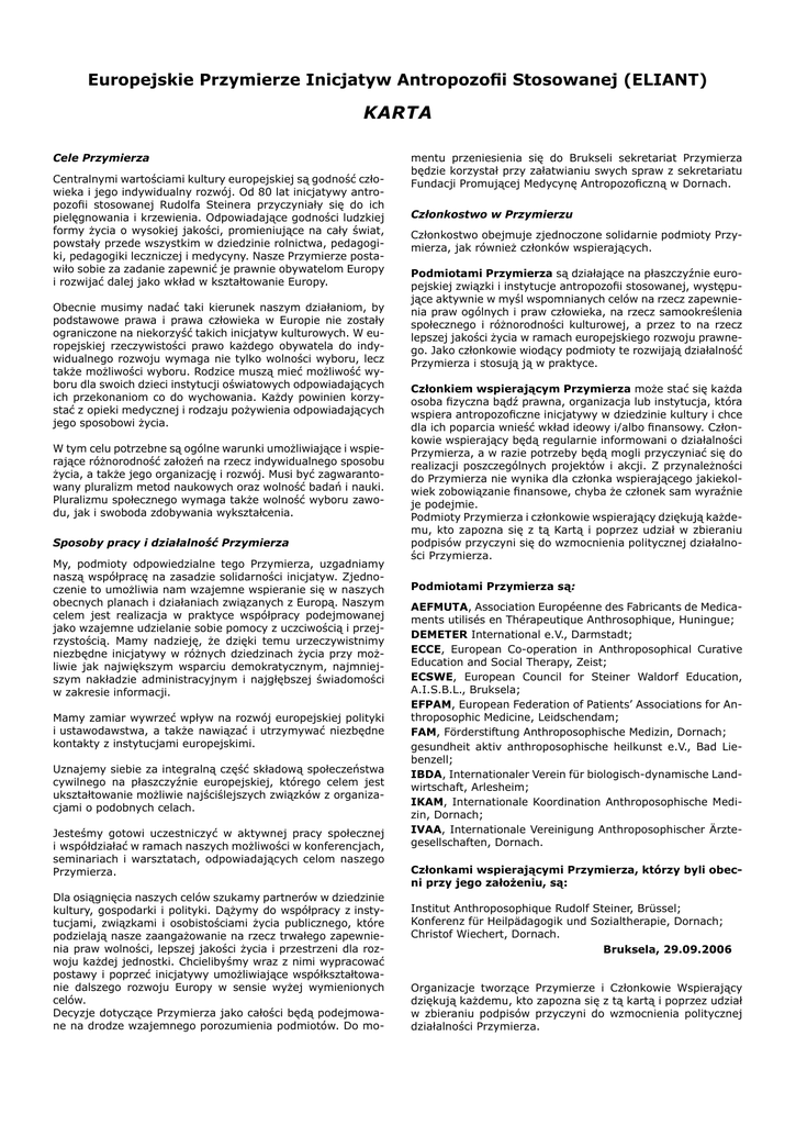 Europejskie Przymierze Inicjatyw Antropozofii Stosowanej (ELIANT) KARTA Cele Przymierza Centralnymi wartościami kultury europejskiej są godność czło wieka i jego indywidualny rozwój. Od 80 lat inicjatywy antro pozofii stosowanej Rudolfa Steinera przyczyniały się do ich pielęgnowania i krzewienia. Odpowiadające godności ludzkiej formy życia o wysokiej jakości, promieniujące na cały świat, powstały przede wszystkim w dziedzinie rolnictwa, pedagogi ki, pedagogiki leczniczej i medycyny. Nasze Przymierze posta wiło sobie za zadanie zapewnić je prawnie obywatelom Europy i rozwijać dalej jako wkład w kształtowanie Europy. Obecnie musimy nadać taki kierunek naszym działaniom, by podstawowe prawa i prawa człowieka w Europie nie zostały ograniczone na niekorzyść takich inicjatyw kulturowych. W eu ropejskiej rzeczywistości prawo każdego obywatela do indy widualnego rozwoju wymaga nie tylko wolności wyboru, lecz także możliwości wyboru. Rodzice muszą mieć możliwość wy boru dla swoich dzieci instytucji oświatowych odpowiadających ich przekonaniom co do wychowania. Każdy powinien korzy stać z opieki medycznej i rodzaju pożywienia odpowiadających jego sposobowi życia. W tym celu potrzebne są ogólne warunki umożliwiające i wspie rające różnorodność założeń na rzecz indywidualnego sposobu życia, a także jego organizację i rozwój. Musi być zagwaranto wany pluralizm metod naukowych oraz wolność badań i nauki. Pluralizmu społecznego wymaga także wolność wyboru zawo du, jak i swoboda zdobywania wykształcenia. Sposoby pracy i działalność Przymierza My, podmioty odpowiedzialne tego Przymierza, uzgadniamy naszą współpracę na zasadzie solidarności inicjatyw. Zjedno czenie to umożliwia nam wzajemne wspieranie się w naszych obecnych planach i działaniach związanych z Europą. Naszym celem jest realizacja w praktyce współpracy podejmowanej jako wzajemne udzielanie sobie pomocy z uczciwością i przej rzystością. Mamy nadzieję, że dzięki temu urzeczywistnimy niezbędne inicjatywy w różnych dziedzinach życia przy moż liwie jak największym wsparciu demokratycznym, najmniej szym nakładzie administracyjnym i najgłębszej świadomości w zakresie informacji. Mamy zamiar wywrzeć wpływ na rozwój europejskiej polityki i ustawodawstwa, a także nawiązać i utrzymywać niezbędne kontakty z instytucjami europejskimi. Uznajemy siebie za integralną część składową społeczeństwa cywilnego na płaszczyźnie europejskiej, którego celem jest ukształtowanie możliwie najściślejszych związków z organiza cjami o podobnych celach. Jesteśmy gotowi uczestniczyć w aktywnej pracy społecznej i współdziałać w ramach naszych możliwości w konferencjach, seminariach i warsztatach, odpowiadających celom naszego Przymierza. Dla osiągnięcia naszych celów szukamy partnerów w dziedzinie kultury, gospodarki i polityki. Dążymy do współpracy z insty tucjami, związkami i osobistościami życia publicznego, które podzielają nasze zaangażowanie na rzecz trwałego zapewnie nia praw wolności, lepszej jakości życia i przestrzeni dla roz woju każdej jednostki. Chcielibyśmy wraz z nimi wypracować postawy i poprzeć inicjatywy umożliwiające współkształtowa nie dalszego rozwoju Europy w sensie wyżej wymienionych celów. Decyzje dotyczące Przymierza jako całości będą podejmowa ne na drodze wzajemnego porozumienia podmiotów. Do mo mentu przeniesienia się do Brukseli sekretariat Przymierza będzie korzystał przy załatwianiu swych spraw z sekretariatu Fundacji Promującej Medycynę Antropozoficzną w Dornach. Członkostwo w Przymierzu Członkostwo obejmuje zjednoczone solidarnie podmioty Przy mierza, jak również członków wspierających. Podmiotami Przymierza są działające na płaszczyźnie euro pejskiej związki i instytucje antropozofii stosowanej, występu jące aktywnie w myśl wspomnianych celów na rzecz zapewnie nia praw ogólnych i praw człowieka, na rzecz samookreślenia społecznego i różnorodności kulturowej, a przez to na rzecz lepszej jakości życia w ramach europejskiego rozwoju prawne go. Jako członkowie wiodący podmioty te rozwijają działalność Przymierza i stosują ją w praktyce. Członkiem wspierającym Przymierza może stać się każda osoba fizyczna bądź prawna, organizacja lub instytucja, która wspiera antropozoficzne inicjatywy w dziedzinie kultury i chce dla ich poparcia wnieść wkład ideowy i/albo finansowy. Człon kowie wspierający będą regularnie informowani o działalności Przymierza, a w razie potrzeby będą mogli przyczyniać się do realizacji poszczególnych projektów i akcji. Z przynależności do Przymierza nie wynika dla członka wspierającego jakiekol wiek zobowiązanie finansowe, chyba że członek sam wyraźnie je podejmie. Podmioty Przymierza i członkowie wspierający dziękują każde mu, kto zapozna się z tą Kartą i poprzez udział w zbieraniu podpisów przyczyni się do wzmocnienia politycznej działalno ści Przymierza. Podmiotami Przymierza są: AEFMUTA, Association Européenne des Fabricants de Medica ments utilisés en Thérapeutique Anthrosophique, Huningue; DEMETER International e.V., Darmstadt; ECCE, European Co-operation in Anthroposophical Curative Education and Social Therapy, Zeist; ECSWE, European Council for Steiner Waldorf Education, A.I.S.B.L., Bruksela; EFPAM, European Federation of Patients’ Associations for An throposophic Medicine, Leidschendam; FAM, Förderstiftung Anthroposophische Medizin, Dornach; gesundheit aktiv anthroposophische heilkunst e.V., Bad Lie benzell; IBDA, Internationaler Verein für biologisch-dynamische Land wirtschaft, Arlesheim; IKAM, Internationale Koordination Anthroposophische Medi zin, Dornach; IVAA, Internationale Vereinigung Anthroposophischer Ärzte gesellschaften, Dornach. Członkami wspierającymi Przymierza, którzy byli obecni przy jego założeniu, są: Institut Anthroposophique Rudo