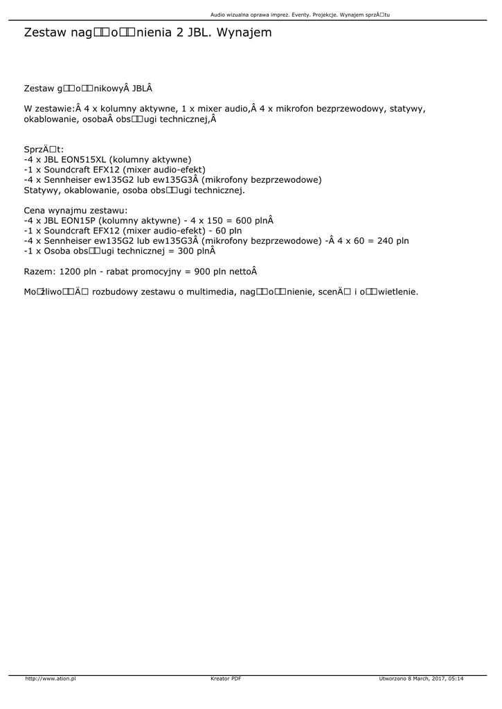 Audio wizualna oprawa imprez. Eventy. Projekcje. Wynajem sprzÄ™tu Zestaw nagÅ‚oÅ›nienia 2 JBL. Wynajem Zestaw gÅ‚oÅ›nikowy JBL W zestawie: 4 x kolumny aktywne, 1 x mixer audio, 4 x mikrofon bezprzewodowy, statywy, okablowanie, osoba obsÅ‚ugi technicznej, SprzÄ™t: -4 x JBL EON515XL (kolumny aktywne) -1 x Soundcraft EFX12 (mixer audio-efekt) -4 x Sennheiser ew135G2 lub ew135G3 (mikrofony bezprzewodowe) Statywy, okablowanie, osoba obsÅ‚ugi technicznej. Cena wynajmu zestawu: -4 x JBL EON15P (kolumny aktywne) - 4 x 150 = 600 pln -1 x Soundcraft EFX12 (mixer audio-efekt) - 60 pln -4 x Sennheiser ew135G2 lub ew135G3 (mikrofony bezprzewodowe) - 4 x 60 = 240 pln -1 x Osoba obsÅ‚ugi technicznej = 300 pln Razem: 1200 pln - rabat promocyjny = 900 pln netto MoÅźliwość rozbudowy zestawu o multimedia, nagÅ‚oÅ›nienie, scenÄ™ i oÅ›wietlenie. http://www.ation.pl Kreator PDF Utworzono 8 March, 2017, 05:14