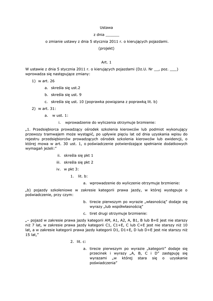 Ustawa z dnia ______ o zmianie ustawy z dnia 5 stycznia 2011 r. o kierujących pojazdami. (projekt) Art. 1 W ustawie z dnia 5 stycznia 2011 r. o kierujących pojazdami (Dz.U. Nr __, poz. ___) wprowadza się następujące zmiany: 1) w art. 26 a. skreśla się ust.2 b. skreśla się ust. 9 c. skreśla się ust. 10 (poprawka powiązana z poprawką lit. b) 2) w art. 31: a. w ust. 1: i. wprowadzenie do wyliczenia otrzymuje brzmienie: „1. Przedsiębiorca prowadzący ośrodek szkolenia kierowców lub podmiot wykonujący przewozy tramwajem może wystąpić, po upływie pięciu lat od dnia uzyskania wpisu do rejestru przedsiębiorców prowadzących ośrodek szkolenia kierowców lub ewidencji, o której mowa w art. 30 ust. 1, o poświadczenie potwierdzające spełnianie dodatkowych wymagań jeżeli:” ii. skreśla się pkt 1 iii. skreśla się pkt 2 iv. w pkt 3: 1. lit. b: a. wprowadzenie do wyliczenie otrzymuje brzmienie: „b) pojazdy szkoleniowe w zakresie kategorii prawa jazdy, w której występuje o poświadczenie, przy czym: b. tirecie pierwszym po wyrazie „własnością” dodaje się wyrazy „lub współwłasnością” c. tiret drugi otrzymuje brzmienie: „– pojazd w zakresie prawa jazdy kategorii AM, A1, A2, A, B1, B lub B+E jest nie starszy niż 7 lat, w zakresie prawa jazdy kategorii C1, C1+E, C lub C+E jest nie starszy niż 10 lat, a w zakresie kategorii prawa jazdy kategorii D1, D1+E, D lub D+E jest nie starszy niż 15 lat,” 2. lit. c: a. tirecie pierwszym po wyrazie „kategorii” dodaje się przecinek i wyrazy „A, B, C i D” zastępuję się wyrazami „w której stara się o uzyskanie poświadczenia” b. tirecie drugim po przecinku dodaje się wyrazy „w zakresie kategorii prawa jazdy, w której stara się o uzyskanie poświadczenia,” v. w pkt 4: 1. lit. a otrzymuje brzmienie: „a) dwóch instruktorów posiadających od co najmniej 4 lat uprawnienia do prowadzenia szkolenia w zakresie prawa jazdy kategorii, w której stara się o uzyskanie poświadczenia,” 2. skreśla się lit. b 3) w art. 53: a. w ust. 1 po wyrazach „wojewódzkiego ośrodka ruchu drogowego” dodaje się wyrazy „lub ośrodka szkolenia kierowców” b. ust. 4 otrzymuje brzmienie: „4. Przepisu ust. 1 nie stosuje się do pojazdów, o których mowa w art. 54 ust. 5.” 4) (poprawka powiązana z poprawką nr 3) w art. 55 ust. 5 pkt 2 po wyrazach „wojewódzkiego ośrodka ruchu drogowego” dodaje się wyrazy „lub ośrodka szkolenia kierowców” Art. 2 Ustawa wchodzi w życie po upływie 14 dni od dnia ogłoszenia. UZASADNIENIE W zakresie objętym proponowanymi zmianami istnieją poważne wątpliwości co do ich zgodności z Konstytucją Rzeczypospolitej Polskiej – ekspertyza prawna sporządzona przez prof. zw. dr hab. nauk prawnych Andrzeja Bałabana stanowi załącznik do projektu ustawy. Ad. pkt 1 lit. a Pietą achillesową małych ośrodków szkolenia kierowców jest fikcyjne szkolenie teoretyczne, a zatem nauczanie na odległość powinno być dostępne przede wszystkim dla kursantów takich ośrodków. Komputerowa metoda nauczania na odległość pozwala na pełną kontrolę, przerobionego przez kursanta materiału. W Stanach Zjednoczonych można zmniejszyć sobie ilość kursów za pośrednictwem Internetu. W Australii można chodzić do szkoły ucząc się na odległość. Nawet w Polsce można studiować z wykorzystaniem tej metody. Dlaczego zatem tylko wąska i nieliczna grupa super OSK będzie mogła korzystać z tego dobrodziejstwa? Nie wiadomo, bowiem mówienie o eksperymencie jest tutaj naciąganym argumentem. Paradoksem jest tutaj, konieczność posiadania przez super OSK super sal wykładowych i pomieszczeń. Tylko po co, skoro przy szkoleniu na odległości będą one zupełnie niepotrzebne? Proponowane rozwiązanie wychodzi naprzeciw rządowej strategii rozwoju społeczeństwa informacyjnego. Zgodnie z tym dokumentem: „Jednym z istotnych czynników stymulującym wzrost gospodarczy jest umiejętność pozyskiwania, gromadzenia i wykorzystywania informacji, dzięki dynamicznemu rozwojowi technologii informacyjnych i komunikacyjnych (ang. Information and Communication Technologies – ICT). Znaczenie tego rozwoju dla wzrostu gospodarczego podkreślają badania, według których technologie informacyjne i komunikacyjne w ostatnich latach odpowiadają za około jedną czwartą wzrostu PKB oraz za 40% wzrostu produktywności w Unii Europejskiej.” W ramach strategii postulowane jest m.in. szersze wykorzystanie nowych technologii w celu podniesienia efektywności, innowacyjności i konkurencyjności gospodarki oraz współpracy firm. Ad. 1 lit. b i c Możliwość prowadzenia szkolenia na terenie powiatu, w którym uzyskało się wpis do rejestru i powiatu sąsiedniego został wprowadzony bez wskazania nadrzędnego interesu publicznego jaki uzasadnia przyjęcie takiego ograniczenia. Stanowi to naruszenie konstytucyjnej swobody prowadzenia działalności gospodarczej i art. 75a ustawy o swobodzie działalności gospodarczej, który stanowi, że koncesja, zezwolenie, zgoda, licencja albo wpis do rejestru działalności regulowanej uprawniają do wykonywania działalności gospodarczej na terenie całego kraju i przez czas nieokreślony a wprowadzenie wyjątku od tej zasady jest dopuszczalne tylko w przepisach ustaw odrębnych wyłącznie ze względu na wspomniany nadrzędny interes publiczny. Ad. 2 Kryteria dla tzw. super OSK, bez należytego uzasadnienia, zostały tak zaostrzone, że jedynie nielicznej grupie przedsiębiorców prowadzących zwykłe ośrodki uda się je spełnić. Podstawową korzyścią jaką uzyskają przedsiębiorcy prowadzący super OSK będzie wyłączne prawo do prowadzenia szkoleń na instruktorów nauki jazdy (obecnie może prowadzić takie szkolenia praktycznie każdy), co przy niewielkiej liczbie super OSK może znacząco ograniczyć dostęp do tego zawodu. Drugi znaczący przywilej, to prawo do prowadzenia corocznych trzydniowych warsztatów dla w