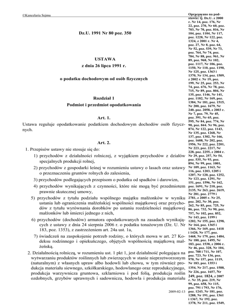 Opracowano na pods. 1/1 stawie: tj. Dz.U. z 2000 r. Nr 14, poz. 176, Nr 22, poz. 270, Nr 60, poz. 703, Nr 70, poz. 816, Nr 104, poz. 1104, Nr 117, Dz.U. 1991 Nr 80 poz. 350 poz. 1228, Nr 122, poz. 1324, z 2001 r. Nr 4, poz. 27, Nr 8, poz. 64, Nr 52, poz. 539, Nr 73, poz. 764, Nr 74, poz. 784, Nr 88, poz. 961, Nr USTAWA 89, poz. 968, Nr 102, poz. 1117, Nr 106, poz. z dnia 26 lipca 1991 r. 1150, Nr 110, poz. 1190, Nr 125, poz. 1363 i 1370, Nr 134, poz. 1509, o podatku dochodowym od osób fizycznych z 2002 r. Nr 19, poz. 199, Nr 25, poz. 253, Nr 74, poz. 676, Nr 78, poz. 715, Nr 89, poz. 804, Nr 135, poz. 1146, Nr 141, poz. 1182, Nr 169, poz. Rozdział 1 1384, Nr 181, poz. 1515, Podmiot i przedmiot opodatkowania Nr 200, poz. 1679, Nr 240, poz. 2058, z 2003 r. Nr 7, poz. 79, Nr 45, poz. 391, Nr 65, poz. Art. 1. 595, Nr 84, poz. 774, Nr Ustawa reguluje opodatkowanie podatkiem dochodowym dochodów osób fizycz- 90, poz. 844. Nr 96, poz. 874, Nr 122, poz. 1143, nych. Nr 135, poz. 1268, Nr 137, poz. 1302, Nr 166, poz. 1608, Nr 202, poz. Art. 2. 1956, Nr 222, poz. 2201, Nr 223, poz. 2217, Nr 1. Przepisów ustawy nie stosuje się do: 228, poz. 2255, z 2004 r. 1) przychodów z działalności rolniczej, z wyjątkiem przychodów z działów Nr 29, poz. 257, Nr 54, poz. 535, Nr 93, poz. specjalnych produkcji rolnej, 894, Nr 99, poz. 1001, 2) przychodów z gospodarki leśnej w rozumieniu ustawy o lasach oraz ustawy Nr 109, poz. 1163, Nr 116, poz. 1203, 1205 i o przeznaczeniu gruntów rolnych do zalesienia, 1207, Nr 120, poz. 1252, Nr 123, poz. 1291, Nr 3) przychodów podlegających przepisom o podatku od spadków i darowizn, 151, poz. 1596, Nr 162, 4) przychodów wynikających z czynności, które nie mogą być przedmiotem poz. 1691, Nr 210, poz. 2135, Nr 263, poz. 2619, prawnie skutecznej umowy, Nr 281, poz. 2779 i 5) przychodów z tytułu podziału wspólnego majątku małżonków w wyniku 2781, z 2005 r. Nr 25, 202, Nr 30, poz. ustania lub ograniczenia małżeńskiej wspólności majątkowej oraz przycho- poz. 262, Nr 85, poz. 725, Nr dów z tytułu wyrównania dorobków po ustaniu rozdzielności majątkowej 86, poz. 732, Nr 90, poz. 757, Nr 102, poz. 852, małżonków lub śmierci jednego z nich, Nr 143, poz. 1199 i 6) przychodów (dochodów) armatora opodatkowanych na zasadach wynikają- 1202, Nr 155, poz. 1298, cych z ustawy z dnia 24 sierpnia 2006 r. o podatku tonażowym (Dz. U. Nr Nr 164, poz. 1365 i 1366, Nr 169, poz. 1418 183, poz. 1353), z zastrzeżeniem art. 24a ust. 1a, i 1420, Nr 177, poz. 7) świadczeń na zaspokojenie potrzeb rodziny, o których mowa w art. 27 Ko- 1468, Nr 179, poz. 1484, deksu rodzinnego i opiekuńczego, objętych wspólnością majątkową mał- Nr 180, poz. 1495, Nr 183, poz. 1538, z 2006 r. żeńską. Nr 46, poz. 328, Nr 104, 2. Działalnością rolniczą, w rozumieniu ust. 1 pkt 1, jest działalność polegająca na poz. 708 i 711, Nr 107, poz. 723, Nr 136, poz. wytwarzaniu produktów roślinnych lub zwierzęcych w stanie nieprzetworzonym 970, Nr 157, poz. 1119, (naturalnym) z własnych upraw albo hodowli lub chowu, w tym również pro- Nr 183, poz. 1353 i dukcja materiału siewnego, szkółkarskiego, hodowlanego oraz reprodukcyjnego, 1354, Nr 217, poz. 1588, produkcja warzywnicza gruntowa, szklarniowa i pod folią, produkcja roślin Nr 226, poz. 1657, Nr 249, poz. 1824, z 2007 ozdobnych, grzybów uprawnych i sadownicza, hodowla i produkcja materiału r. Nr 35, poz. 219, Nr 99, poz. 658, Nr 115, poz. 791 i 793, Nr 176, 2009-02-13 poz. 1243, Nr 181, poz. 1288, Nr 191, poz. 1361 i 1367, Nr 192, poz. 1378, Nr 211, poz. 1549, ©Kancelaria Sejmu ©Kancelaria Sejmu s. 2/2 zarodowego zwierząt, ptactwa i owadów użytkowych, produkcja zwierzęca typu przemysłowo-fermowego oraz hodowla ryb, a także działalność, w której mini malne okresy przetrzymywania zakupionych zwierząt i roślin, w trakcie których następuje ich biologiczny wzrost, wynoszą co najmniej: 1) miesiąc - w przypadku roślin, 2) 16 dni - w przypadku wysokointensywnego tuczu specjalizowanego gęsi lub kaczek, 3) 6 tygodni - w przypadku pozostałego drobiu rzeźnego, 4) 2 miesiące - w przypadku pozostałych zwierząt - licząc od dnia nabycia. 3. Działami specjalnymi produkcji rolnej są: uprawy w szklarniach i ogrzewanych tunelach foliowych, uprawy grzybów i ich grzybni, uprawy roślin "in vitro", fermowa hodowla i chów drobiu rzeźnego i nieśnego, wylęgarnie drobiu, hodowla i chów zwierząt futerkowych i laboratoryjnych, hodowla dżdżownic, hodowla entomofagów, hodowla jedwabników, prowadzenie pasiek oraz hodowla i chów innych zwierząt poza gospodarstwem rolnym. 3a. Nie stanowią działów specjalnych produkcji rolnej uprawy, hodowla i chów zwierząt w rozmiarach nieprzekraczających wielkości określonych w załączniku nr 2 do ustawy, zwanym „załącznikiem nr 2”. 4. Ilekroć w ustawie jest mowa o gospodarstwie rolnym, oznacza to gospodarstwo rolne w rozumieniu przepisów ustawy o podatku rolnym. 5. (uchylony). Art. 3. 1. Osoby fizyczne, jeżeli mają miejsce zamieszkania na terytorium Rzeczypospolitej Polskiej, podlegają obowiązkowi podatkowemu od całości swoich dochodów (przychodów) bez względu na miejsce położenia źródeł przychodów (nieograniczony obowiązek podatkowy). 1a. Za osobę mającą miejsce zamieszkania na terytorium Rzeczypospolitej Polskiej uważa się osobę fizyczną, która: 1) posiada na terytorium Rzeczypospolitej Polskiej centrum interesów osobistych lub gospodarczych (ośrodek interesów życiowych) lub 2) przebywa na terytorium Rzeczypospolitej Polskiej dłużej niż 183 dni w roku podatkowym. 2. (uchylony). 2a. Osoby fizyczne, jeżeli nie mają na terytorium Rzeczypospolitej Polskiej miejsca zamieszkania, podlegają obowiązkowi podatkowemu tylko od dochodów (przychodów) osiąganych na terytorium Rzeczypospolitej Polskiej (ograniczony obowiązek podatkowy). 2b. Za dochody (przychody) osiągane na terytorium Rzeczypospolitej Polskiej uważ