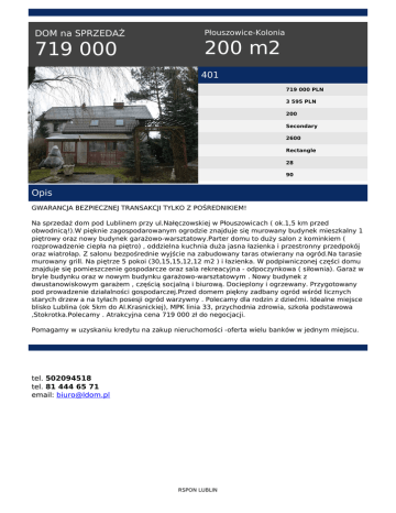 DOM na SPRZEDAŻ 719 000 Płouszowice-Kolonia 200 m2 401 719 000 PLN 3 595 PLN 200 Secondary 2600 Rectangle 28 90 Opis GWARANCJA BEZPIECZNEJ TRANSAKCJI TYLKO Z POŚREDNIKIEM! Na sprzedaż dom pod Lublinem przy ul.Nałęczowskiej w Płouszowicach ( ok.1,5 km przed obwodnicą!).W pięknie zagospodarowanym ogrodzie znajduje się murowany budynek mieszkalny 1 piętrowy oraz nowy budynek garażowo-warsztatowy.Parter domu to duży salon z kominkiem ( rozprowadzenie ciepła na piętro) , oddzielna kuchnia duża jasna łazienka i przestronny przedpokój oraz wiatrołap. Z salonu bezpośrednie wyjście na zabudowany taras otwierany na ogród.Na tarasie murowany grill. Na piętrze 5 pokoi (30,15,15,12,12 m2 ) i łazienka. W podpiwniczonej części domu znajduje się pomieszczenie gospodarcze oraz sala rekreacyjna - odpoczynkowa ( siłownia). Garaż w bryle budynku oraz w nowym budynku garażowo-warsztatowym . Nowy budynek z dwustanowiskowym garażem , częścią socjalną i biurową. Docieplony i ogrzewany. Przygotowany pod prowadzenie działalności gospodarczej.Przed domem piękny zadbany ogród wśród licznych starych drzew a na tyłach posesji ogród warzywny . Polecamy dla rodzin z dziećmi. Idealne miejsce blisko Lublina (ok 5km do Al.Krasnickiej), MPK linia 33, przychodnia zdrowia, szkoła podstawowa ,Stokrotka.Polecamy . Atrakcyjna cena 719 000 zł do negocjacji. Pomagamy w uzyskaniu kredytu na zakup nieruchomości -oferta wielu banków w jednym miejscu. tel. 502094518 tel. 81 444 65 71 email: [email protected] RSPON LUBLIN Powered by TCPDF (www.tcpdf.org)