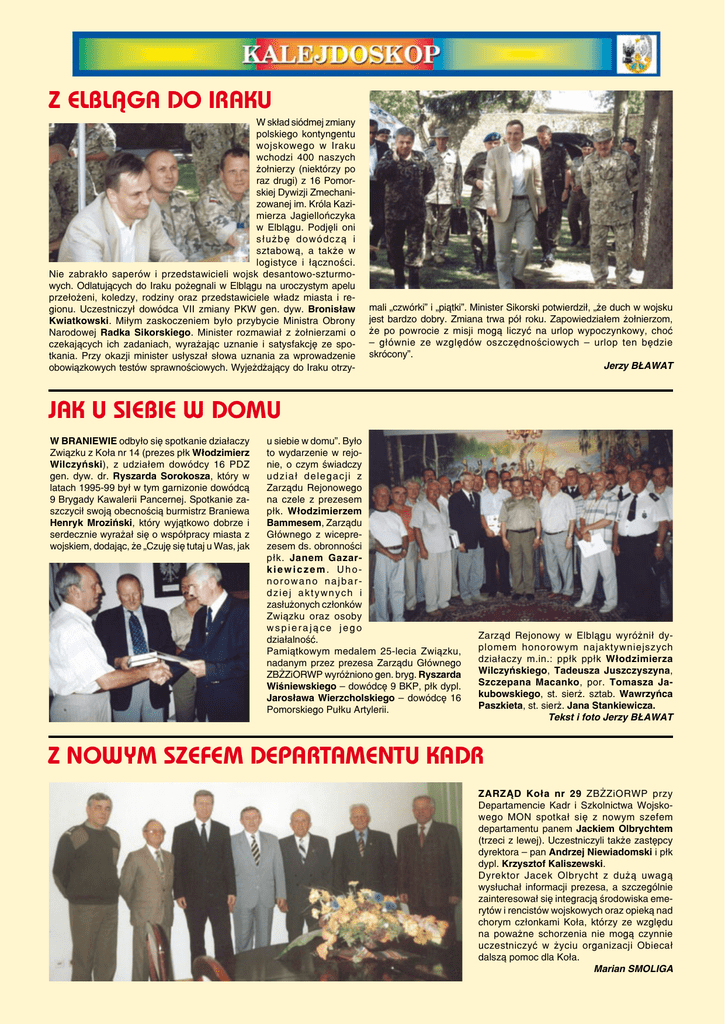 Z ELBL¥GA DO IRAKU W sk³ad siódmej zmiany polskiego kontyngentu wojskowego w Iraku wchodzi 400 naszych ¿o³nierzy (niektórzy po raz drugi) z 16 Pomorskiej Dywizji Zmechanizowanej im. Króla Kazimierza Jagielloñczyka w Elbl¹gu. Podjêli oni s³u¿bê dowódcz¹ i sztabow¹, a tak¿e w logistyce i ³¹cznoœci. Nie zabrak³o saperów i przedstawicieli wojsk desantowo-szturmowych. Odlatuj¹cych do Iraku po¿egnali w Elbl¹gu na uroczystym apelu prze³o¿eni, koledzy, rodziny oraz przedstawiciele w³adz miasta i regionu. Uczestniczy³ dowódca VII zmiany PKW gen. dyw. Bronis³aw Kwiatkowski. Mi³ym zaskoczeniem by³o przybycie Ministra Obrony Narodowej Radka Sikorskiego. Minister rozmawia³ z ¿o³nierzami o czekaj¹cych ich zadaniach, wyra¿aj¹c uznanie i satysfakcjê ze spotkania. Przy okazji minister us³ysza³ s³owa uznania za wprowadzenie obowi¹zkowych testów sprawnoœciowych. Wyje¿d¿aj¹cy do Iraku otrzy- mali „czwórki” i „pi¹tki”. Minister Sikorski potwierdzi³, „¿e duch w wojsku jest bardzo dobry. Zmiana trwa pó³ roku. Zapowiedzia³em ¿o³nierzom, ¿e po powrocie z misji mog¹ liczyæ na urlop wypoczynkowy, choæ – g³ównie ze wzglêdów oszczêdnoœciowych – urlop ten bêdzie skrócony”. Jerzy B£AWAT JAK U SIEBIE W DOMU W BRANIEWIE odby³o siê spotkanie dzia³aczy Zwi¹zku z Ko³a nr 14 (prezes p³k W³odzimierz Wilczyñski), z udzia³em dowódcy 16 PDZ gen. dyw. dr. Ryszarda Sorokosza, który w latach 1995-99 by³ w tym garnizonie dowódc¹ 9 Brygady Kawalerii Pancernej. Spotkanie zaszczyci³ swoj¹ obecnoœci¹ burmistrz Braniewa Henryk Mroziñski, który wyj¹tkowo dobrze i serdecznie wyra¿a³ siê o wspó³pracy miasta z wojskiem, dodaj¹c, ¿e „Czujê siê tutaj u Was, jak u siebie w domu”. By³o to wydarzenie w rejonie, o czym œwiadczy u d z i a ³ d e l e gac j i z Zarz¹du Rejonowego na czele z prezesem p³k. W³odzimierzem Bammesem, Zarz¹du G³ównego z wiceprezesem ds. obronnoœci p³k. Janem Gazarkiewiczem. Uhonorowano najbardziej aktywnych i zas³u¿onych cz³onków Zwi¹zku oraz osoby wspieraj¹ce jego dzia³alnoœæ. Pami¹tkowym medalem 25-lecia Zwi¹zku, nadanym przez prezesa Zarz¹du G³ównego ZB¯ZiORWP wyró¿niono gen. bryg. Ryszarda Wiœniewskiego – dowódcê 9 BKP, p³k dypl. Jaros³awa Wierzcholskiego – dowódcê 16 Pomorskiego Pu³ku Artylerii. Zarz¹d Rejonowy w Elbl¹gu wyró¿ni³ dyplomem honorowym najaktywniejszych dzia³aczy m.in.: pp³k pp³k W³odzimierza Wilczyñskiego, Tadeusza Juszczyszyna, Szczepana Macanko, por. Tomasza Jakubowskiego, st. sier¿. sztab. Wawrzyñca Paszkieta, st. sier¿. Jana Stankiewicza. Tekst i foto Jerzy B£AWAT Z NOWYM SZEFEM DEPARTAMENTU KADR ZARZ¥D Ko³a nr 29 ZB¯ZiORWP przy Departamencie Kadr i Szkolnictwa Wojskowego MON spotka³ siê z nowym szefem departamentu panem Jackiem Olbrychtem (trzeci z lewej). Uczestniczyli tak¿e zastêpcy dyrektora – pan Andrzej Niewiadomski i p³k dypl. Krzysztof Kaliszewski. Dyrektor Jacek Olbrycht z du¿¹ uwag¹ wys³ucha³ informacji prezesa, a szczególnie zainteresowa³ siê integracj¹ œrodowiska emerytów i rencistów wojskowych oraz opiek¹ nad chorym cz³onkami Ko³a, którzy ze wzglêdu na powa¿ne schorzenia nie mog¹ czynnie uczestniczyæ w ¿yciu organizacji Obieca³ dalsz¹ pomoc dla Ko³a. Marian SMOLIGA