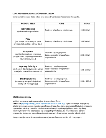 CENA NIE OBEJMUJE MAKIJAŻU SCENICZNEGO. Cena uzależniona od ilości zdjęć oraz czasu trwania sesji/obecności fotografa. RODZAJ SESJI Indywidualna (jedna osoba - portfolio) OPIS CENA Portrety i/lub kadry całościowe. 150-200 zł Portrety i/lub kadry całościowe. 200-300 zł Głównie ujęcia grupowe. Czas obecności fotografa do uzgodnienia. 300-400 zł Pary (np. dwoje zakochanych, para przyjaciółek,matka z córką, itp…) Grupowa (spotkania rodzinne, imprezy z przyjaciółmi, imprezy panieńskiekawalerskie, itp…) Imprezy dziecięce Portrety i ujęcia grupowe. (Zachęcam do skorzystania z usługi Czas obecności fotografa do uzgodnienia. makijażu: malunki na twarzach) Studniówkowa (prywatny fotograf dla jednej osoby lub małej grupy) Portrety i ujęcia grupowe. Czas obecności fotografa do uzgodnienia. 100 - 200 zł 200 – 400 zł Makijaż sceniczny Makijaż sceniczny wykonywany jest kosmetykami firmy KRYOLAN(hiperłączehttp://www.kryolancitywarszawa.com.pl/). Są to kosmetyki najwyższej jakości przeznaczone do makijażu profesjonalnego. Specjalne dermopodkłady i dermopudry zapewniają idealny kamuflaż niedoskonałości cery i zapobiegają błyszczeniu się skóry. Kosmetyki kolorowe odznaczają się szczególną trwałością. Są niepodatne na oznaki zmęczenia, stresu czy warunków atmosferycznych. Gwarantują wysoką jakość zdjęć. Usługa makijażu scenicznego skierowana jest zarówno do kobiet jak i mężczyzn. MAKIJAŻ SCENICZNY Malunki na twarzach dziecięcych* Sceniczny subtelny Sceniczny wieczorowy Sceniczny ślubny Sceniczny karnawałowy CENA 10 zł za dziecko 50 zł 70 zł 70 zł 80 – 100 zł ( w zależności od dodatków: ilość cieni, sztuczne rzęsy, cyrkonie) *Malunki na twarzach dziecięcych – wykonywane są wysokiej jakości farbami firmy SNAZAROO, światowego lidera w produkcji farb przeznaczonych do twarzy i ciała w żywych, wyrazistych kolorach. Bezpieczne, produkowane na bazie wody i barwników najwyższej jakości. Nietoksyczne, nie powodują podrażnień. Przebadane dermatologicznie, spełniają wymogi antyalergiczne UE i USA. Łatwe do zmycia przy użyciu wody i mydła.