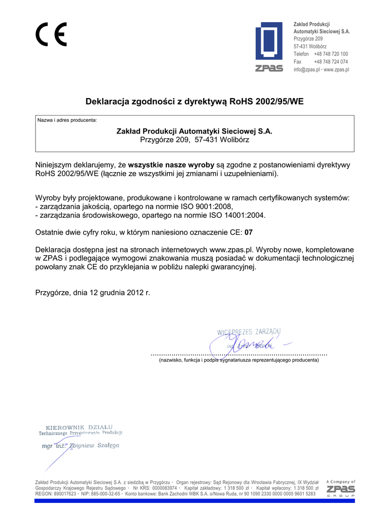 Zakład Produkcji Automatyki Sieciowej S.A. Przygórze 209 57-431 Wolibórz Telefon +48 748 720 100 Fax +48 748 724 074 [email protected] www.zpas.pl Deklaracja zgodności z dyrektywą RoHS 2002/95/WE Nazwa i adres producenta: Zakład Produkcji Automatyki Sieciowej S.A. Przygórze 209, 57-431 Wolibórz Niniejszym deklarujemy, że wszystkie nasze wyroby są zgodne z postanowieniami dyrektywy RoHS 2002/95/WE (łącznie ze wszystkimi jej zmianami i uzupełnieniami). Wyroby były projektowane, produkowane i kontrolowane w ramach certyfikowanych systemów: - zarządzania jakością, opartego na normie ISO 9001:2008, - zarządzania środowiskowego, opartego na normie ISO 14001:2004. Ostatnie dwie cyfry roku, w którym naniesiono oznaczenie CE: 07 Deklaracja dostępna jest na stronach internetowych www.zpas.pl. Wyroby nowe, kompletowane w ZPAS i podlegające wymogowi znakowania muszą posiadać w dokumentacji technologicznej powołany znak CE do przyklejania w pobliżu nalepki gwarancyjnej. Przygórze, dnia 12 grudnia 2012 r. ..................................................................................... (nazwisko, funkcja i podpis sygnatariusza reprezentującego producenta) Zakład Produkcji Automatyki Sieciowej S.A. z siedzibą w Przygórzu Organ rejestrowy: Sąd Rejonowy dla Wrocławia Fabrycznej, IX Wydział Gospodarczy Krajowego Rejestru Sądowego Nr KRS: 0000083974 Kapitał zakładowy: 1 318 500 zł Kapitał wpłacony: 1 318 500 zł REGON: 890017623 NIP: 885-000-32-65 Konto bankowe: Bank Zachodni WBK S.A. o/Nowa Ruda, nr 90 1090 2330 0000 0005 9601 5283