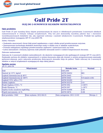Gulf Pride 2T OLEJ DO 2-SUWOWYCH SILNIKÓW MOTOCYKLOWYCH Opis produktu Gulf Pride 2T jest wysokiej klasy olejem przeznaczonym do użycia w chłodzonych powietrzem 2-suwowych silnikach zamontowanych w różnym rodzaju urządzeniach. Olej ten jest mieszanką wysokiej jakości baz i starannie wyselekcjonowanych dodatków tak, aby zapewnić ochronę i czystość silnikowców 2-suwowych. Produkt ten spełnia międzynarodowe wymagania API TC oraz JASO FB. Zalety / Korzyści • Znakomita smarowność chroni tłoki przed zapiekaniem a części silnika przed przedwczesnym zużyciem. • Zaawansowana technologia dodatków kontroluje osady w silniku oraz w układzie wydechowym. • Formuła niskopyłowa zapobiega przedwczesnemu zapłonowi i zanieczyszczaniu się świec. • Łatwa mieszalność z benzyną zapewnia stałe jednolite mieszanki nawet w niskich temperaturach otoczenia. Zalecane zastosowanie Zalecany do 2-suwowych silników motocyklowych i do skuterów wymagających olei spełniających wymogi API TC oraz JACO. Doskonały zarówno do silników wyposażonych w system dozowania oleju jak również w system przygotowywania mieszanki paliwowo-olejowej, patrz zalecenia producenta dotyczących stosunku oleju do paliwa. Także zalecany do 2-suwowych silników w innych urządzeniach wymagających oleju takiej jakości. Spełnia normy API TC, JASO FB Właściwości SAE Gęstość @ 15°C, kg/m3 Lepkość kinematyczna @ 40°C Lepkość kinematyczna @ 100°C Lepkość CCS, mPa.s (°C) Indeks Lepkości Punkt Zapłonu (COC), °C Punkt Płynięcia, °C Ogólna liczba zasadowa mgKOH/g Popiół siarczanowy, wt % Kod produktu: 1940 Data wydania: 2012-06-25 Metoda testu SAE J300 ASTM D4052 ASTM D445 ASTM D445 ASTM D5293 ASTM D2270 ASTM D92 ASTM D97 ASTM D2896 ASTM D874 Data zastąpienia: 2011-12-05 Wartość --883 --9.0 mm2/s (cSt) --110 >100°C <-30°C 0.95 0.08 Wersja: 2