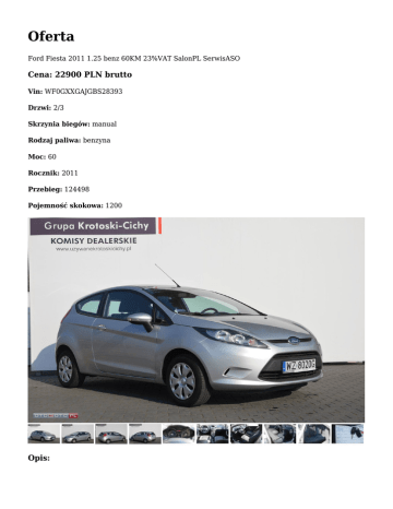 Oferta Ford Fiesta 2011 1.25 benz 60KM 23%VAT SalonPL SerwisASO Cena: 22900 PLN brutto Vin: WF0GXXGAJGBS28393 Drzwi: 2/3 Skrzynia biegów: manual Rodzaj paliwa: benzyna Moc: 60 Rocznik: 2011 Przebieg: 124498 Pojemność skokowa: 1200 Opis: Auto-Handel-Centrum Krotoski-Cichy Autoryzowany Dealer VW Audi Seat Skoda GWARANCJA POCHODZENIA MOŻLIWOŚĆ SPRAWDZENIA POJAZDU W STACJI OBSŁUGI. MOŻLIWOŚĆ POZOSTAWIENIA SWOJEGO SAMOCHODU UŻYWANEGO W ROZLICZENIU -----------------------------------------------------------------------------------------------------------------------------------------------------Uwaga: Miejsce ekspozycji pojazdu - Grupa Krotoski-Cichy Salon Pojazdów Używanych Wysogotowo, ul. Skórzewska 8 Osoba kontaktowa tel: Maximilian Gera - 609 790 272 Przemysław Mantaj - 601 750 883 Mariusz Kowalewski - 609 795 053 Możliwa jazda próbna po wcześniejszym uzgodnieniu terminu -----------------------------------------------------------------------------------------------------------------------------------------------------Ford Fiesta 1.25 Duratec 60 KM Pojazd zakupiony w Polskim Salonie Ford Pojazd serwisowany w ASO - książki serwisowe , instrukcję obsługi Przebieg: 124 498 km Pojemność silnika: 1242 cm3 typ silnika: benzynowy Moc silnika: 60KM Manualna skrzynia biegów: 5 Maksymalny moment obrotowy: 109 Nm Prędkość maksymalna: 152km.h Pojemność zbiornika paliwa: 42 l Norma emisji spalin: euro 5 Wyposażenie: ABS Immobiliser Poduszki powietrzne Wspomaganie układu kierowniczego ASR Elektryczne szyby Elektryczne lusterka Kierownica wielofunkcyjna ( sterowanie radiem) Fabryczne radio CD ESP - elektroniczny układ stabilizacji toru jazdy Elektryczne szyby Centralny zamek Klimatyzacja i inne NA POWYŻSZY POJAZD WYSTAWIANA JEST FAKTURA VAT 23% - KUPUJĄCY ZWOLNIONY Z OPŁATY SKARBOWEJ ( 2% wartości pojazdu) -----------------------------------------------------------------------------------------------------------------------------------------------------Oferujemy kompleksową obsługę sprzedaży ratalnej na bardzo dogodnych warunkach - w celu bliższego zapoznania się z aktualną ofertą finansowania prosimy o kontakt : Katarzyna Świątkiewicz - 609 562 980 Oferujemy ubezpieczenia samochodowe z wiodących na rynku ubezpieczalni - możliwość zakupu pakietu ubezpieczeniowego na miejscu. Oferujemy możliwość jazdy próbnej przed zakupem oraz usługę inspekcji pojazdu. Przyjmujemy również w rozliczeniu każdy pojazd. -----------------------------------------------------------------------------------------------------------------------------------------------------Ogłoszenie ma charakter informacyjny i stanowi zaproszenie do zawarcia umowy (art. 71 Kodeksu cywilnego); nie stanowi natomiast oferty handlowej w rozumieniu art. 66 § 1 Kodeksu cywilnego. W celu sprawdzenia zgodności oferty oraz uzyskania wszelkich informacji prosimy kontaktować się z handlowcem d.s. samochodów używanych Auto możesz zobaczyć: ul. Skórzewska 8 tel: 61 816-38-06 62-081 Wysogotowo Przemysław Mantaj GSM: 601 750 883 e-mail: [email protected] Maximilian Gera GSM: 609 790 272 e-mail: [email protected]