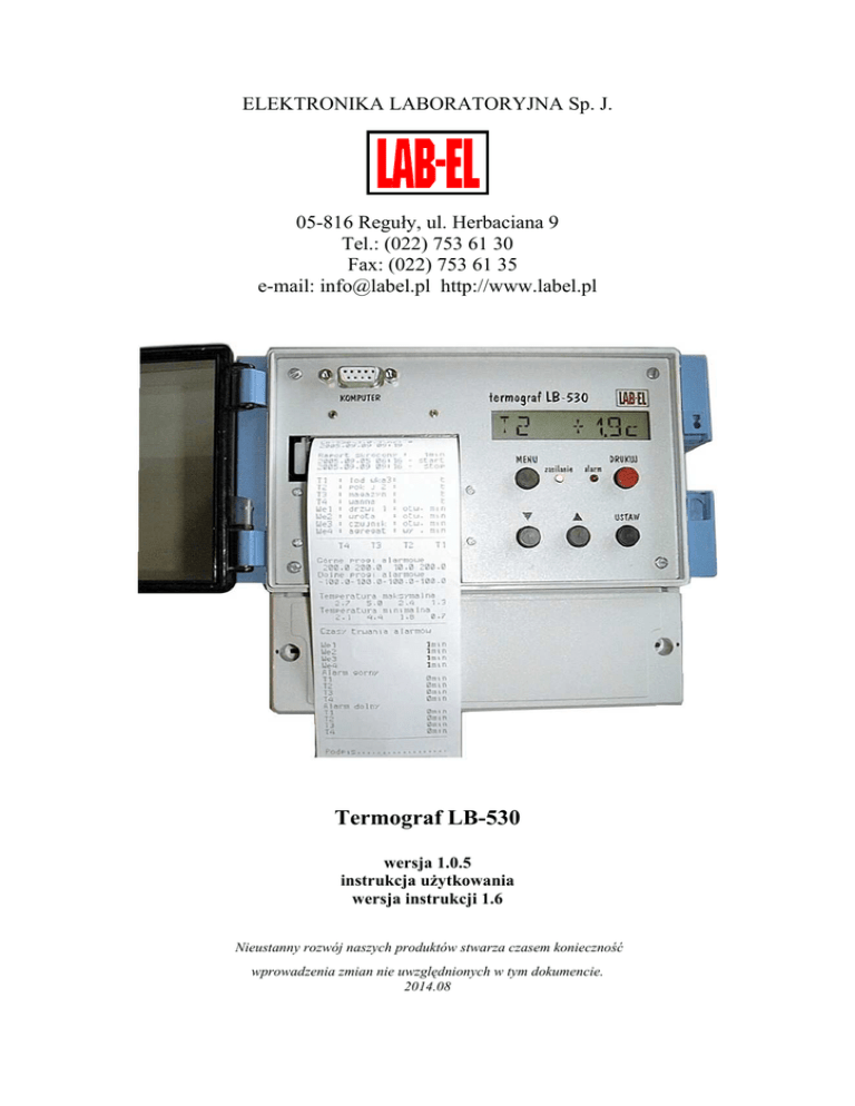 ELEKTRONIKA LABORATORYJNA Sp. J. 05-816 Reguły, ul. Herbaciana 9 Tel.: (022) 753 61 30 Fax: (022) 753 61 35 e-mail: [email protected] http://www.label.pl Termograf LB-530 wersja 1.0.5 instrukcja uŜytkowania wersja instrukcji 1.6 Nieustanny rozwój naszych produktów stwarza czasem konieczność wprowadzenia zmian nie uwzględnionych w tym dokumencie. 2014.08 LB-530 instrukcja uŜytkownika wersja 1.6 1. Opis. LB-530 jest wielokanałowym precyzyjnym rejestratorem temperatury. MoŜna do niego dołączyć od 1 do 4 czujników PT1000 lub PT100. Dodatkowo LB-530 moŜe rejestrować stan do 4 wejść typu zwarty / rozwarty. Wejścia te mogą przykładowo słuŜyć do kontroli otwarcia drzwi chłodni, pracy agregatu chłodni lub innych zdarzeń. Wartości mierzonych temperatur jak i stany wejść cyfrowych prezentowane są naprzemiennie na 8 znakowym wyświetlaczu LCD. Z kaŜdym kanałem temperatury oraz z kaŜdym wejściem cyfrowym moŜna skojarzyć progi alarmowe po przekroczeniu których rejestrator sygnalizować będzie alarm przez przerywany sygnał dźwiękowy i optyczny jak równieŜ uaktywnione zostanie wyjście alarmowe słuŜące do dołączenia zewnętrznego urządzenia sygnalizacyjnego. Rejestrator wyposaŜony jest w duŜą pamięć wyników pomiarów temperatur oraz stanów wejść cyfrowych. Dane gromadzone w pamięci moŜna przenieść do komputera klasy PC korzystając z dostępnego, specjalistycznego oprogramowania LOGGER. Oprogramowanie to umoŜliwia prezentacje i wydruk odczytanych danych w postaci tabeli, wykresów lub histogramów oraz raportów z wyliczonym czasem występowania alarmów w poszczególnych kanałach. Dodatkowo zarejestrowane dane mogą być w dowolnej chwili wydrukowane, bez udziału komputera, na wbudowanej w rejestrator drukarce termicznej. Dane drukowane są w postaci czytelnych raportów, które mogą posłuŜyć np. do udokumentowania dotrzymania załoŜonych warunków przechowywania lub transportu produktów. Rejestrator zasilany jest z zewnętrznego źródła prądu stałego o napięciu z przedziału 9..32V dzięki czemu moŜe być zasilany wprost z samochodowej instalacji elektrycznej 12/24V. Rejestrator wyposaŜony jest w akumulator podtrzymujący długotrwałą pracę urządzenia w przypadku zaniku zasilania głównego. W powyŜszym przypadku LB-530 nie traci swoich właściwości funkcjonalnych łącznie z moŜliwością wydruków raportów na wewnętrznej drukarce. 2. Zakres zastosowań. Zakres stosowania rejestratora jest bardzo rozległy i moŜe być uŜywany wszędzie tam gdzie istnieje konieczność nadzorowania temperatur w sposób ciągły niezaleŜnie od niebezpieczeństwa występowania zaników zasilania głównego (sieciowego). Wydruk raportów na wbudowanej drukarce jest niewątpliwą zaletą w sytuacji gdy dokumentowanie dotrzymania kontrolowanych warunków klimatycznych jest konieczne natychmiast bez konieczności uŜywania systemu komputerowego (komputer + program + drukarka) i bez względu na obecność czy brak zewnętrznego zasilania w chwili wydruku. Rejestrator LB-530 został zaprojektowany by spełniać ścisłe wymagania formalne dotyczące kontroli warunków przechowywania i transportu Ŝywności. • PN-EN 12830 : „Rejestratory temperatury stosowane podczas transportu, przechowywania i dystrybucji schłodzonej, zamroŜonej, głęboko zamroŜonej / szybko zamroŜonej Ŝywności i lodów”. • PN-EN 13485 : „Termometry do pomiaru temperatury, powietrza i wyrobu dla transportu, przechowywania i dystrybucji, schłodzonej, zamroŜonej, głęboko zamroŜonej Ŝywności i lodów – Badania, wymagania, przydatność”. 3. Dane techniczne. Pomiar temperatur: 1 do 4 czujników PT100 lub PT1000, pomiary w zakresie : -100..+ 200 °C, 2 LB-530 instrukcja uŜytkownika wersja 1.6 rozdzielczość pomiaru i rejestracji 0,1 °C, dokładność pomiaru : ±0,2 °C (± 1 ostatnia cyfra) w zakresie –40..+50 °C. ±0,5 °C (± 1 ostatnia cyfra) w zakresie –40..+50 °C. Wejścia cyfrowe : od 1 do 4 biernych czujników typu zwarty / rozwarty. Zasilanie : zewnętrzne źródło : 9..32V / 1,5A maksymalnie w trakcie wydruku, wewnętrzny akumulator : 6V/1,2Ah, podtrzymanie zegara i danych : bateria litowa CR2032 3V. Pamięć danych pomiarowych : maksymalna pojemność wyników pomiarów, przykłady: 6096 dla rejestracji 4 temperatur i 4 wejść typu zwarty / rozwarty, 10160 dla rejestracji 4 temperatur, 20320 dla rejestracji 2 temperatur, 30480 dla rejestracji 1 temperatury. interwał rejestracji : od 1 minuty do 4 godzin 15 minut, rejestracja kontynuowana do zapełnienia całej pamięci, lub z nadpisywaniem. Wbudowana drukarka : typ : drukarka termiczna, szerokość papieru : 58 mm. Wydruk raportów : czas objęty raportem : wydruk ciągły : inicjowany i kończony wciśnięciem klawisza ‘DRUKUJ’, wydruk bieŜących temperatur i stanu wejść z odstępem 1 minuty. raport bieŜący : aktualny pomiar temperatur i stan wejść typu zwarty / rozwarty, raport za ostatnie „n” godzin („n” – do ustawienia), raport dobowy : wydruk danych z ostatniej lub z „n-tej” doby roboczej wstecz („n” – do ustawienia), godzina początku i końca doby roboczej do ustawienia, raport od..do : wydruk danych z dowolnego przedziału czasu. Rodzaj raportu : Raport normalny : wydruk wszystkich danych z wybranego przedziału czasu, Raport skrótowy : wydruk wyłącznie wartości ekstremalnych, oraz czasów przekroczenia progów alarmowych w poszczególnych kanałach z wybranego przedziału czasu. Interfejs do połączenia z komputerem PC : RS232C. Oprogramowanie LOGGER zgodne z systemem Windows 98/NT/ME/2000/XP Wymiary zewnętrzne : szerokość – 190 mm, wysokość – 160 mm, głębokość –105 mm 3 LB-530 instrukcja uŜytkownika wersja 1.6 4. Obsługa przyrządu. 4.1 Wygląd przyrządu. Port szeregowy PC (A) Wyświetlacz LCD (B) Klawiatura i diody sygnalizacyjne (C) Osłona przyłączy (D) Przepusty na przewody (E) Dźwignia wałka (G) Rolka