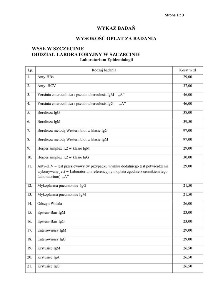Wykaz badań Laboratorium Epidemiologii wraz z