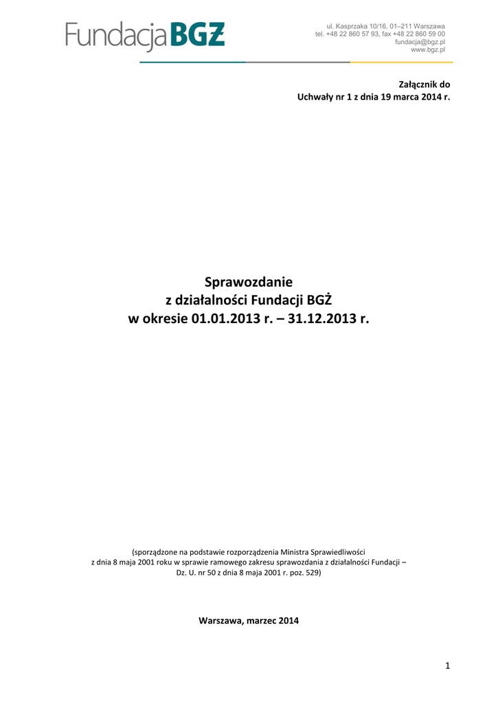 ul. Kasprzaka 10/16, 01–211 Warszawa tel. +48 22 860 57 93, fax +48 22 860 59 00 [email protected] www.bgz.pl Załącznik do Uchwały nr 1 z dnia 19 marca 2014 r. Sprawozdanie z działalności Fundacji BGŻ w okresie 01.01.2013 r. – 31.12.2013 r. (sporządzone na podstawie rozporządzenia Ministra Sprawiedliwości z dnia 8 maja 2001 roku w sprawie ramowego zakresu sprawozdania z działalności Fundacji – Dz. U. nr 50 z dnia 8 maja 2001 r. poz. 529) Warszawa, marzec 2014 1 ul. Kasprzaka 10/16, 01–211 Warszawa tel. +48 22 860 57 93, fax +48 22 860 59 00 [email protected] www.bgz.pl I. Dane Fundacji: 1. Nazwa Fundacji: Fundacja BGŻ 2. Adres: ul. Kasprzaka 10/16, 01 – 211 Warszawa, lok. 339 Data rejestracji: 11 lipca 2006 r. w Sądzie Rejonowym dla m. st. Warszawy w Warszawie, XII Wydział Gospodarczy Krajowego Rejestru Sądowego Fundacja została wpisana – do Rejestru Stowarzyszeń, Innych Organizacji Społecznych i Zawodowych, Fundacji oraz Publicznych Zakładów Opieki Zdrowotnej Krajowego Rejestru Sądowego pod numerem 0000260224. 3. Nr REGON: 140616847 4. Rodzaj przeważającej działalności wg Polskiej Klasyfikacji Działalności (PKD) 9499Z Działalność pozostałych organizacji członkowskich, gdzie indziej nie klasyfikowana. 5. Nr NIP: 527 25 12 248 6. Rachunek bankowy: 57 2030 0045 1110 0000 0121 3810 w Banku BGŻ przy ulicy Kasprzaka 10/16 w Warszawie. 7. Organ nadzoru: Minister Edukacji Narodowej 8. Fundacja nie prowadzi działalności gospodarczej. II. Informacje o założeniu Fundacji: Fundacja została powołana uchwałą nr 119/SG/24/2006 z dnia 24 kwietnia 2006 roku w sprawie powołania Fundacji BGŻ i przyjęcia statutu Fundacji. W dniu 29 maja 2006 roku sporządzony został akt notarialny Repertorium A pod nr 1976/2006. Fundusz założycielski wynosił 100 000 zł (słownie: sto tysięcy złotych). Czynności związane z wpisem do Rejestru Stowarzyszeń, Innych Organizacji Społecznych i Zawodowych, Fundacji oraz Publicznych Zakładów Opieki Zdrowotnej zostały zakończone w dniu 11 lipca 2006 roku. Pierwsze posiedzenie Rady Fundacji odbyło się w dniu 9 sierpnia 2006 r. W dniu 5 lutego 2007 roku Fundacja otrzymała status organizacji pożytku publicznego (decyzja Sądu Rejonowego dla m.st. Warszawy XII Wydział Gospodarczy). III. Władze Fundacji: Radę Fundacji stanowią: Przewodniczący Rady: Jacek Adam Bartkiewicz – Prezes Zarządu Banku BGŻ w dniu 28 marca 2013 r. złożył rezygnację z pełnienia funkcji w związku zakończeniem pracy w Banku BGŻ. W dniu 10 grudnia 2013 r. na to stanowisko Zarząd Banku BGŻ powołał Józefa Wancera. Magdalena Legęć – członek Rady – od 28 marca do 10 grudnia 2013 pełniła obowiązki przewodniczącego Rady Wiceprzewodniczący Rady: Witold Marek Okarma Sekretarz Rady: Andrzej Jacek Sieradz Członek Rady: Katarzyna Ewa Romaszewska – Rosiak Zarząd Fundacji stanowią: Małgorzata Zdzienicka-Grabarz – Prezes Zarządu Magdalena Żaczek – Wiceprezes Zarządu Magdalena Żaczek pełni funkcję wiceprezesa Zarządu od 15 stycznia 2013 r. Władze Fundacji, tj. wszyscy członkowie Rady i Zarządu pełnią funkcje społecznie. 2 ul. Kasprzaka 10/16, 01–211 Warszawa tel. +48 22 860 57 93, fax +48 22 860 59 00 [email protected] www.bgz.pl IV. Realizacja celów statutowych Fundacji: Celami statutowymi Fundacji są: 1. prowadzenie wszechstronnej działalności społecznie użytecznej, w tym podejmowanie i wspieranie inicjatyw w zakresie rozwoju edukacji, nauki, kultury, pomocy społecznej i ochrony zdrowia, 2. wspieranie i propagowanie inicjatyw służących podnoszeniu poziomu edukacyjnego społeczeństwa, w szczególności wyrównywanie szans rozwoju intelektualnego, edukacyjnego i zawodowego utalentowanej młodzieży z różnych środowisk, przede wszystkim z regionów i rodzin dotkniętych ubóstwem, 3. wspieranie idei wolontariatu pracowniczego oraz popularyzacja tej formy w środowisku bankowym i finansowym. 4. wspieranie działalności wspomagającej rozwój gospodarczy, w tym rozwój przedsiębiorczości wśród osób młodych, 5. upowszechnianie kultury fizycznej i sportu. Fundacja realizuje swoje cele poprzez: 1. przyznawanie i finansowanie stypendiów, nagród, wyróżnień oraz innych form wspierania nauki uzdolnionej młodzieży pochodzącej z niezamożnych środowisk, 2. inicjowanie i realizację projektów z zakresu społecznej odpowiedzialności biznesu, w szczególności na rzecz wyrównywania szans rozwoju edukacyjnego i zawodowego młodzieży, 3. świadczenie bezpośredniej i pośredniej pomocy rzeczowej i finansowej na rzecz podmiotów (osób prawnych i jednostek organizacyjnych nie mających osobowości prawnej) prowadzących działalność w zakresie ochrony zdrowia i pomocy społecznej, 4. wspieranie organizacyjne, rzeczowe i finansowe instytucji i organizacji edukacyjnych i naukowych, 5. wspieranie finansowe inicjatyw kulturalnych mających na celu zwiększenie dostępu społeczeństwa do dóbr kultury, 6. dofinansowywanie działań na rzecz rozwoju kultury fizycznej oraz różnych form wypoczynku dzieci i młodzieży. Fundacja nie wspiera osób indywidualnych. V. Finansowanie działalności Fundacji: W okresie sprawozdawczym Fundacja BGŻ otrzymała kwotę 2.680.941,70 (słownie: dwa miliony sześćset osiemdziesiąt tysięcy dziewięćset czterdzieści jeden złoty 70/100), w tym: a. darowizna z Banku BGŻ w wysokości 2.500.000,00 zł (słownie: dwa miliony pięćset tysięcy złotych 00/100) na cele statutowe oraz darowizna z budżetu darowizn w wysokości 160.000 zł (słownie: sto sześćdziesiąt tysięcy złotych 00/100), b. środki pochodzące z wpłat 1% podatku dochodowego od osób fizycznych oraz darowizn od osób fizycznych w wysokości 19.421,70 zł (słownie: dziewiętnaście tysięcy czterysta dwadzieścia jeden złotych 60/100), c. inne wpłaty w łącznej kwocie 1520 zł (słownie: tysiąc pięćset dwadzieścia złotych 00/100). 3 ul. Kasprzaka 10/16, 01–211 Warszawa 