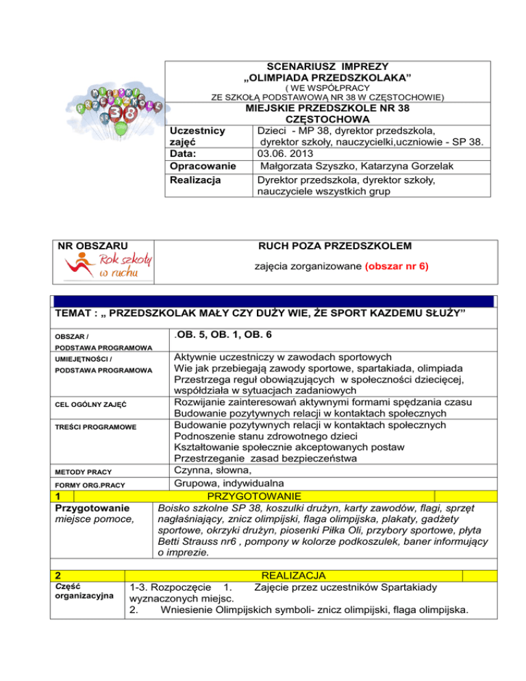 SCENARIUSZ IMPREZY „OLIMPIADA PRZEDSZKOLAKA” ( WE WSPÓŁPRACY ZE SZKOŁĄ PODSTAWOWĄ NR 38 W CZĘSTOCHOWIE) MIEJSKIE PRZEDSZKOLE NR 38 CZĘSTOCHOWA Uczestnicy Dzieci - MP 38, dyrektor przedszkola, zajęć dyrektor szkoły, nauczycielki,uczniowie - SP 38. Data: 03.06. 2013 Opracowanie Małgorzata Szyszko, Katarzyna Gorzelak Realizacja Dyrektor przedszkola, dyrektor szkoły, nauczyciele wszystkich grup NR OBSZARU RUCH POZA PRZEDSZKOLEM zajęcia zorganizowane (obszar nr 6) TEMAT : „ PRZEDSZKOLAK MAŁY CZY DUŻY WIE, ŻE SPORT KAZDEMU SŁUŻY” .OB. 5, OB. 1, OB. 6 OBSZAR / PODSTAWA PROGRAMOWA UMIEJĘTNOŚCI / PODSTAWA PROGRAMOWA CEL OGÓLNY ZAJĘĆ TREŚCI PROGRAMOWE METODY PRACY FORMY ORG.PRACY 1 Przygotowanie miejsce pomoce, 2 Część organizacyjna Aktywnie uczestniczy w zawodach sportowych Wie jak przebiegają zawody sportowe, spartakiada, olimpiada Przestrzega reguł obowiązujących w społeczności dziecięcej, współdziała w sytuacjach zadaniowych Rozwijanie zainteresowań aktywnymi formami spędzania czasu Budowanie pozytywnych relacji w kontaktach społecznych Budowanie pozytywnych relacji w kontaktach społecznych Podnoszenie stanu zdrowotnego dzieci Kształtowanie społecznie akceptowanych postaw Przestrzeganie zasad bezpieczeństwa Czynna, słowna, Grupowa, indywidualna PRZYGOTOWANIE Boisko szkolne SP 38, koszulki drużyn, karty zawodów, flagi, sprzęt nagłaśniający, znicz olimpijski, flaga olimpijska, plakaty, gadżety sportowe, okrzyki drużyn, piosenki Piłka Oli, przybory sportowe, płyta Betti Strauss nr6 , pompony w kolorze podkoszulek, baner informujący o imprezie. REALIZACJA 1-3. Rozpoczęcie 1. Zajęcie przez uczestników Spartakiady wyznaczonych miejsc. 2. Wniesienie Olimpijskich symboli- znicz olimpijski, flaga olimpijska. Część wstępna Część główna Zakończenie Dokumenty 3. Uroczyste otwarcie Spartakiady przez Dyrekcją Przedszkola i Szkoły Podstawowej. 4. Prezentacja drużyn- przemarsz wybranych wcześniej kapitanów drużyn z flagami przy muzyce. 5. Taniec czirliderek z pomponami. 6. Śpiew piosenki przewodniej Spartakiady ,, Piłka Oli” 7. Wymienienie stanowisk ćwiczeń. Rozdanie drużynom kart zawodów. 8. Wspólna rozgrzewka zawodników cz.I do muzyki Beti Strausswobodne ruchy dzieci 9. Rozgrzewka cz. II,, W trawie” Szumią trawy, szumią trawy Wiatr zaprasza do zabawy Szu, szu,szu Szu,szu,szu 10. Losowanie stanowisk. 11. Rozpoczęcie konkurencji sportowych: a) Latający talerz- dzieci w dwóch rzędach próbują trafić do kół hula hopu z odległości 3 metrów. b) Przejście w parach slalomem z woreczkiem na głowie na koniec rzut do otwartego parasola. c) Piłka, bramka, gol- Zabawa w parach, dziecko które trafi do bramki staje się bramkarzem. d) Kolorowa łąka- Dzieci wybierają sobie frotki z emblematami owadów, chwytają chustę i reagują na polecenia nauczyciela. e) Zabawa z balonami- podrzucanie balonów w parach za pomocą chusteczek animacyjnych. f) Slalom w parach – skoki w workach g) zabawa z woreczkami- podskoki wokół chusty, na hasło znajdź woreczekdzieci zabierają jeden woreczek z chusty. W każdej rundzie nauczyciel zabiera jeden woreczek. Zabawa trwa do momentu kiedy zostaje jeden zawodnik. Na cześć zwycięzcy hip hip hura...... h) zabawy z piłkami- rzuty w parach, przejście po równoważni. i) Nauczyciel pokazuje źdźbła trawy, a dzieci wykonują odpowiednie ćwiczenia: 1 trawka- dzieci wykonują obroty 2 trawki- dzieci wykonują pajacyki 3 trawki- dzieci podskakują na jednej nodze. 4 trawki- podskakują obunóż 5 trawek skłony tułowia w przód, nogi wyprostowane 6 trawek- przysiady. 12. Zakończenie imprezy sportowej. Zebranie kart zawodników. Wręczenie dyplomów i medali. 13. Pokaz mega baniek mydlanych. 14. Powrót do przedszkola. 15. Po obiedzie...Dyskoteka dla uczestników olimpiady. Scenariusz zajęć, zdjęcia