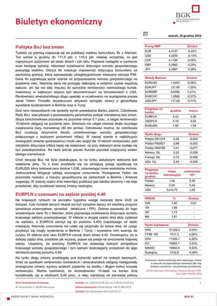 Biuletyn ekonomiczny wtorek, 20 grudnia 2016 Polityka BoJ bez zmian Fixing NBP Tydzień za granicą rozpoczął się od publikacji indeksu koniunktury Ifo z Niemiec. Ten wzrósł w grudniu do 111,0 pkt. z 110,4 pkt. miesiąc wcześniej, co jest najwyższym poziomem od około dwóch i pół roku. Poprawa nastąpiła w wymiarze ocen bieżącej sytuacji, natomiast oczekiwania dotyczące wzrostu gospodarczego pozostają stabilne. Odczyt Ifo redukuje niepewność dotyczącą koniunktury za zachodnią granicą, którą wprowadzały ubiegłotygodniowe mieszane odczyty PMI. Dane Ifo sygnalizują spore szanse na przyspieszenie wzrostu gospodarczego na przełomie roku. Niemniej dane nie pomogły słabnącej w ostatnim czasie wspólnej walucie, ani też nie dały impulsu do wzrostów rentowności niemieckiego bunda. Inwestorzy w większym stopniu byli skoncentrowani na doniesieniach z USA. Rentowności amerykańskiego długu spadały w oczekiwaniu na wystąpienie prezes Janet Yellen. Ponadto bezpiecznym aktywom sprzyjały obawy o geopolitykę wywołane wydarzeniami w Berlinie oraz w Turcji. EUR 4,4157 -0,22% USD 4,2255 -0,10% CHF 4,1185 0,08% GBP 5,2662 0,25% JPY 3,5967 0,39% Dziś rano niespodzianki nie sprawiły wyniki posiedzenia Banku Japonii. Członkowie Rady BoJ zdecydowali o pozostawieniu parametrów polityki monetarnej bez zmian. Stopa benchmarkowa pozostała na poziomie minus 0,1 proc., a target rentowności 10-letnich obligacji na poziomie zera. Zmianom nie uległa również skala rocznego zwiększania bazy monetarnej (80 bln jenów). Odnotować można, że członkowie BoJ oczekują utrzymania trendu umiarkowanego wzrostu gospodarczego połączonego z wyższymi poziomami inflacji. W naszej ocenie w najbliższych miesiącach zmianie (podniesieniu) może ulec target dla 10-letnich rentowności, jeśli założenia dotyczące inflacji będą się realizować, co przy słabszym jenie wydaje się być prawdopodobne. Na razie jednak prezes Kuroda pozostał sceptyczny wobec takiego scenariusza. Prognoza na koniec EURPLN Choć decyzja BoJ nie była zaskakująca, to na rynku walutowym widoczne jest osłabienie jena. To z kolei przekłada się na silniejszą presję spadkową na EURUSD, który testował rano okolice 1,038, ustanawiając nowe wieloletnie minima. Jednocześnie obligacje oddają wczorajsze umocnienie. Wystąpienie Yellen nie przyniosło nowości, a impulsy geopolityczne po zamachach w Berlinie i Ankarze wygasają. W dalszej części dnia kalendarz publikacji jest bardzo skromny i nie daje przesłanek, aby oczekiwać istotnej zmiany nastrojów. Zmiana Waluty Bazowe Zmiana EURUSD 1,0403 -0,46% EURJPY 121,80 -1,25% EURGBP 0,8392 0,21% EURCHF 1,0686 -0,37% USDJPY 117,09 -0,77% grudnia marca 4,42 4,38 USDPLN 4,19 4,04 EURUSD 1,06 1,09 Rynki długu Zmiana Polska OK1018 2,00 -0,043 Polska PS0421 2,68 -0,002 Polska DS0726 3,41 -0,071 Niemcy 10L 0,25 -0,059 Francja 10L 0,73 -0,068 USA 10L 2,54 -0,055 Prognoza na koniec grudnia Polska stopa referencyjna rentowność 10Y 1,50 3,50 0,00 0,42 0,5-0,75 2,55 Niemcy USA EURPLN z szansami na zejście poniżej 4,40 Na krajowych rynkach na początku tygodnia uwagę zwracały dane GUS za listopad. Cały komplet danych okazał się być wyraźnie lepszy od mediany prognoz (produkcja przemysłowa, sprzedaż detaliczna i PPI). Dobrze pasowały do tego wcześniejsze dane Ifo z Niemiec, które poprawiają oczekiwania dotyczące wzrostu krajowego sektora przemysłowego. W efekcie w drugiej części dnia złoty zyskiwał na wartości, a EURPLN obniżył się do poziomu 4,403 (najniższego od około miesiąca). Niemniej umocnienia nie udało się utrzymało do końca dnia, do czego przyłożyć się mogły wydarzenia w Berlinie i Turcji, i wywołana nimi awersja do ryzyka. W efekcie dziś rano EURPLN zaczął dzień blisko 4,42. Oczekujemy, że w dalszej części dnia, podobnie jak wczoraj, pojawi się presja na umocnienie krajowej waluty. Uważamy, że poziomy EURPLN nie doważają dobrych perspektyw krajowego wzrostu gospodarczego i tym samym dostrzegamy przestrzeń do jego obniżenia poniżej poziomu 4,40. Na rynku długu zmiany przebiegały pod dyktando wahań na rynkach bazowych. Wraz ze spadkami rentowności niemieckich i amerykańskich obligacji następowały analogiczne zmiany wyceny polskich papierów na środku i długim końcu krzywej rentowności. Można nadmienić, że dochodowości 10-latek na koniec dnia kształtowały się w okolicach 3,40 proc., a więc najniższej od pierwszej połowy Bank Gospodarstwa Krajowego Kontakt: tel. (+48 22) 52-29-211, tel. (+48 22) 52-29-211 Al. Jerozolimskie 7, 00-955 Warszawa Główny Ekonomista Tomasz Kaczor +48 22 596 59 13 Analityk Piotr Dmitrowski +48 22 522 92 17 WIBOR % Zmiana O/N 1,60 -0,01 1M 1,66 - 3M 1,73 - 6M 1,81 - Rynki kapitałowe Zmiana WIG 51129,3 0,03% FTSE 100 7017,2 0,08% DAX 11426,7 0,20% DJI 19883,1 0,20% NIKKEI 19494,5 0,53% Szanghaj 3102,9 -0,49% Notowania z końca ostatniego dnia roboczego, zmiana w stosunku do poprzedniego notowania (dla stóp banków centralnych - od ostatniego posiedzenia). Źródła informacji: Bloomberg, Thomson Reuters, PAP, GUS, NBP, NYMEX, GPW 1 Biuletyn ekonomiczny wtorek, 20 grudnia 2016 że polskie papiery nadal będą wrażliwe na ruchy na rynkach bazowych i widoczne rano zagranicą oddawanie wczorajszego umocnienia przełoży się na przesuniecie krzywej w górę. listopada. Wpływ krajowych danych makro ograniczył się do utrzymania rentowności krótkiego końca krzywej na poziomie przekraczającym 2,0 proc. W najbliższym czasie oczekiwać można typowego dla okresu świątecznego ograniczenia obrotów. Jednocześnie dzisiaj oczekujemy, Kalendarz publikacji danych makroekonomicznych Data Godz Kraj Publikacja Okres Jednostka Prognoza Konsensus Poprzednio 20 gru 10:00 EU paz mld - - 29,8 21 gru 16:00 US lis mln - 5,5 5,6 22 gru 14:30 US Bilans obrotów bieżących Sprzedaż domów na rynku wtórnym Zamówienia na dobra trwałe lis % - -4,7 4,6 22 gru 14:30 US N