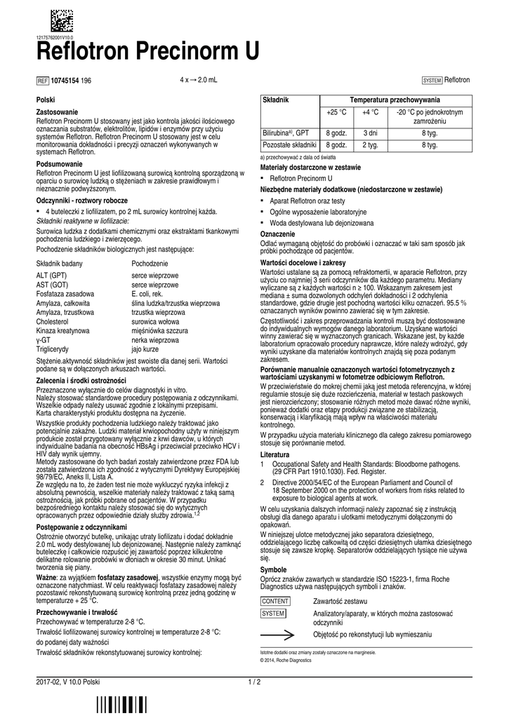 12175762001V10.0 Reflotron Precinorm U 4 x → 2.0 mL 10745154 196 Reflotron Polski Składnik Zastosowanie Reflotron Precinorm U stosowany jest jako kontrola jakości ilościowego oznaczania substratów, elektrolitów, lipidów i enzymów przy użyciu systemów Reflotron. Reflotron Precinorm U stosowany jest w celu monitorowania dokładności i precyzji oznaczeń wykonywanych w systemach Reflotron. Podsumowanie Reflotron Precinorm U jest liofilizowaną surowicą kontrolną sporządzoną w oparciu o surowicę ludzką o stężeniach w zakresie prawidłowym i nieznacznie podwyższonym. Odczynniki - roztwory robocze ▪ 4 buteleczki z liofilizatem, po 2 mL surowicy kontrolnej każda. Składniki reaktywne w liofilizacie: Surowica ludzka z dodatkami chemicznymi oraz ekstraktami tkankowymi pochodzenia ludzkiego i zwierzęcego. Pochodzenie składników biologicznych jest następujące: Składnik badany Pochodzenie ALT (GPT) AST (GOT) Fosfataza zasadowa Amylaza, całkowita Amylaza, trzustkowa Cholesterol Kinaza kreatynowa γ-GT Triglicerydy serce wieprzowe serce wieprzowe E. coli, rek. ślina ludzka/trzustka wieprzowa trzustka wieprzowa surowica wołowa mięśniówka szczura nerka wieprzowa jajo kurze Stężenie.aktywność składników jest swoiste dla danej serii. Wartości podane są w dołączonych arkuszach wartości. Zalecenia i środki ostrożności Przeznaczone wyłącznie do celów diagnostyki in vitro. Należy stosować standardowe procedury postępowania z odczynnikami. Wszelkie odpady należy usuwać zgodnie z lokalnymi przepisami. Karta charakterystyki produktu dostępna na życzenie. Wszystkie produkty pochodzenia ludzkiego należy traktować jako potencjalnie zakaźne. Ludzki materiał krwiopochodny użyty w niniejszym produkcie został przygotowany wyłącznie z krwi dawców, u których indywidualne badania na obecność HBsAg i przeciwciał przeciwko HCV i HIV dały wynik ujemny. Metody zastosowane do tych badań zostały zatwierdzone przez FDA lub została zatwierdzona ich zgodność z wytycznymi Dyrektywy Europejskiej 98/79/EC, Aneks II, Lista A. Ze względu na to, że żaden test nie może wykluczyć ryzyka infekcji z absolutną pewnością, wszelkie materiały należy traktować z taką samą ostrożnością, jak próbki pobrane od pacjentów. W przypadku bezpośredniego kontaktu należy stosować się do wytycznych opracowanych przez odpowiednie działy służby zdrowia.1,2 Postępowanie z odczynnikami Ostrożnie otworzyć butelkę, unikając utraty liofilizatu i dodać dokładnie 2.0 mL wody destylowanej lub dejonizowanej. Następnie należy zamknąć buteleczkę i całkowicie rozpuścić jej zawartość poprzez kilkukrotne delikatne rolowanie probówki w dłoniach w okresie 30 minut. Unikać tworzenia się piany. Ważne: za wyjątkiem fosfatazy zasadowej, wszystkie enzymy mogą być oznaczone natychmiast. W celu reaktywacji fosfatazy zasadowej należy pozostawić rekonstytuowaną surowicę kontrolną przez jedną godzinę w temperaturze + 25 °C. Przechowywanie i trwałość Przechowywać w temperaturze 2‑8 °C. Trwałość liofilizowanej surowicy kontrolnej w temperaturze 2‑8 °C: do podanej daty ważności Trwałość składników rekonstytuowanej surowicy kontrolnej: +4 °C -20 °C po jednokrotnym zamrożeniu Bilirubinaa), GPT 8 godz. 3 dni 8 tyg. Pozostałe składniki 8 godz. 2 tyg. 8 tyg. a) przechowywać z dala od światła Materiały dostarczone w zestawie ▪ Reflotron Precinorm U Niezbędne materiały dodatkowe (niedostarczone w zestawie) ▪ Aparat Reflotron oraz testy ▪ Ogólne wyposażenie laboratoryjne ▪ Woda destylowana lub dejonizowana Oznaczenie Odlać wymaganą objętość do probówki i oznaczać w taki sam sposób jak próbki pochodzące od pacjentów. Wartości docelowe i zakresy Wartości ustalane są za pomocą refraktomertii, w aparacie Reflotron, przy użyciu co najmniej 3 serii odczynników dla każdego parametru. Mediany wyliczane są z każdych wartości n ≥ 100. Wskazanym zakresem jest mediana ± suma dozwolonych odchyleń dokładności i 2 odchylenia standardowe, gdzie drugie jest pochodną wartości kilku oznaczeń. 95.5 % oznaczanych wyników powinno zawierać się w tym zakresie. Częstotliwość i zakres przeprowadzania kontroli muszą być dostosowane do indywidualnych wymogów danego laboratorium. Uzyskane wartości winny zawierać się w wyznaczonych granicach. Wskazane jest, by każde laboratorium opracowało procedury naprawcze, które należy wdrożyć, gdy wyniki uzyskane dla materiałów kontrolnych znajdą się poza podanym zakresem. Porównanie manualnie oznaczonych wartości fotometrycznych z wartościami uzyskanymi w fotometrze odbiciowym Reflotron. W przeciwieństwie do mokrej chemii jaką jest metoda referencyjna, w której regularnie stosuje się duże rozcieńczenia, materiał w testach paskowych jest nierozcieńczony; stosowanie różnych metod może dawać różne wyniki, ponieważ dodatki oraz etapy produkcji związane ze stabilizacją, konserwacją i klaryfikacją mają wpływ na właściwości materiału kontrolnego. W przypadku użycia materiału klinicznego dla całego zakresu pomiarowego stosuje się porównanie metod. Literatura 1 Occupational Safety and Health Standards: Bloodborne pathogens. (29 CFR Part 1910.1030). Fed. Register. 2 Directive 2000/54/EC of the European Parliament and Council of 18 September 2000 on the protection of workers from risks related to exposure to biological agents at work. W celu uzyskania dalszych informacji należy zapoznać się z instrukcją obsługi dla danego aparatu i ulotkami metodycznymi dołączonymi do opakowań. W niniejszej ulotce metodycznej jako separatora dziesiętnego, oddzielającego liczbę całkowitą od części dziesiętnych ułamka dziesiętnego stosuje się zawsze kropkę. Separatorów oddzielających tysiące nie używa się. Symbole Oprócz znaków zawartych w standardzie ISO 15223‑1, firma Roche Diagnostics używa następujących symboli i znaków.