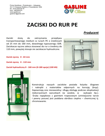 Firma Handlowo - Produkcyjno – Usługowa 33-111 Koszyce Wielkie ul. Kryształowa 184b tel.: (014) 634-05-70 kom.: 662383370 www.gasline.pl [email protected] ZACISKI DO RUR PE Producent Zaciski służą do zatrzymania przepływu transportowanego medium w rurach PE o średnicach od 25 mm do 160 mm, dowolnego typoszeregu SDR. Zaciskacze ręczne zaleca stosować do rur o średnicy do 110 mm, powyżej stosuje sie zaciskacze hydrauliczne. Zacisk ręczny 0 - 63 mm Zacisk ręczny 0 - 110 mm Zacisk hydrauliczny 0 - 160 mm (0-180 opcja) (100 kN) Konstrukcja naszych zacisków posiada łożyska ślizgowe i nakrętki z materiałów odpornych na korozję (brąz). Zapewniają one niezawodną i długą obsługę podczas eksploatacji niekorzystnych warunkach (w wodzie, w wykopie itp.). Śruba napędowa z gwintem trapezowym (zmniejszone tarcie i pewny posuw) jest poddana obróbce cieplno – chemicznej tj. chromowanie.