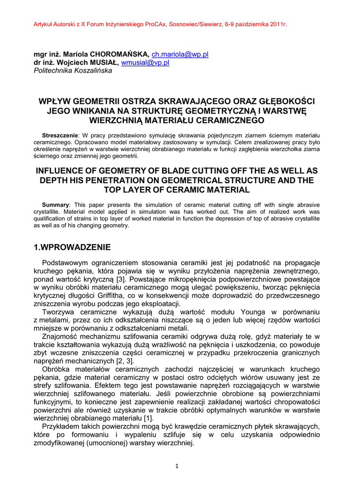 Artykuł Autorski z X Forum Inżynierskiego ProCAx, Sosnowiec/Siewierz, 6-9 października 2011r. mgr inż. Mariola CHOROMAŃSKA, [email protected] dr inż. Wojciech MUSIAŁ, [email protected] Politechnika Koszalińska WPŁYW GEOMETRII OSTRZA SKRAWAJĄCEGO ORAZ GŁĘBOKOŚCI JEGO WNIKANIA NA STRUKTURĘ GEOMETRYCZNĄ I WARSTWĘ WIERZCHNIĄ MATERIAŁU CERAMICZNEGO Streszczenie: W pracy przedstawiono symulację skrawania pojedynczym ziarnem ściernym materiału ceramicznego. Opracowano model materiałowy zastosowany w symulacji. Celem zrealizowanej pracy było określenie naprężeń w warstwie wierzchniej obrabianego materiału w funkcji zagłębienia wierzchołka ziarna ściernego oraz zmiennej jego geometrii. INFLUENCE OF GEOMETRY OF BLADE CUTTING OFF THE AS WELL AS DEPTH HIS PENETRATION ON GEOMETRICAL STRUCTURE AND THE TOP LAYER OF CERAMIC MATERIAL Summary: This paper presents the simulation of ceramic material cutting off with single abrasive crystallite. Material model applied in simulation was has worked out. The aim of realized work was qualification of strains in top layer of worked material in function the depression of top of abrasive crystallite as well as of his changing geometry. 1.WPROWADZENIE Podstawowym ograniczeniem stosowania ceramiki jest jej podatność na propagacje kruchego pękania, która pojawia się w wyniku przyłożenia naprężenia zewnętrznego, ponad wartość krytyczną [3]. Powstające mikropęknięcia podpowierzchniowe powstające w wyniku obróbki materiału ceramicznego mogą ulegać powiększeniu, tworząc pęknięcia krytycznej długości Griffitha, co w konsekwencji może doprowadzić do przedwczesnego zniszczenia wyrobu podczas jego eksploatacji. Tworzywa ceramiczne wykazują dużą wartość modułu Younga w porównaniu z metalami, przez co ich odkształcenia niszczące są o jeden lub więcej rzędów wartości mniejsze w porównaniu z odkształceniami metali. Znajomość mechanizmu szlifowania ceramiki odgrywa dużą rolę, gdyż materiały te w trakcie kształtowania wykazują dużą wrażliwość na pęknięcia i uszkodzenia, co powoduje zbyt wczesne zniszczenia części ceramicznej w przypadku przekroczenia granicznych naprężeń mechanicznych [2, 3]. Obróbka materiałów ceramicznych zachodzi najczęściej w warunkach kruchego pękania, gdzie materiał ceramiczny w postaci ostro odciętych wiórów usuwany jest ze strefy szlifowania. Efektem tego jest powstawanie naprężeń rozciągających w warstwie wierzchniej szlifowanego materiału. Jeśli powierzchnie obrobione są powierzchniami funkcyjnymi, to konieczne jest zapewnienie realizacji zakładanej wartości chropowatości powierzchni ale również uzyskanie w trakcie obróbki optymalnych warunków w warstwie wierzchniej obrabianego materiału [1]. Przykładem takich powierzchni mogą być krawędzie ceramicznych płytek skrawających, które po formowaniu i wypaleniu szlifuje się w celu uzyskania odpowiednio zmodyfikowanej (umocnionej) warstwy wierzchniej. 1 Artykuł Autorski z X Forum Inżynierskiego ProCAx, Sosnowiec/Siewierz, 6-9 października 2011r. Zaprezentowane w referacie symulacje komputerowe mają na celu zgrubne oszacowanie głębokości wnikania ziaren ściernych w obrabiany materiał w taki sposób, aby wartości naprężeń w warstwie wierzchniej zostały zminimalizowane. Dodatkowym ważnym zagadnieniem jest analiza geometrii ziaren ściernych pracujących w strefie szlifowania tak aby zredukować efekty kruchego pękania obrabianego materiału ceramicznego. W niniejszej pracy opracowano algorytm analizy numerycznej w programie ANSYS/LSDyna, przy wykorzystaniu metody elementów skończonych wraz z warunkami początkowymi i brzegowymi [4, 5]. Model ten wykorzystano do analizy stanów odkształceń i naprężeń dla przypadku procesu szlifowania pojedynczym ziarnem ściernym (hipotetyczny materiał o idealnej sztywności), ceramiki korundowej (Al203). 2. MODEL KOMPUTEROWY W opracowanej aplikacji w środowisku Ansys/LS DYNA 11 obiekt zamodelowano jako płaski (2D), dla przypadku płaskiego stanu odkształcenia i przestrzennego stanu naprężenia [5]. Narzędzie traktowano jako ciało idealnie sztywne ( E ), natomiast materiał obrabiany jako sprężysto/lepko – plastyczny Cowpera – Symondsa. W modelu wykorzystuje się warunek plastyczności Hubera – Misesa – Hencky’ego oraz stowarzyszone prawo płynięcia. Model Cowpera – Symondsa uwzględnia liniowoizotropowe ( 1) , kinematyczne ( 0) (przyjęte w symulacjach) lub mieszane (0 1) wzmocnienie plastyczne oraz wpływ intensywności prędkości odkształcenia plastycznego, według zależności potęgowej [3]: i( p) / C)]m (R e E p i(p) ) (1) p [1 ( jest parametrem umocnienia, Re [MPa] – początkowa, statyczna granica plastyczności, ( p) 1 i [s ] – intensywność prędkości odkształceń plastycznych, C [ s 1] – parametr materiałowy określający wpływ intensywności prędkości odkształcenia plastycznego, m 1 / P – stała materiałowa określająca wrażliwość materiału na prędkość odkształcenia plastycznego, i( p ) [] – intensywność odkształcenia plastycznego, Ep ET E E ET – parametr materiałowy zależny od modułu umocnienia plastycznego i modułu sprężystości Younga E. Zarówno przedmiot, jak i narzędzie dyskretyzowano elementami czterowęzłowymi typu PLANE 162, z liniową funkcją kształtu. W obszarze kontaktu warunki brzegowe dla przemieszczeń są nieznane. Na narzędzie nałożono przemieszczenie w kierunku y na głębokość równą uy = 0,05 μm. Odebrano translacyjne oraz rotacyjne stopnie swobody dla węzłów na spodzie przedmiotu. Obliczenia przeprowadzono dla następujących danych materiałowych (Al203): początkowa granica plastyczności Re 4500 MPa, współczynnik E T p / i( p) Poissona 0,24 i moduł Younga E 345 GPa, moduł umocnienia linowego ET 0 , parametr umocnienia 1 , intensywności prędkości odkształcenia plastycznego C 11012 , wrażliwość materiału na pr