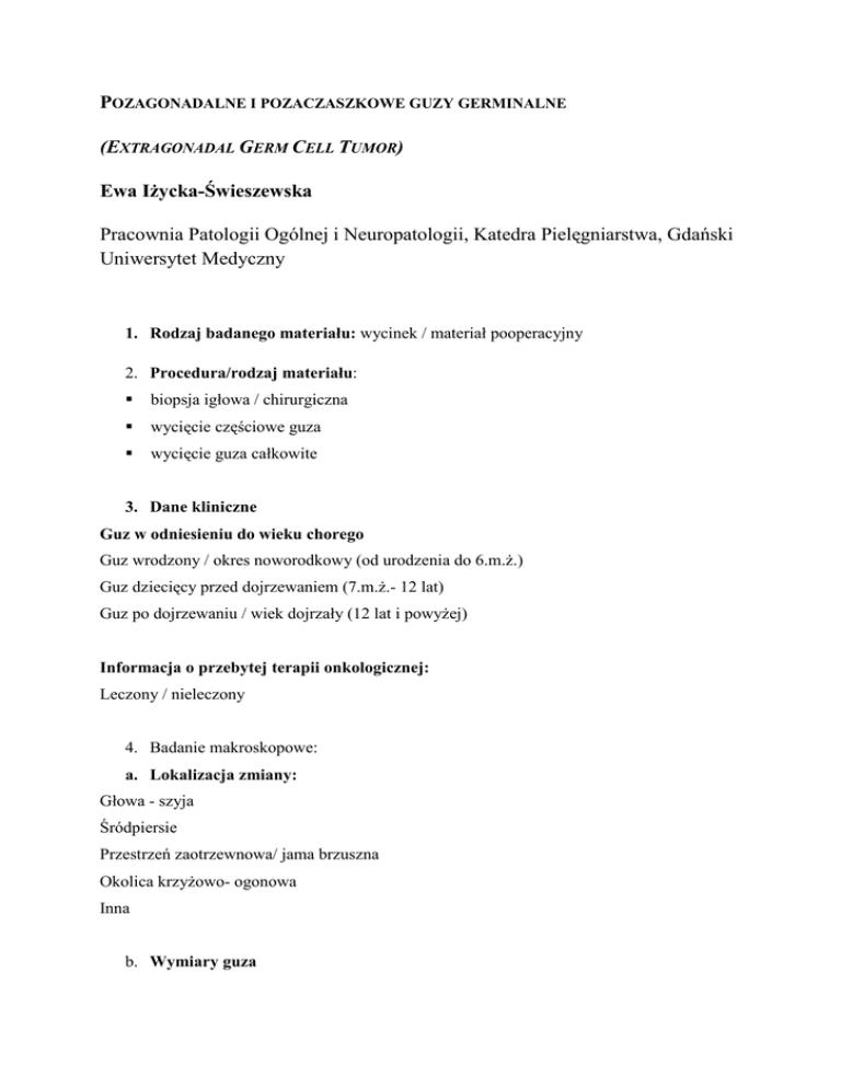 POZAGONADALNE I POZACZASZKOWE GUZY GERMINALNE (EXTRAGONADAL GERM CELL TUMOR) Ewa IŜycka-Świeszewska Pracownia Patologii Ogólnej i Neuropatologii, Katedra Pielęgniarstwa, Gdański Uniwersytet Medyczny 1. Rodzaj badanego materiału: wycinek / materiał pooperacyjny 2. Procedura/rodzaj materiału: biopsja igłowa / chirurgiczna wycięcie częściowe guza wycięcie guza całkowite 3. Dane kliniczne Guz w odniesieniu do wieku chorego Guz wrodzony / okres noworodkowy (od urodzenia do 6.m.Ŝ.) Guz dziecięcy przed dojrzewaniem (7.m.Ŝ.- 12 lat) Guz po dojrzewaniu / wiek dojrzały (12 lat i powyŜej) Informacja o przebytej terapii onkologicznej: Leczony / nieleczony 4. Badanie makroskopowe: a. Lokalizacja zmiany: Głowa - szyja Śródpiersie Przestrzeń zaotrzewnowa/ jama brzuszna Okolica krzyŜowo- ogonowa Inna b. Wymiary guza Nie moŜna ustalić c. Makroskopowy stopień zaawansowania (zaleŜnie od lokalizacji określić stosunek do struktur anatomicznych) 5. Badanie mikroskopowe: a. Typ histologiczny guza: SNOMED CODE: 402878003 Klasyfikacja WHO jak dla guzów gonadalnych lub Klasyfikacja wg Moran: Potworniak (Teratomatous) - dojrzały potworniak (teratoma maturum) - niedojrzały potworniak (teratoma immaturum) - dojrzały lub niedojrzały potworniak z dodatkowym (heterologicznym) komponentem złośliwym Typ I: Teratoma z komponentem innego guza germinalnego Określić typ i odsetek Typ II: Teratoma z komponentem raka Określić typ i odsetek Typ III: Teratoma z komponentem mięsaka Określić typ i odsetek Typ IV: Teratoma z komponentem złośliwym złoŜonym Inny niŜ potworniak (Nonteratomatous) - germinoma (seminoma) - guz pęcherzyka Ŝółtkowego (yolk sac tumor) - rak zarodkowy (embryonal carcinoma) - kosmówczak złośliwy (choriocarcinoma) - mieszany guz germinalny (combined nonteratomatous germ cell tumor) - nieokreślony b. Doszczętność resekcji/ marginesy: Guz usunięty w całości / resekcja niedoszczętna marginesy wolne od nowotworu (odległość guza od najbliŜszego brzegu w mm lub cm) / nacieczone przez nowotwór (określić który margines) nie moŜna ocenić Inwazja naczyń chłonnych/ krwionośnych: obecna.…, nieobecna…., nieokreślona c. Stan węzłów chłonnych: pNx- nieznany, nie dotyczy pN1- obecny przerzut określić miejsce węzła, określić typ histologiczny, liczbę zajętych węzłów na liczbę węzłów zbadanych d. Przerzuty odległe: - nie dotyczy - pM1- przerzut obecny wielkość największego ogniska, określić typ histologiczny 6. Badania specjalne: Badania immunohistochemiczne, jeśli dotyczy- CKAE1/AE3, CD117, CD30, OCT4, glypican-3, SALL4, AFP, HCG, PLAP Dodatkowe badania kliniczne i laboratoryjne: Markery serologiczne (AFP, bHCG) Współistniejące zespoły genetyczne Współistniejące nowotwory złośliwe Badania cytogenetyczne UWAGI DODATKOWE: Grading potworniaków niedojrzałych - nie ma określonej skali. W potworniakach śródpiersia po pokwitaniu istotne jest określenie odsetka elementów niedojrzałych (niedojrzałej mezenchymy, neuroepithelium, chrząstki i elementów gruczołowych). MoŜna uŜywać skali Norrisa stosowanej w potworniakach jajnika, ale w guzach pozagonadalnych nie ma to znaczenia prognostycznego (G1, G2, G3 w zaleŜności od odsetka niedojrzałego neuroepithelium). Ocena efektu leczenia w guzach po wstępnym leczeniu onkologicznym: Brak Ŝywego utkania nowotworowego śywe utkanie <10% powierzchni śywe utkanie ≥10% powierzchni Nie dotyczy Ocena mikroskopowa zaawansowania: W guzach krzyŜowo- ogonowych naleŜy odnieść się do naciekania kości; istotne poszukiwanie komponentu yolk sac tumor W guzach śródpiersia odnieść się do naciekania opłucnej, osierdzia i wielkich naczyń Staging: W pozagonadalnych guzach terminalnych nie określa się skali pTNM; stosowane są róŜne skale zaleŜnie od lokalizacji zmiany i wieku pacjenta. Stopień zaawansowania: W przypadkach u dzieci wg Children’s Oncology Group Stasing for any Malignant Extragonadal Germ Cell Tumors: I- usunięcie całkowite, marginesy ujemne, markery nowotworowe dodatnie lub ujemne II- rezydualne mikroskopowe utkanie guza, węzły chłonne wolne, markery nowotworowe dodatnie lub ujemne III- rezydualne makroskopowe utkanie guza lub przeprowadzona biopsja chirurgiczna zmiany; węzły chłonne dodatnie lub ujemne, markery nowotworowe dodatnie lub ujemne IV- obecne przerzuty odległe, włączając wątrobę U dorosłych modyfikacje narządowe systemu wg Moran i Suster Proposed Clinical Staging for Mediastinal Germ Cell Tumors: I- dobrze odgraniczony guz z lub bez zrostów opłucnowych/ osierdziowych ale bez mikroskopowego naciekania przylegających struktur II- guz ograniczony do śródpiersia z makro lub mikroskopowym naciekaniem przyległych struktur (oplucna, osierdzie, duŜe naczynia) III- guz z przerzutami: IIIA- do narządów klatki piersiowej (płuco, węzły) IIIB- przerzuty do narządów poza klatką piersiową Piśmiennictwo: 1. Protocol for the Examination of Specimens From Pediatric and Adult Patients With Extragonadal Germ Cell Tumors http://www.cap.org/apps/docs/committees/cancer/cancer_protocols/2012/GermCell_1 2protocol.pdf