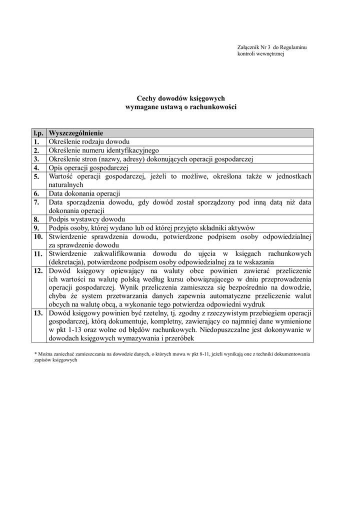 Załącznik Nr 3 do Regulaminu kontroli wewnętrznej Cechy dowodów księgowych wymagane ustawą o rachunkowości l.p. 1. 2. 3. 4. 5. 6. 7. 8. 9. 10. 11. 12. 13. Wyszczególnienie Określenie rodzaju dowodu Określenie numeru identyfikacyjnego Określenie stron (nazwy, adresy) dokonujących operacji gospodarczej Opis operacji gospodarczej Wartość operacji gospodarczej, jeżeli to możliwe, określona także w jednostkach naturalnych Data dokonania operacji Data sporządzenia dowodu, gdy dowód został sporządzony pod inną datą niż data dokonania operacji Podpis wystawcy dowodu Podpis osoby, której wydano lub od której przyjęto składniki aktywów Stwierdzenie sprawdzenia dowodu, potwierdzone podpisem osoby odpowiedzialnej za sprawdzenie dowodu Stwierdzenie zakwalifikowania dowodu do ujęcia w księgach rachunkowych (dekretacja), potwierdzone podpisem osoby odpowiedzialnej za te wskazania Dowód księgowy opiewający na waluty obce powinien zawierać przeliczenie ich wartości na walutę polską według kursu obowiązującego w dniu przeprowadzenia operacji gospodarczej. Wynik przeliczenia zamieszcza się bezpośrednio na dowodzie, chyba że system przetwarzania danych zapewnia automatyczne przeliczenie walut obcych na walutę obcą, a wykonanie tego potwierdza odpowiedni wydruk Dowód księgowy powinien być rzetelny, tj. zgodny z rzeczywistym przebiegiem operacji gospodarczej, którą dokumentuje, kompletny, zawierający co najmniej dane wymienione w pkt 1-13 oraz wolne od błędów rachunkowych. Niedopuszczalne jest dokonywanie w dowodach księgowych wymazywania i przeróbek * Można zaniechać zamieszczania na dowodzie danych, o których mowa w pkt 8-11, jeżeli wynikają one z techniki dokumentowania zapisów księgowych