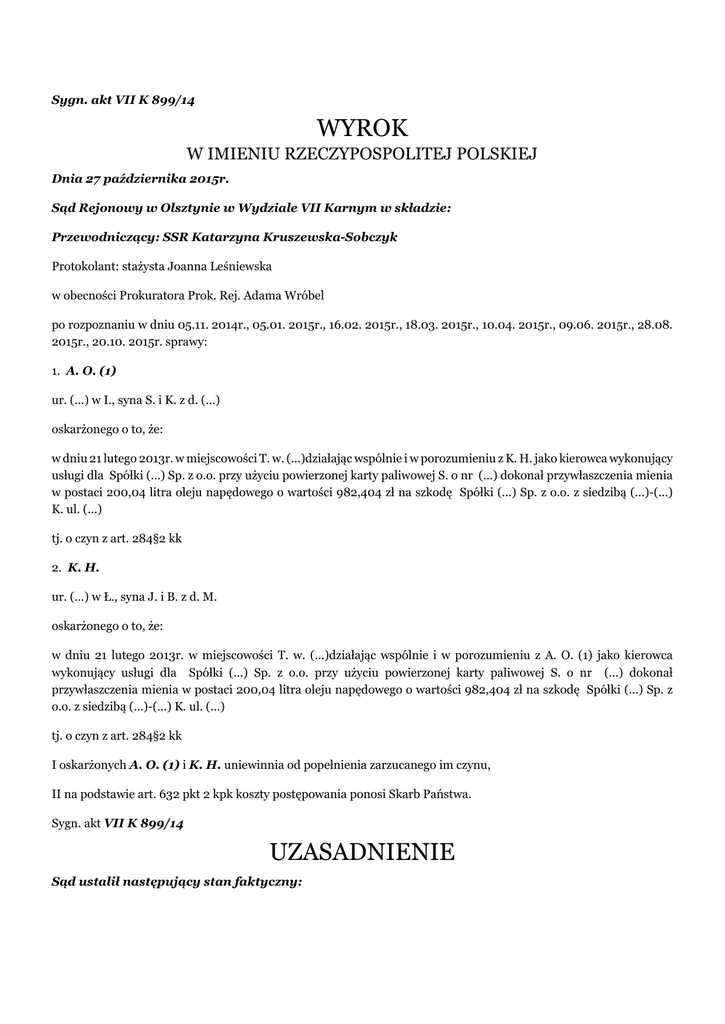 Sygn. akt VII K 899/14 WYROK W IMIENIU RZECZYPOSPOLITEJ POLSKIEJ Dnia 27 października 2015r. Sąd Rejonowy w Olsztynie w Wydziale VII Karnym w składzie: Przewodniczący: SSR Katarzyna Kruszewska-Sobczyk Protokolant: stażysta Joanna Leśniewska w obecności Prokuratora Prok. Rej. Adama Wróbel po rozpoznaniu w dniu 05.11. 2014r., 05.01. 2015r., 16.02. 2015r., 18.03. 2015r., 10.04. 2015r., 09.06. 2015r., 28.08. 2015r., 20.10. 2015r. sprawy: 1. A. O. (1) ur. (...) w I., syna S. i K. z d. (...) oskarżonego o to, że: w dniu 21 lutego 2013r. w miejscowości T. w. (...)działając wspólnie i w porozumieniu z K. H. jako kierowca wykonujący usługi dla Spółki (...) Sp. z o.o. przy użyciu powierzonej karty paliwowej S. o nr (...) dokonał przywłaszczenia mienia w postaci 200,04 litra oleju napędowego o wartości 982,404 zł na szkodę Spółki (...) Sp. z o.o. z siedzibą (...)-(...) K. ul. (...) tj. o czyn z art. 284§2 kk 2. K. H. ur. (...) w Ł., syna J. i B. z d. M. oskarżonego o to, że: w dniu 21 lutego 2013r. w miejscowości T. w. (...)działając wspólnie i w porozumieniu z A. O. (1) jako kierowca wykonujący usługi dla Spółki (...) Sp. z o.o. przy użyciu powierzonej karty paliwowej S. o nr (...) dokonał przywłaszczenia mienia w postaci 200,04 litra oleju napędowego o wartości 982,404 zł na szkodę Spółki (...) Sp. z o.o. z siedzibą (...)-(...) K. ul. (...) tj. o czyn z art. 284§2 kk I oskarżonych A. O. (1) i K. H. uniewinnia od popełnienia zarzucanego im czynu, II na podstawie art. 632 pkt 2 kpk koszty postępowania ponosi Skarb Państwa. Sygn. akt VII K 899/14 UZASADNIENIE Sąd ustalił następujący stan faktyczny: A. O. (1) był zatrudniony w spółce (...) Sp. z o.o. na podstawie umowy o pracę na czas określony od dnia 09 października 2012r. do 08 października 2015r. na stanowisku kierowcy samochodu ciężarowego pow. 12 ton w transporcie międzynarodowym. Wymieniony został oddelegowany do świadczenia usług na rzecz firmy (...) Sp. z o.o., dla której wykonywał usługi w zakresie transportu międzynarodowego. W dniu 21 lutego 2013r. A. O. (1) był w trasie razem z drugim kierowcą K. H.. Wymienieni poruszali się po terenie (...), jadąc pojazdem m-ki D. o nr rej. (...), który wyposażony był w dwa zbiorniki paliwa: o pojemności 800 i 400 litrów. Mieli do dyspozycji bezgotówkową kartę paliwową S. o nr (...) wydaną na firmę (...) Sp. z o.o., przekazaną im przez pracodawcę, umożliwiającą tankowanie paliwa do celów służbowych. Tankowanie takie zgodnie z obowiązującymi w firmie zasadami mogło odbywać się jedynie na wyznaczonych stacjach paliw. Przy użyciu przedmiotowej karty w dniu 21 lutego 2013 dokonano tankowania 200,04 litra paliwa Diesel na stacji paliw w miejscowości T. w. (...)o wartości 235,25 euro. Poprzednie tankowanie paliwa do pojazdu D. nr (...) odbyło się o godz. 19:34 w miejscowości A., gdzie zatankowano 557 litrów paliwa. Z uwagi na uzyskanie przez pracodawców wymienionych informacji, iż w dniu 07.05. 2013r. K. H. został złapany na kradzieży paliwa na stacji w T., dokonano kontroli wcześniejszych tankowań. Po jej przeprowadzeniu przełożeni A. O. (1) i K. H. uznali, iż w dniu 21 lutego 2013r. w miejscowości T. wymienieni dopuścili się przywłaszczenia mienia w postaci 200,04 litrów oleju napędowego, co nastąpiło podczas wykonywania przez nich usługi transportowej dla firmy (...) Sp. z o.o., przy użyciu powierzonej im karty paliwowej S. o nr (...) i wyrządziło tej spółce szkodę w wysokości 982,404 zł. Powyższe przekonanie oparto m.in. o wydruki z systemu T. i analizę systemu (...), z których wynikało, iż pojazd, którym poruszali się wymienieni przed tankowaniem w T. miał zapełnione baki w 99%, ponadto pojazd ten w chwili tankowania nie poruszał się, zaś drugi z kierowców – K. H. w dniu 07.05.2013r. został już złapany na tej samej stacji na gorącym uczynku zaboru paliwa. Powyższy stan faktyczny Sąd ustalił w oparciu o następujące dowody: dokumentacja pracownicza k: 6-14, wydruki k: 15-21, 367-372, zeznania K. K. (1) k: 351-353, 68-69, P. S. k: 454v-455, 76-77, wyjaśnienia A. O. (1) k: 210v-211, K. H. k: 211-211v, zeznania M. W. k: 211v-212, P. Ć. k: 212, D. K. k: 212-212v, S. Ż. k: 270v, M. S. k: 353-353v, wydruk z zapisu cyfrowego karrty kierowcy k: 457. Oskarżony A. O. (1) nie przyznał się do popełnienia zarzucanego mu czynu. Wyjaśnił, iż ciężarówkę przejął z K. H. i mieli na niej pracować przez 3 tygodnie. Pracę świadczył na terenie (...), a spółka była zarejestrowana w Polsce. W dniu zdarzenia po zakończeniu pauzy na terenie lotniska w okolicach A. udali się na bazę, aby zatankować paliwo. Zatankowali duży zbiornik. (...) posiada dwa zbiorniki. Mniejszego 400 litrowego nie zatankowali ze względów technicznych. Nie jest prawdą, że z A. odjechali autem, które było zatankowane w 99%. Na załączonych wydrukach, które obrazują, że mają 99% widać tylko duży zbiornik, który jest podłączony do urządzeń monitorujących, a drugi zbiornik nie posiada takiego urządzenia. Potwierdzeniem, że auto nie było zatankowane do pełna jest brak drugiego tankowania na stacji w A.. (...) tankowania polegał na tym, że pojazdy miały specjalne krążki, które wysyłały sygnał do pistoletu i zaczynało lecieć paliwo. Na prawym zbiorniku krążek nie zadziałał, nie załadowała się pompa, nie było możliwości zatankowania paliwa. Powyższy fakt był zgłaszany na bazie podczas oddawania karty. Pozostałą cześć paliwa uzupełnili na wyznaczonej stacji w T.. Poinformował firmę o zatankowaniu paliwa, ale nie za pomocą komputera pokładowego. Dużo rzeczy od nich wymagano. K. odnosił kartę i powiadomił spedytora, że krążek nie działa na prawej stronie i że nie dolali paliwa. Tankowania odbywały się na wyznaczonych stacjach. Samochód, którym jechali miał dwa zbiorniki: 800 i 400 litrów. Poprzednie tankowanie mi
