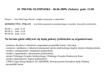 10 PIKNIK OLIMPIJSKI – 06.06.2009r (Sobota) godz. 12.00 Miejsce - teren Park Kępa Potocka (mapka sytuacyjna w załączniku) JEŹDZIECTWO - POKAZY – trzy bloki programowe przedstawiające wszystkie dyscypliny jeździeckie BLOK I - godz. 12.30 BLOK II - godz. 14.20 BLOK III – godz. 16.20 Na terenie gdzie odbywać się będą pokazy jeździeckie są organizowane: - konkursy dla dzieci i młodzieży (nagrodami przejażdżki konne i bryczką), - rozmowy i spotkania z ciekawymi postaciami sportu jeździeckiego między innymi olimpijczykami, - stoiska z czasopismami i książkami jeździeckimi, - stoiska z upominkami i akcesoriami jeździeckimi, - stoisko Polskiego Związku Jeździeckiego i Polskiego Związku Hodowców Koni, - stoiska organizatorów imprez jeździeckich: CWKS Legia Sekcja Skoków; KJ AROMER, Stowarzyszenie Szwadron Jazdy Polskiej - przejażdżki konne Godzinowy plan bloków: Program Zapowiedź bloku Blok I 12.20 Blok II 14.20 Blok III 16.20 Konkurs wiedzy o koniach 12.30 i jeździectwie Ujeżdżenie 12.45 14.30 16.30 14.45 16.45 Skoki 12.55 14.55 16.55 WKKW 13.10 15.10 17.10 Powożenie 13.20 15.20 17.20 Woltyżerka 13.35 15.35 17.35 Reining - western 13.50 15.50 17. 50 Szczegółowy plan bloku: Czas Program Prowadzący Miejsce Uwagi 10 minut 15 minut Zapowiedź bloku Jan Ratajczak Mariusz Krzemiński Mariusz Krzemiński Agata Ślepowrońska Estrada Główna 10 minut 15 minut 10 minut 15 minut 15 minut 20 minut Konkurs wiedzy o koniach i jeździectwie dla dzieci Okolice stanowiska spikera Ujeżdżenie - Kuc SHREK - Małgorzata Piszcz – KJ Aromer - Raimond Van’t Hooghof - Gabryjela Jaworska-Mazur CWKS Legia Skoki - Kuc Minutka - Natalia Stevnert KJ Aromer - DK- Srebrna - Andrzej Owczarek - KJ Aromer - DK – Grehound II – Jan Gawecki – KJ Aromer - DK - Elvis - Anna Sobańska KJ Agmaja WKKW - ??????????? – SKJ Trawers Warszawa Jan Ratajczak Mariusz Krzemiński Czworobok Jan Ratajczak + Mariusz Krzemiński Parkur Jan Ratajczak + Mariusz Krzemiński Barbara Niemczewska Parkur Powożenie Inters , Gal - Marek Zylm -pojazd pokazowy Lando - Kaukan i Zampano - Ireneusz Kozłowski pojazd terenowy Jan Ratajczak + Ireneusz Kozłowski Woltyżerka PGR Bródno – Kamieniec - Jan Ratajczak + K. Woltyżerki Reining Krzysztof Gutowski Czworobok + Parkur Czworobok Czworobok + parkur Dla zwycięzców bilety na przejażdżkę maratonówką , pamiątki olimpijskie Przedstawienie dyscypliny olimpijskiej Omówienie pokazu Sukcesy polskich ujeżdżeniowców Przedstawienie dyscypliny olimpijskiej. Omówienie pokazu – przeszkody rodzaje Skok na wysokość (trampolinka) Sukcesy polskich skoczków Przedstawienie dyscypliny olimpijskiej Omówienie zasad rozgrywania zawodów Zademonstrowanie skoków przez przeszkody terenowe – stroje krosowe Sukcesy polskiego wkkw Przedstawienie dyscypliny. Omówienie zasad rozgrywania zawodów Zademonstrowanie Marek elementy ujeżdżenia i elementy zręczności powożenia Irek Kozłowski – elementy przeszkody krosowej Sukcesy polskiego powożenia Przedstawienie dyscypliny. Omówienie zasad rozgrywania zawodów Zademonstrowanie ćwiczeń obowiązkowych +indywidualnych i grupowych Sukcesy polskiej woltyżerki Przedstawienie dyscypliny. Wjazd –parada (podkład muzyczny country) Przejazdy kolejne zawodników – reining